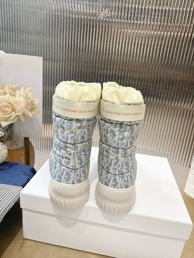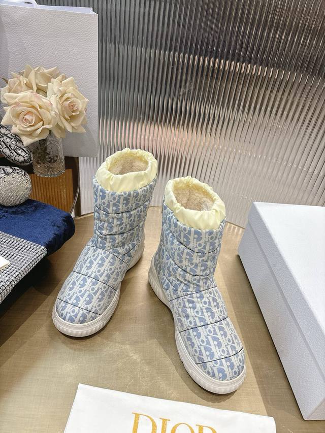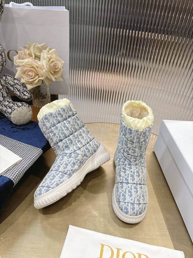 Di*Or 2025 Fall/Winter New Frost Ankle Boots/Snow Boots. Incorporating haute couture style, these boots offer a fresh take on skiing looks. The black quilted nylon upper is adorned with a cannage pattern, paired with a matching shearling lining. A drawstring allows for adjustable fit. The heel features a gold " Christian Dior Paris" logo, and the Eva platform sole provides exceptional comfort. Outsole: Eva foam outsole; Upper: Embroidered nylon; Lining: Lambswool; Sizes: 35-41; Sizes 40-41 (Custom Made).