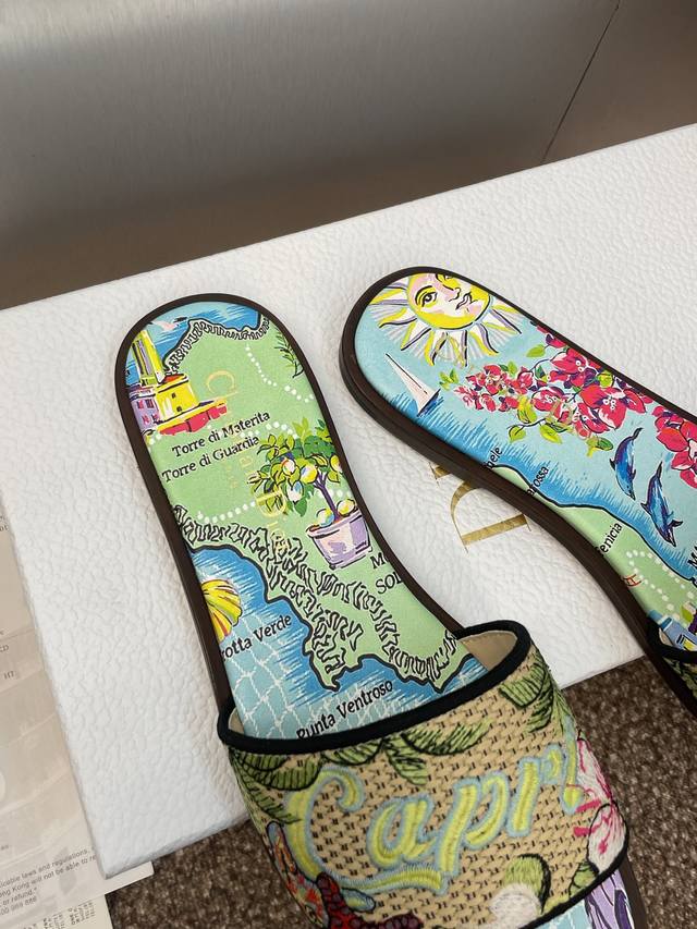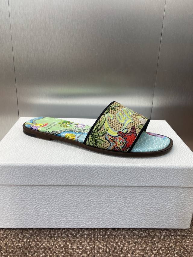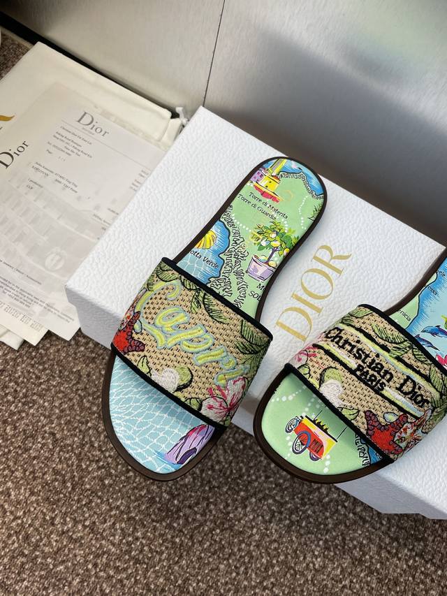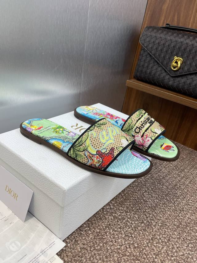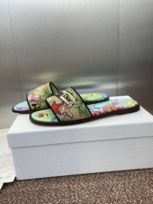 Dior 2025 Spring/Summer new Dway flat flip flops in jelly colors for women, featuring a three-dimensional embroidered CD logo, round-toed, open-toed, color-blocked sandals. Materials: Upper: imported raffia straw, electro-embroidered, high-temperature, water-soluble cotton fabric, water-dyed sheepskin lining, and Italian thickened leather outsole. Sizes: 34-42. 34, 40, 41, 42. Custom-made, no returns or exchanges.