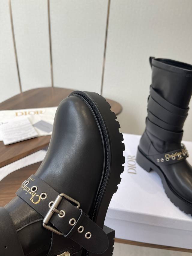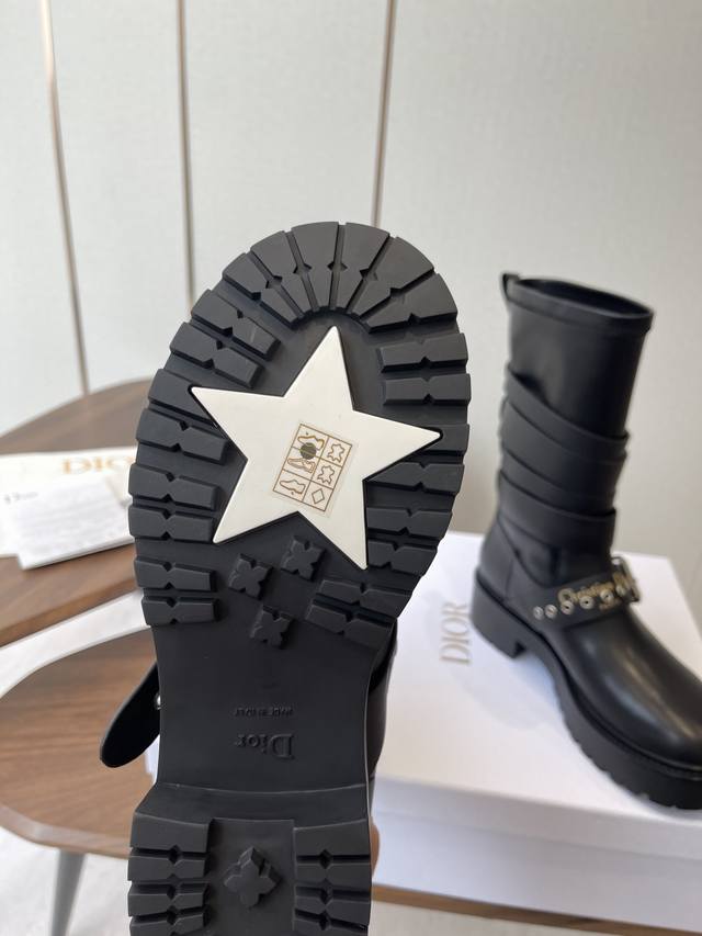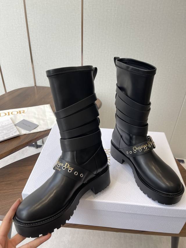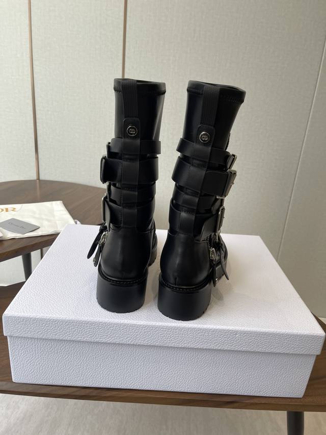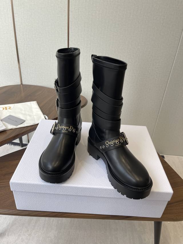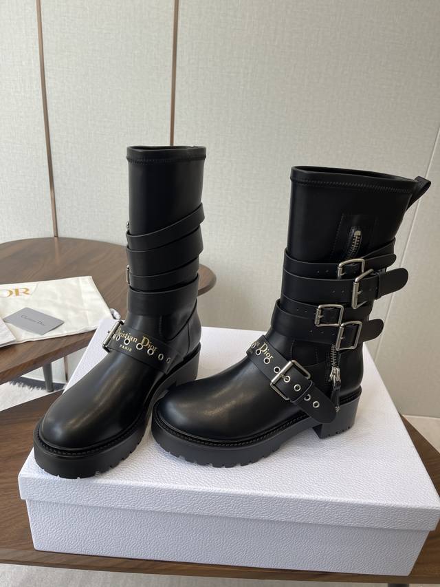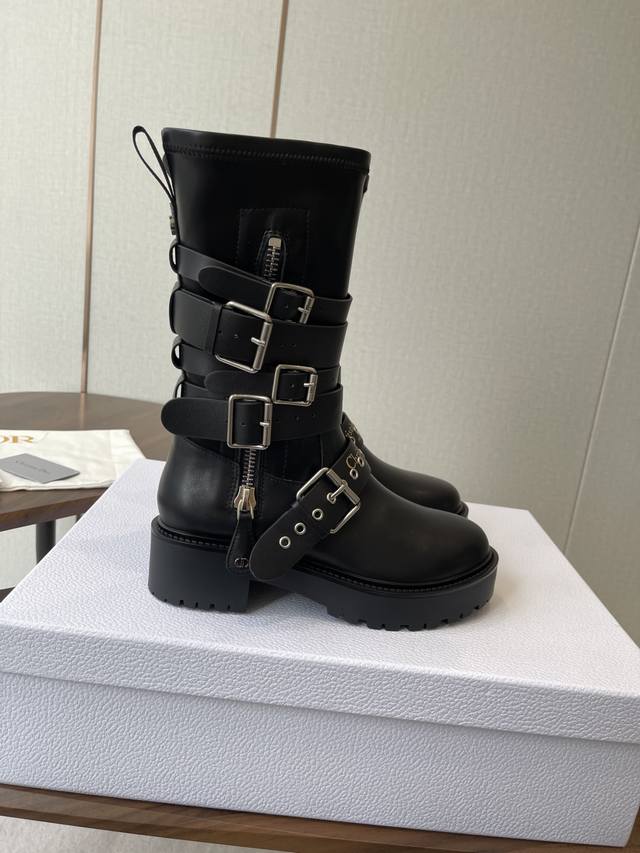 Dior 25 New Mid-Length Boots/High Boots/Brogue Boots. A new addition to the Dior 25 Early Spring Ready-to-Wear Collection, showcasing haute couture glamour. Features a black rubber-effect calfskin barrel design, accented with silver zipper details on the sides for added sophistication. A thick yet lightweight notched sole completes the look, adding a touch of glamour to this season's casual style. Calfskin upper, calfskin lining, heel height: 4.5cm, original mold TPU outsole. Sizes: 35-41 (40 & 41 are custom-made and non-refundable).