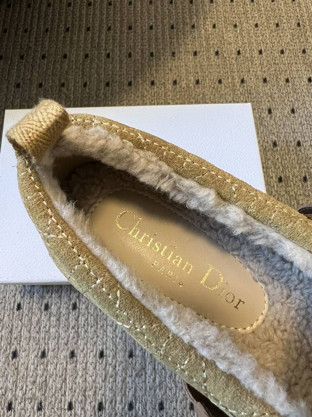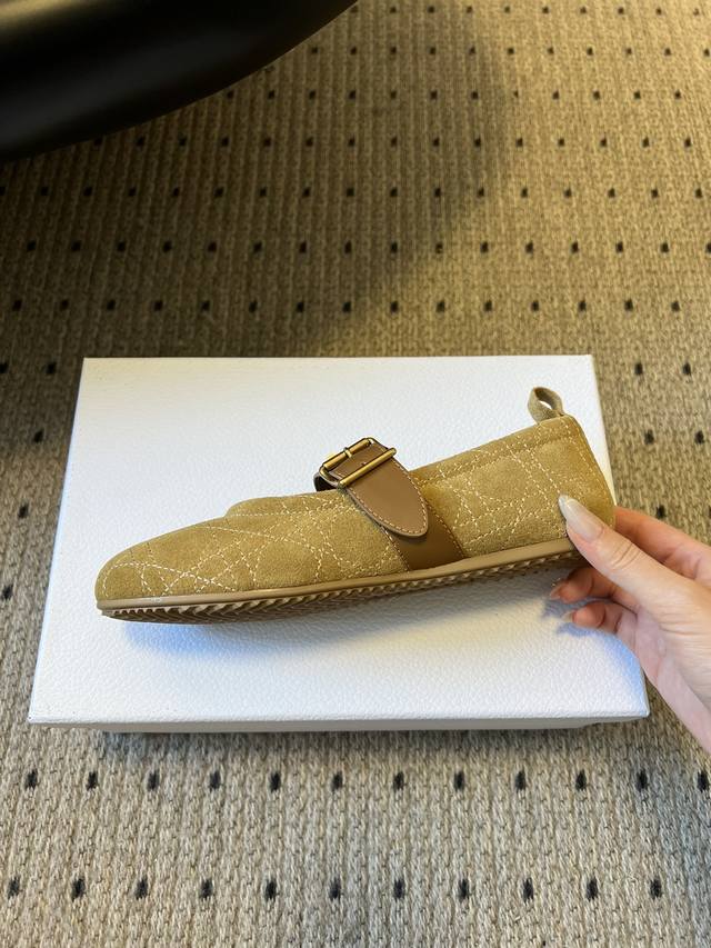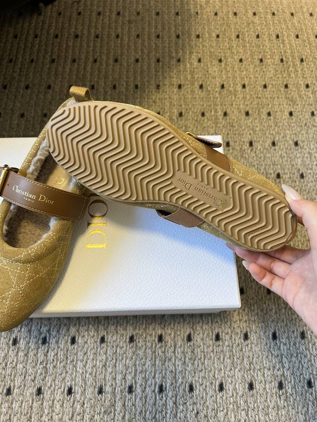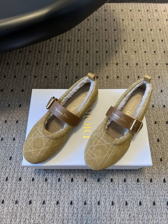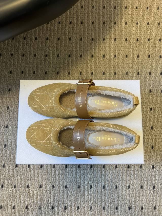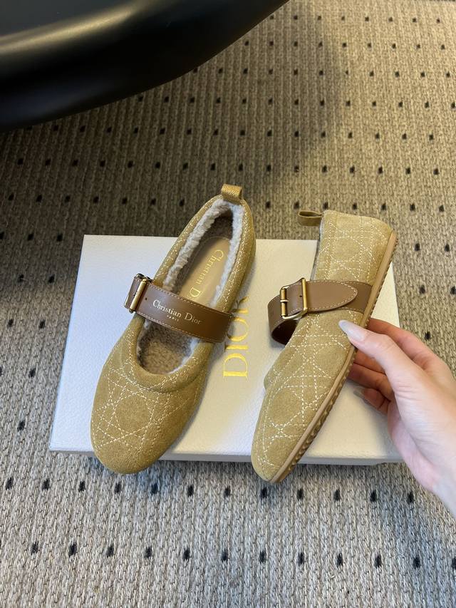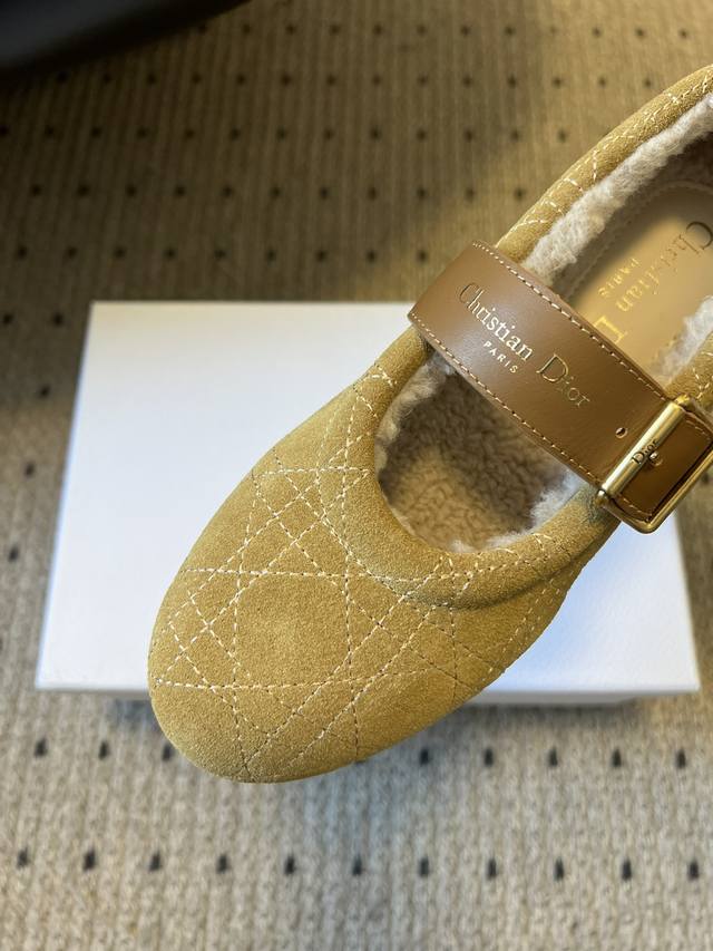 Dior 25Ss Elegant Fleece-Lined Mary Jane Flats (Retail Purchase Item) DDD The shoes feature a plush lining for warmth and a soft feel, making them a comfortable choice for autumn and winter. The round toe and flat sole fit snugly without being too tight. The understated color scheme is versatile; pair them with a sweater and skirt for a gentle autumn/winter look, or with a coat and jeans for a relaxed work style, suitable for everyday outings, light office occasions, etc. DDD The upper is made of suede with the brand's signature diamond quilting, giving it a soft and sophisticated feel. The strap is printed with "Christian Dior" and decorated with a metal buckle, enhancing brand recognition and adding a touch of refinement. DDD Upper: Cow suede DDD Lining: Wool DDD Outsole: Original molded outsole DDD Height increase: 2.5cm DDD Size: 35-41, size 40 is custom-made and non-refundable DDD