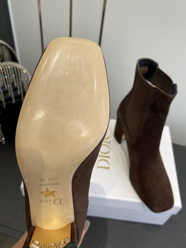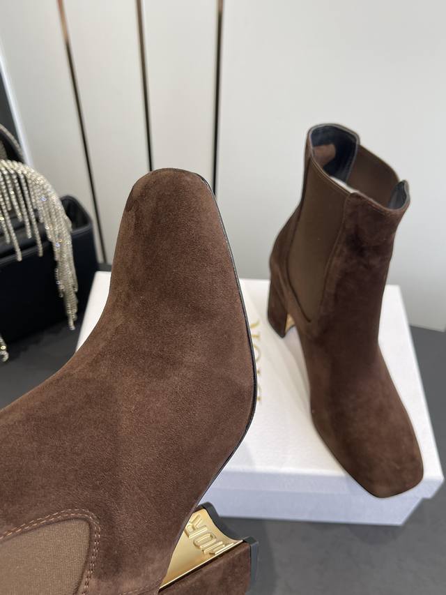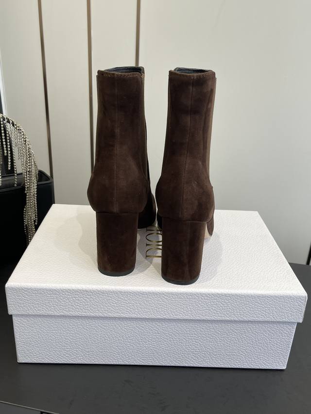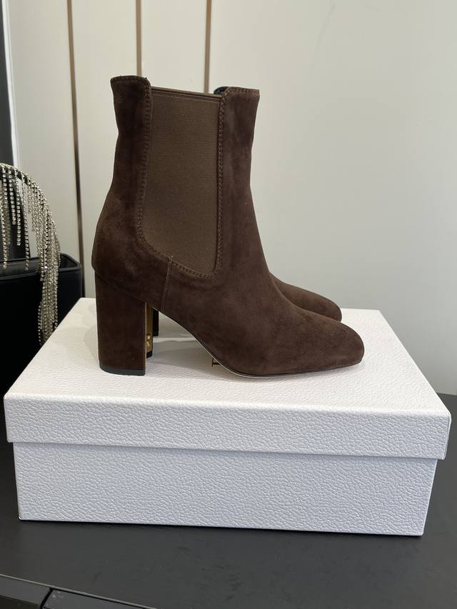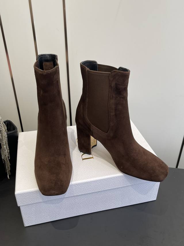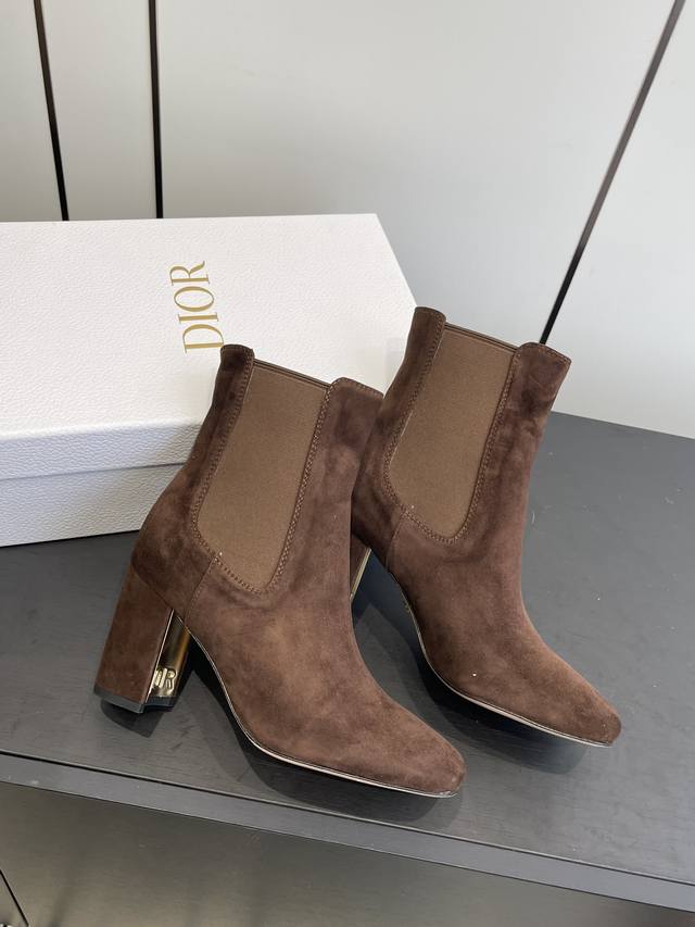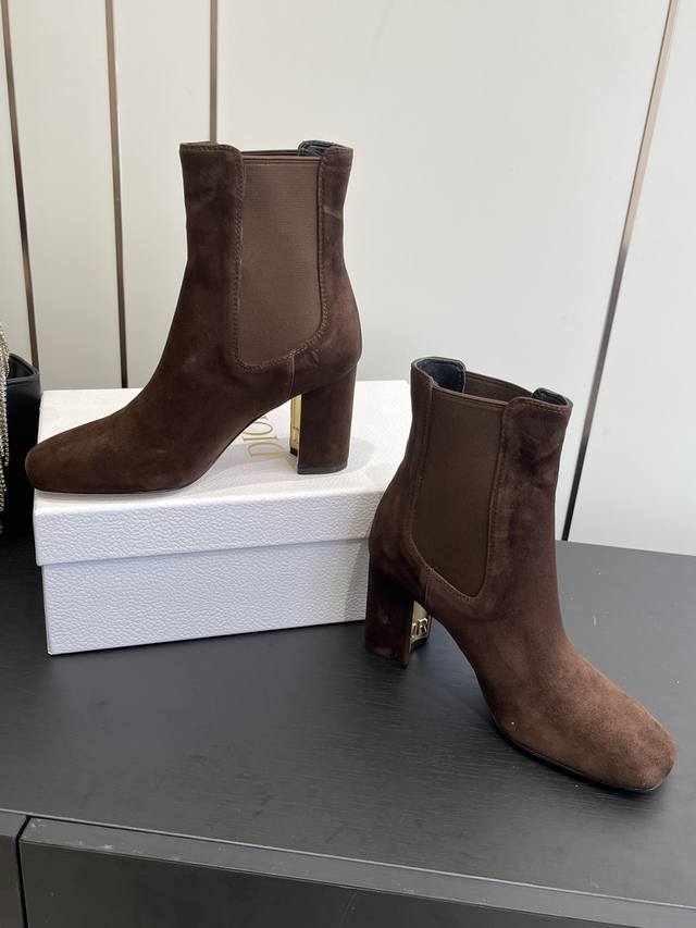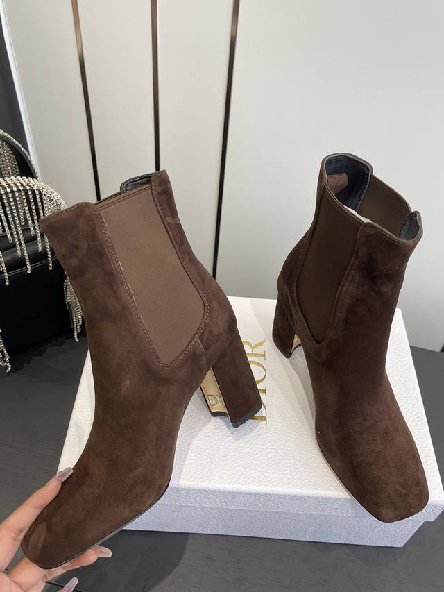 Dior Autumn/Winter New Chunky Heel Ankle Boots. These D-Shadow high-heeled slip-on boots feature a double-layer elastic waistband, an 8cm heel, a cylindrical heel, and signature Dior heel detailing, showcasing a fashionable and elegant charm. Made with mixed sheepskin upper, sheepskin lining, and imported genuine leather outsole. Sizes: 35-41, 40-41 (custom orders accepted).