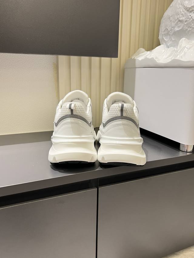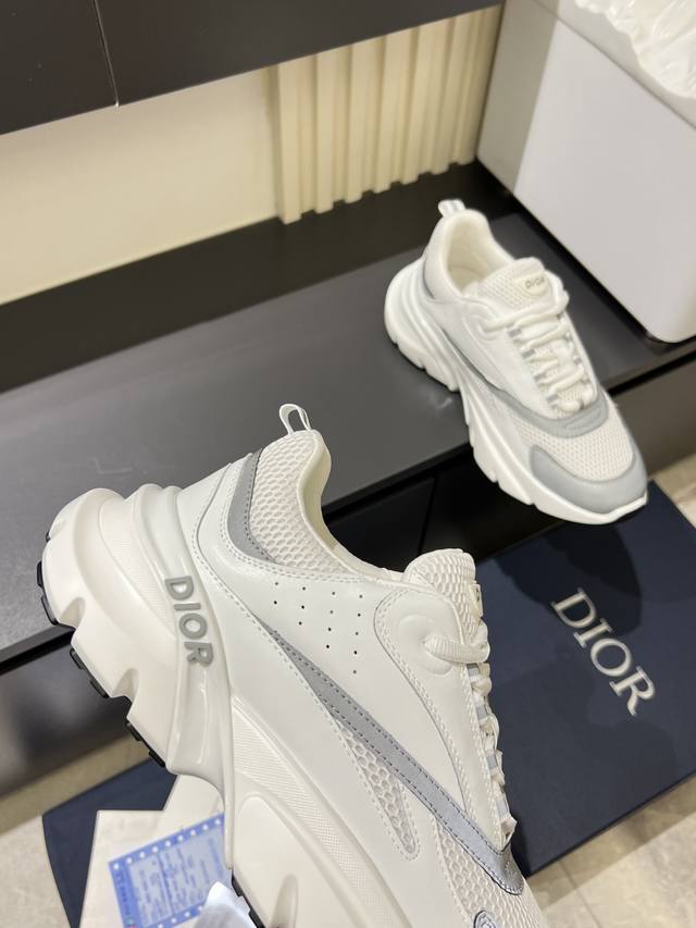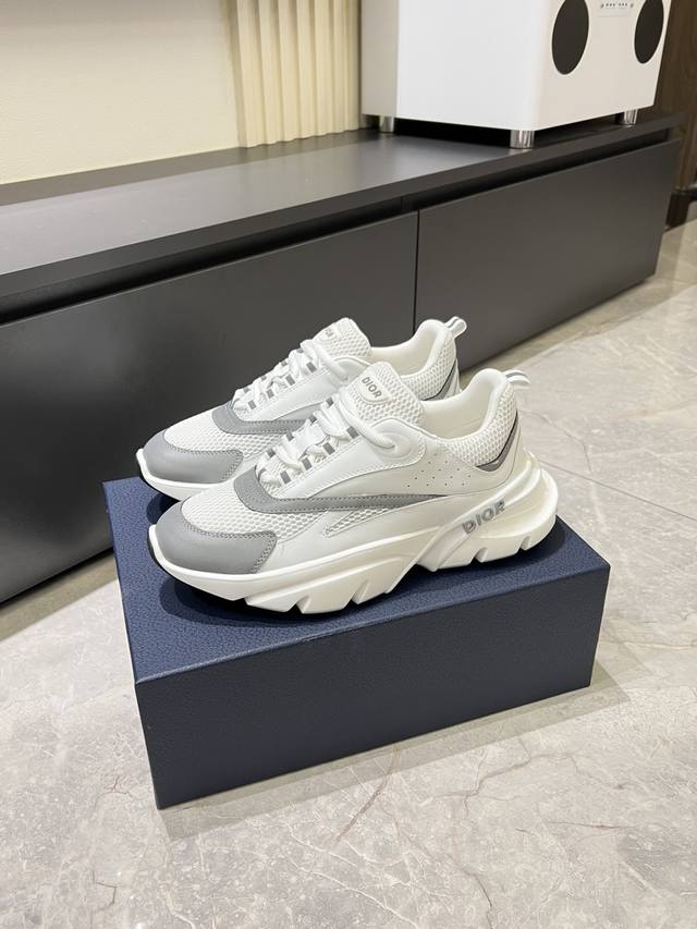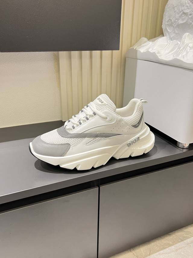 Dior B22 Retro Running Shoes, inspired by classic running shoes, featuring a low-top, platform design, and a combination of cowhide leather and mesh fabric for excellent texture and breathability. The black and white embossed rubber outsole provides great grip and comfort, perfect for everyday wear or sports! The side features an embossed "Cd" logo, subtle yet recognizable. Available in a variety of colors, including black, white, and gray-blue, these shoes are versatile and stylish, loved by the Western hip-hop scene and bloggers