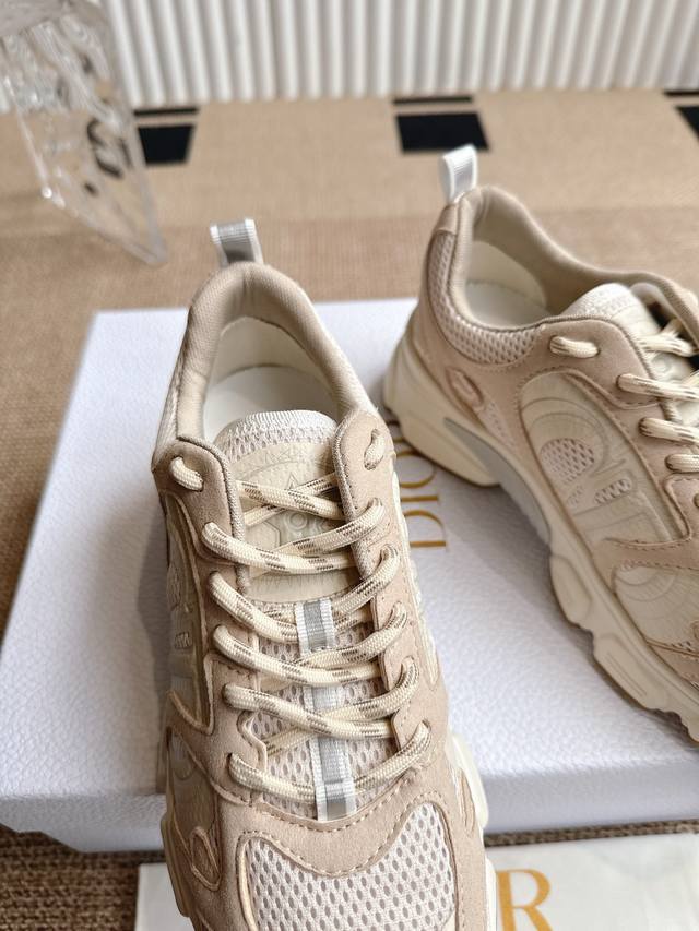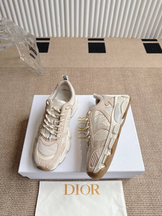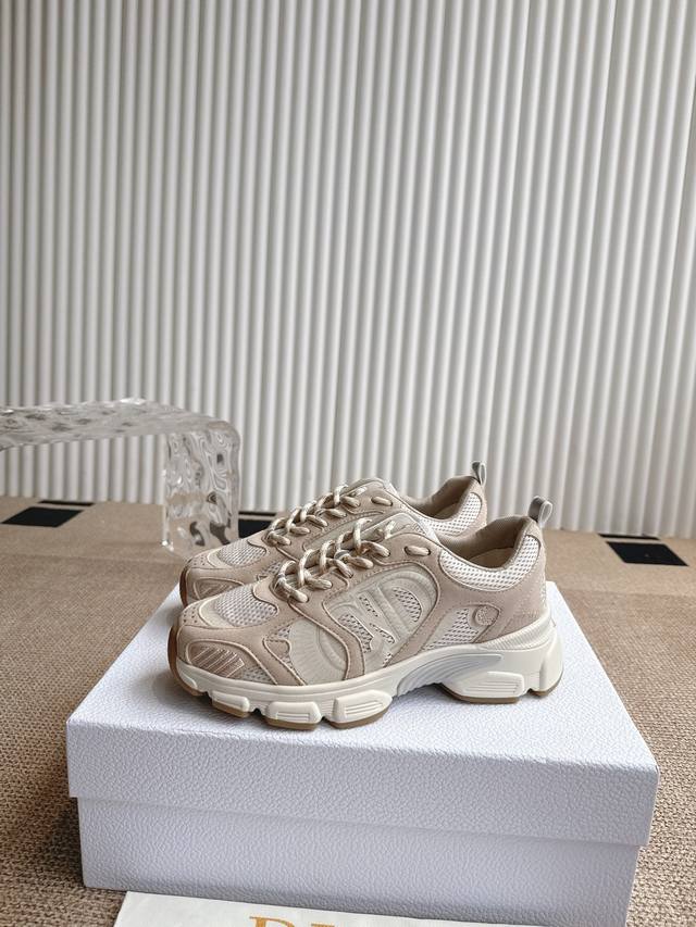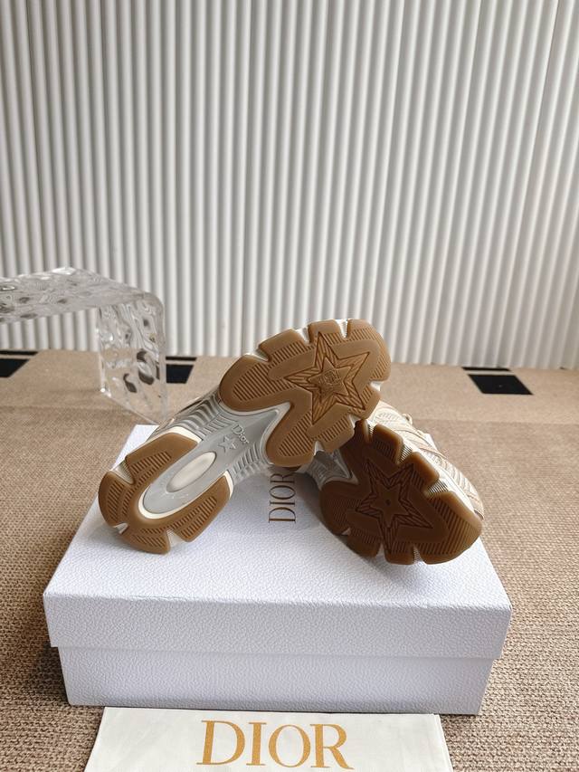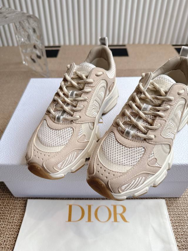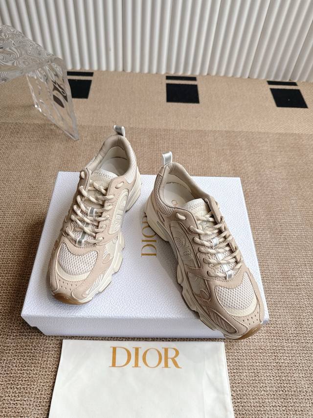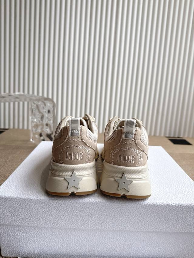 The Dior Vibe sneaker is a reimagining of the classic running shoe, embodying Dior's couture spirit. White mesh is embellished with an Oblique print, paired with gold and silver-toned laminated leather-effect panels for a stylish, contrasting look. It's further enhanced with classic details like 3D-effect detailing, a Lucky Star symbol at the rear, and the logo on the tongue and rear pull tab. The lightweight sole is adorned with grey stars, complementing a variety of casual or elegant pieces for a modern look.