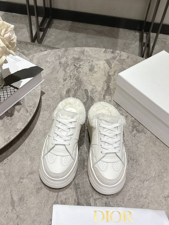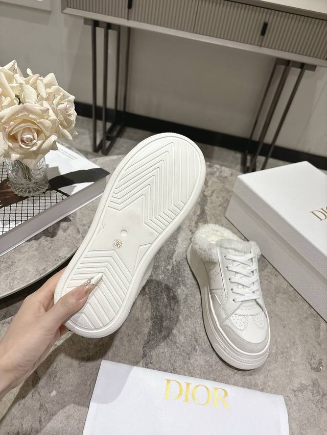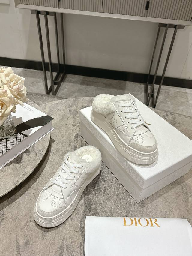 Dior Fall/Winter 2025 Cd Platform Casual Sneakers, White Sneakers, Half-Slippers with Furry Finish! Made with suede and smooth white cowhide leather, these sneakers feature a gold and silver five-pointed star logo on the side. Various distinctive details on the tongue, sole, and heel enhance their style, while perforations, stitching, and rubber inlays accentuate their sporty charm. They can be paired with various outfits for a sophisticated look. The upper is made of original custom calfskin, with a wool lining. The original molded LP outsole is ultra-lightweight and comfortable to wear. Sole thickness: approx. 5.5cm. Sizes: 35-39, 40.41. Made to order, no returns or exchanges. Comes with original packaging.