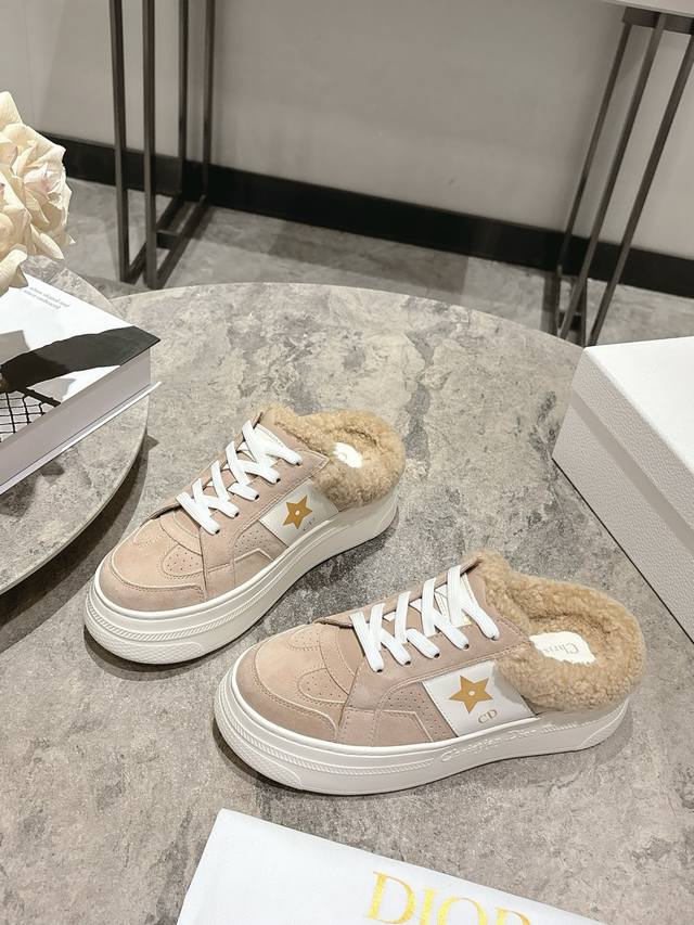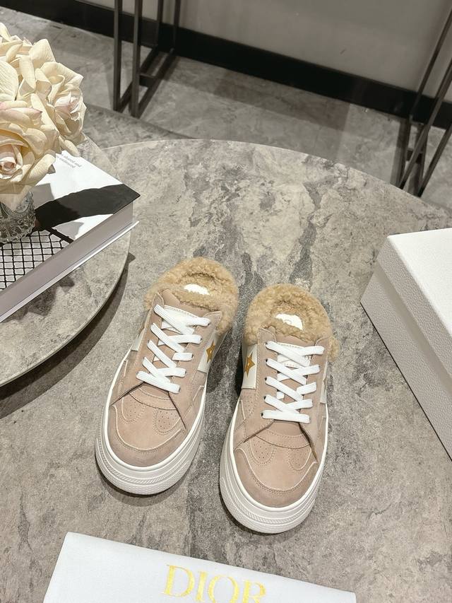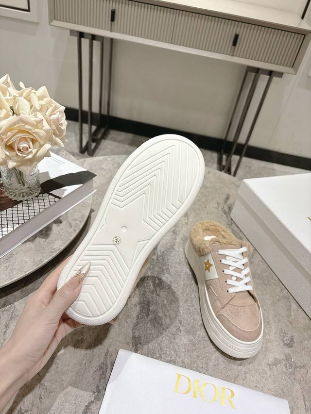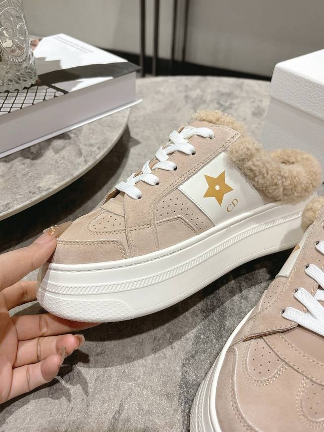 Dior Fall/Winter 2025 Cd Platform Casual Sneakers, White Sneakers, Half-Slippers with Furry Finish! Made with suede and smooth white cowhide leather, these sneakers feature a gold and silver five-pointed star logo on the side. Various distinctive details on the tongue, sole, and heel enhance their style, while perforations, stitching, and rubber inlays accentuate their sporty charm. They can be paired with various outfits for a sophisticated look. The upper is made of original custom calfskin, with a wool lining. The original molded LP outsole is ultra-lightweight and comfortable to wear. Sole thickness: approx. 5.5cm. Sizes: 35-39, 40.41. Made to order, no returns or exchanges. Comes with original packaging.