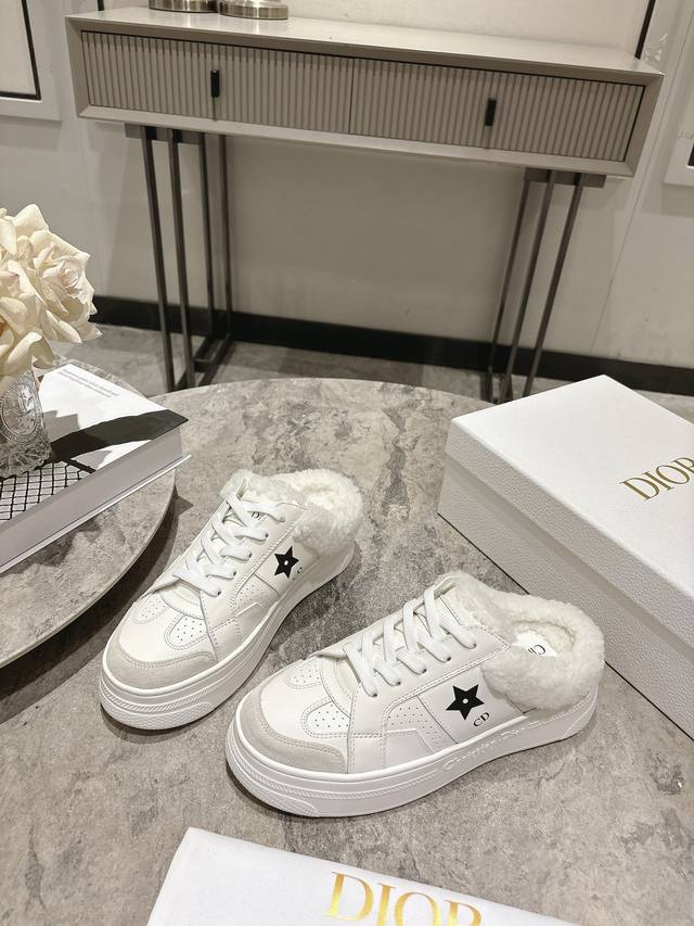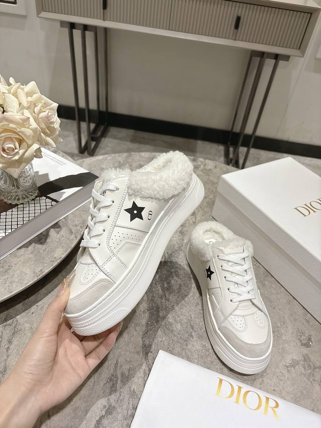 Dior Fall/Winter 2025 Cd Platform Casual Sneakers, White Sneakers, Half-Slippers with Furry Finish! Made with suede and smooth white cowhide leather, these sneakers feature a gold and silver five-pointed star logo on the side. Various distinctive details on the tongue, sole, and heel enhance their style, while perforations, stitching, and rubber inlays accentuate their sporty charm. They can be paired with various outfits for a sophisticated look. The upper is made of original custom calfskin, with a wool lining. The original molded LP outsole is ultra-lightweight and comfortable to wear. Sole thickness: approx. 5.5cm. Sizes: 35-39, 40.41. Made to order, no returns or exchanges. Comes with original packaging.