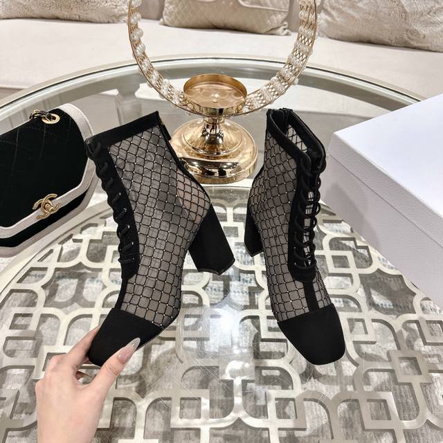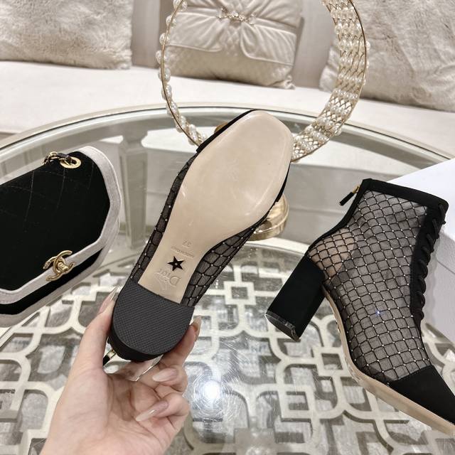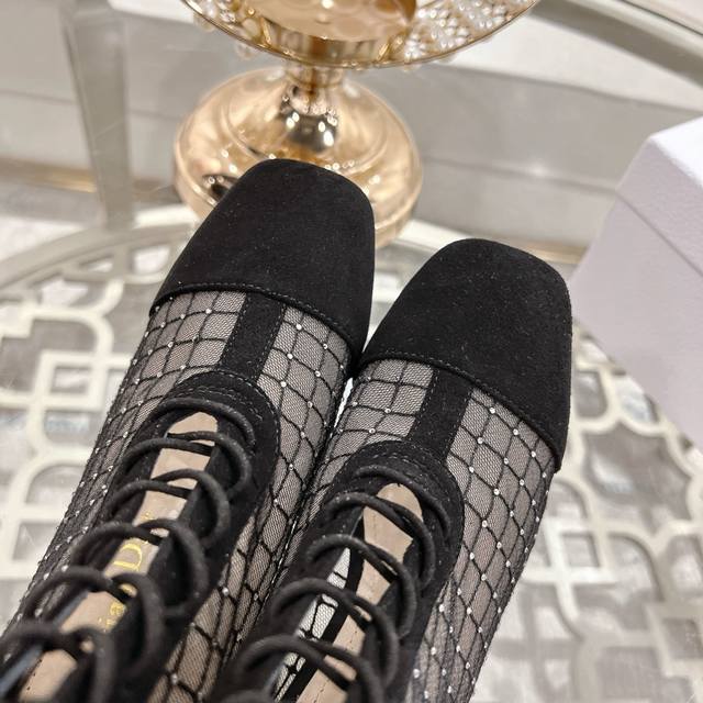 Dior Jacquard Rhinestone Mesh Boots, Dior 2025 Spring/Summer Newest Color Jardin D'Hiver Jacquard Embroidered Logo High-Heeled Color Block Women's Shoes, Top-Tier High-End Version. Upper: High-temperature water-soluble electro-embroidery rhinestone technology + suede. Lining: Sheepskin lining. Outsole: Italian genuine leather outsole. Insole: Imported sheepskin. Heel Height: 7.5cm. Sizes: Standard sizes 34-41. Custom orders are non-refundable. Factory Price: [Price not provided]