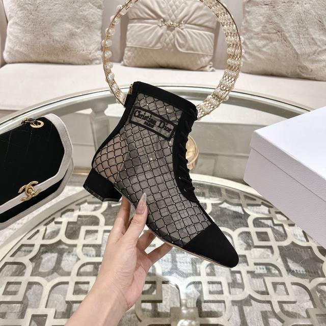 Dior Jacquard Rhinestone Mesh Boots, Dior 2025 Spring/Summer Newest Color Jardin D'Hiver Jacquard Embroidered Logo High-Heeled Color Block Women's Shoes, Top-Tier High-End Version. Upper: High-temperature water-soluble electro-embroidery rhinestone technology + suede. Lining: Sheepskin lining. Outsole: Italian genuine leather outsole. Insole: Imported sheepskin. Heel Height: 3.5cm. Sizes: Standard sizes 34-41 (34, 40, 41 are custom-made and non-refundable). Factory Price: [Price not specified]