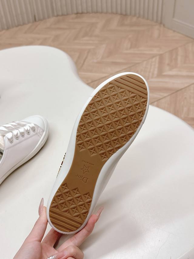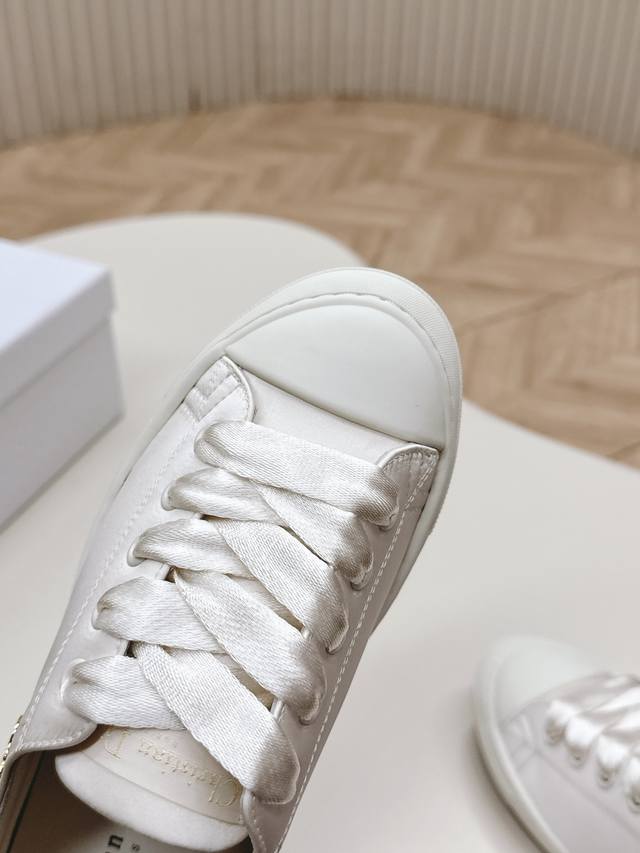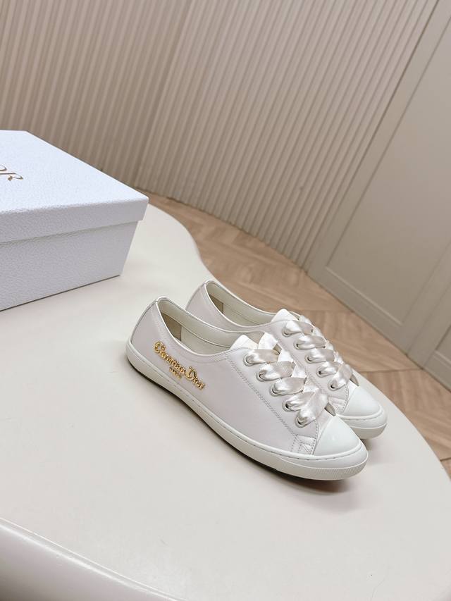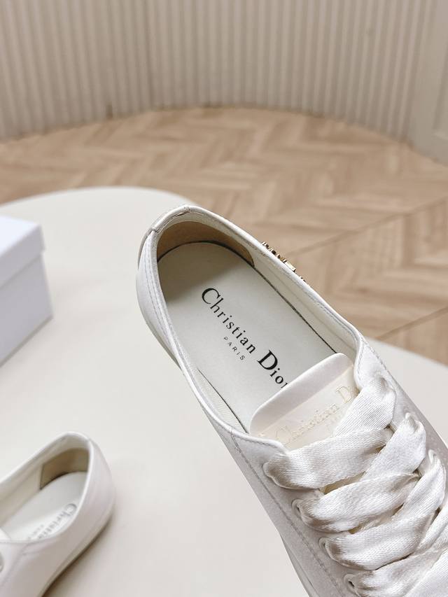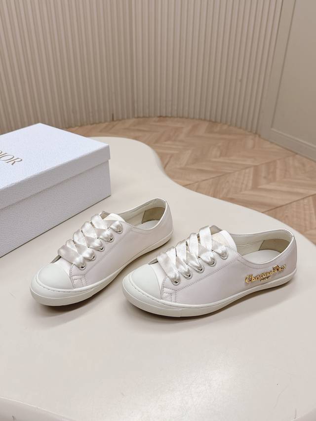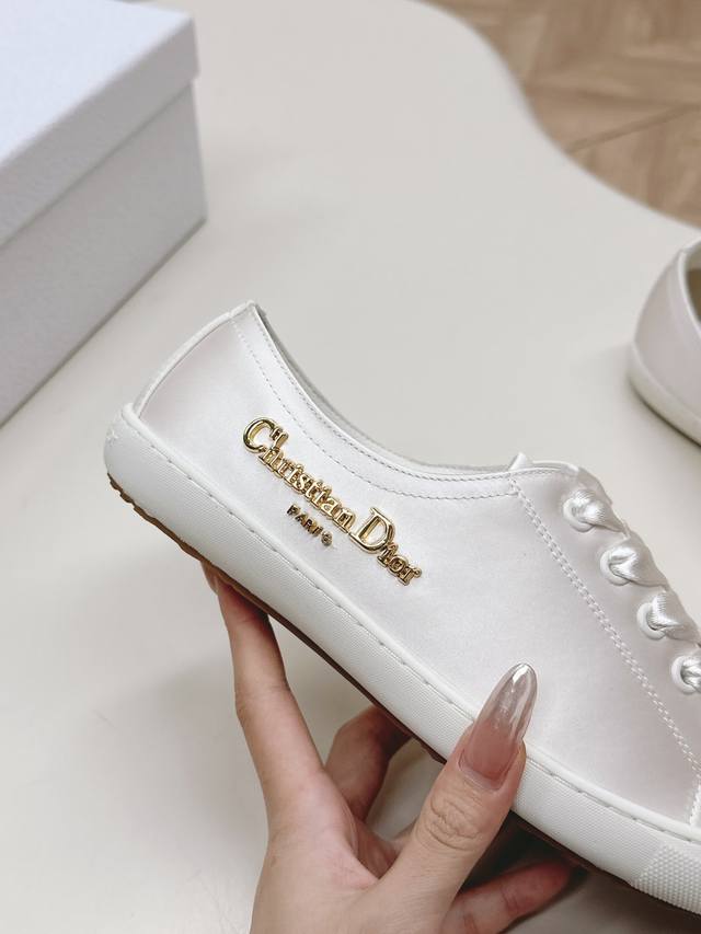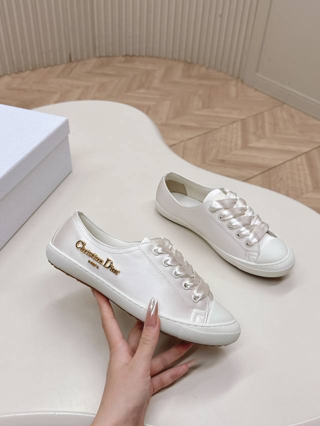 Dior Lucky Satin Casual Sneakers. Dior designers really understand girls' needs in summer! This new Lucky thin-soled shoe is as cute as its name suggests. The thin sole and low-cut design make the whole shoe very light and comfortable. The satin material is paired with wide satin laces in the same color. It looks stunning in the sunlight! The soft upper feels like walking on clouds. It goes perfectly with socks, skirts, or pants. It's breezy and effortlessly elegant. Small and luxurious. Available in Baby White, Cherry Blossom Pink, Misty Blue, and Mysterious Black. The colors are fresh and versatile. Original material. Sizes 35-40.