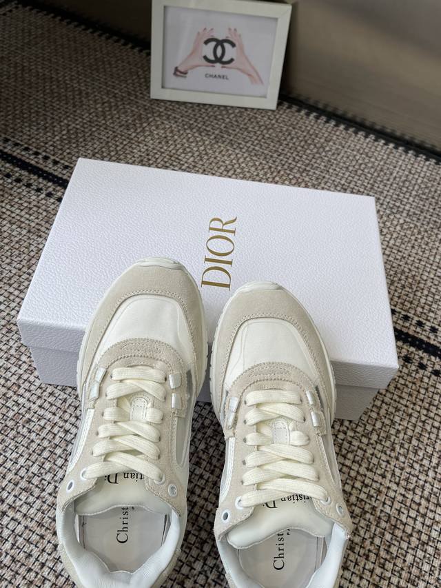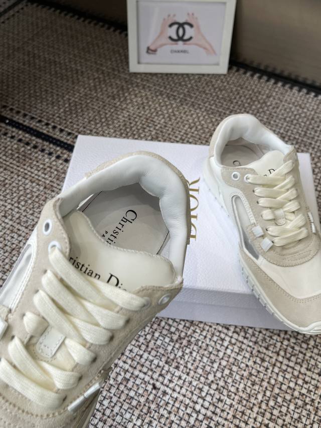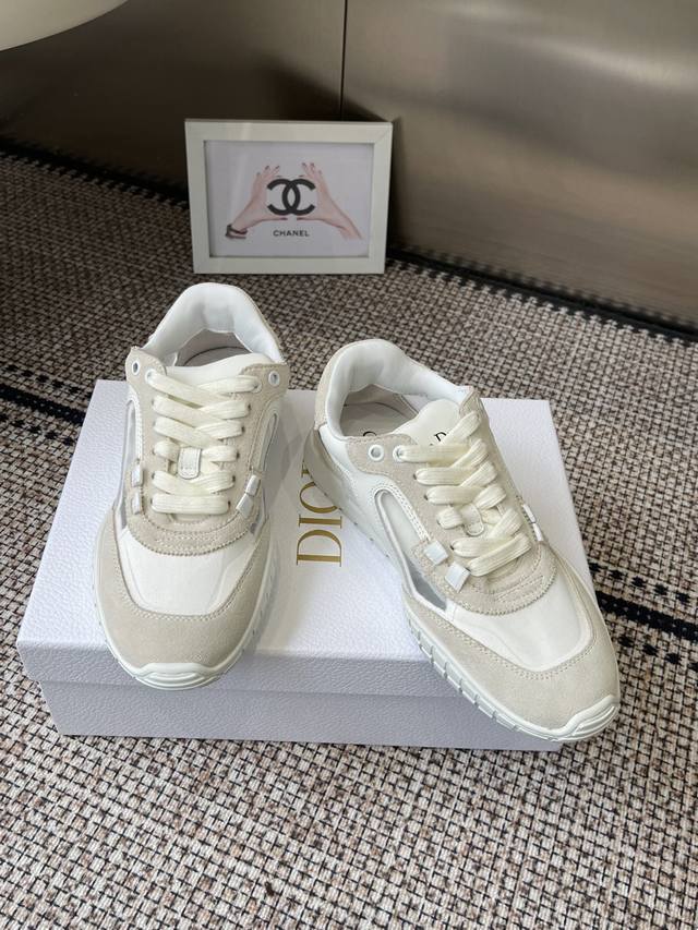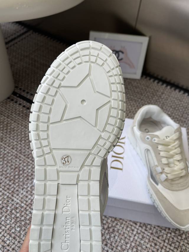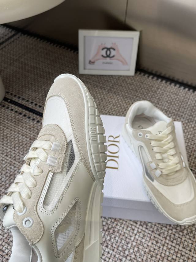 Dior Spring/Summer 2026 New Tech Sneakers (Training Shoes) The Dior Tech sneakers feature stylish details showcasing a retro aesthetic. The white suede cowhide upper is paired with transparent mesh side panels. The heel and tongue are adorned with the Christian Dior Paris logo. The textured brown Dior logo sole adds a haute couture touch. Suede and mesh upper, sheepskin lining, original TPU outsole. Sizes: 35-44 (Women's 40, Men's 45, custom made).