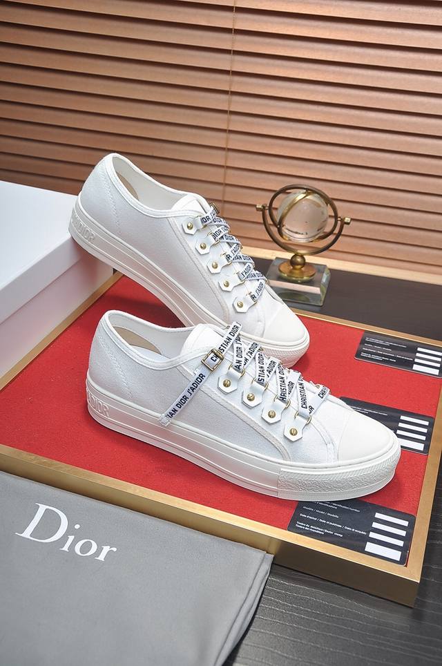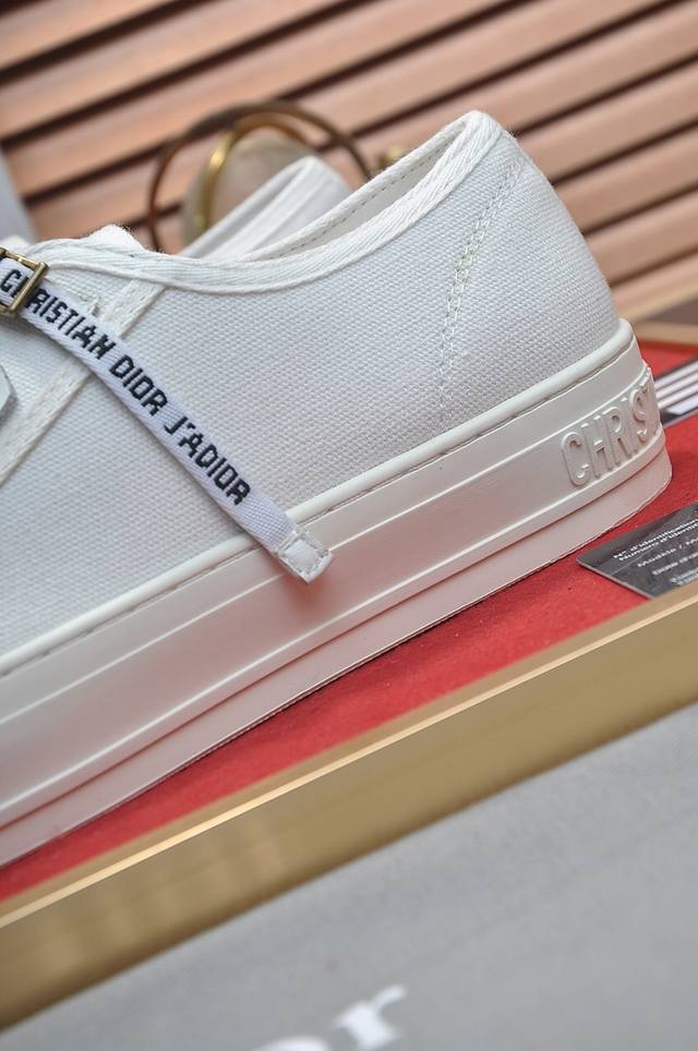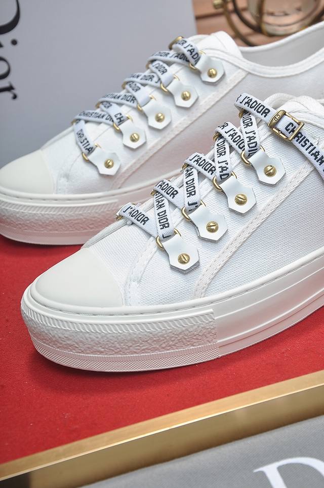 Dior Walk 'N'Dior embroidered cotton couple's casual shoes feature a sturdy texture, a white rubber sole, and a pure cotton embroidered upper for a stylish look. The tongue and laces are embellished with the Christian Dior logo. Lined in suede and lined with cowhide. Available in sizes 35-40 for women and 38-44 for men.