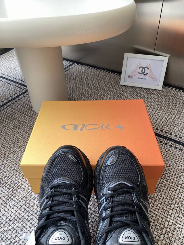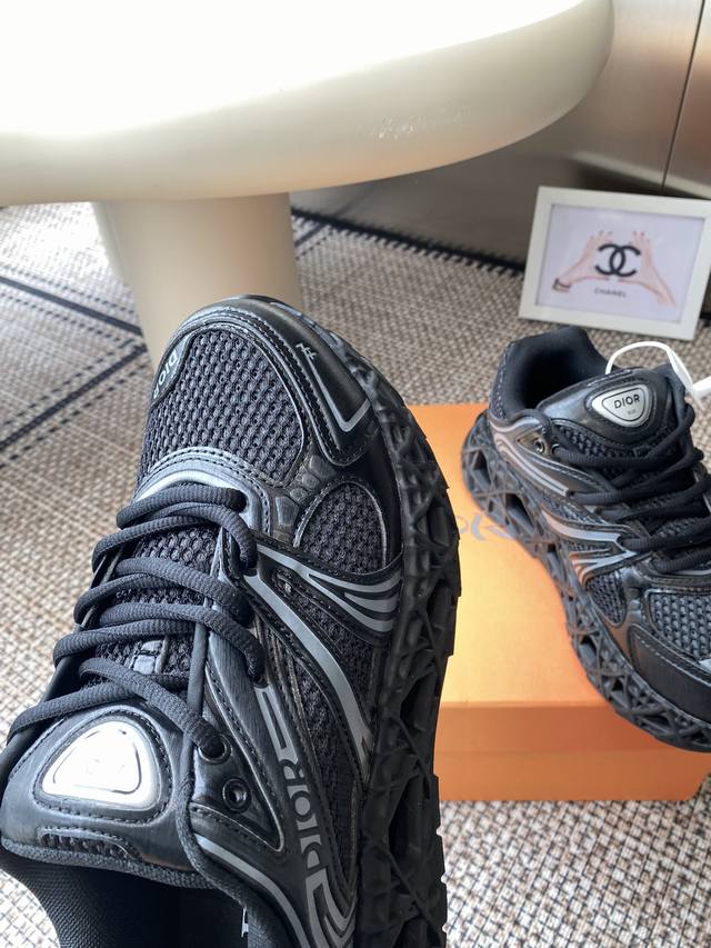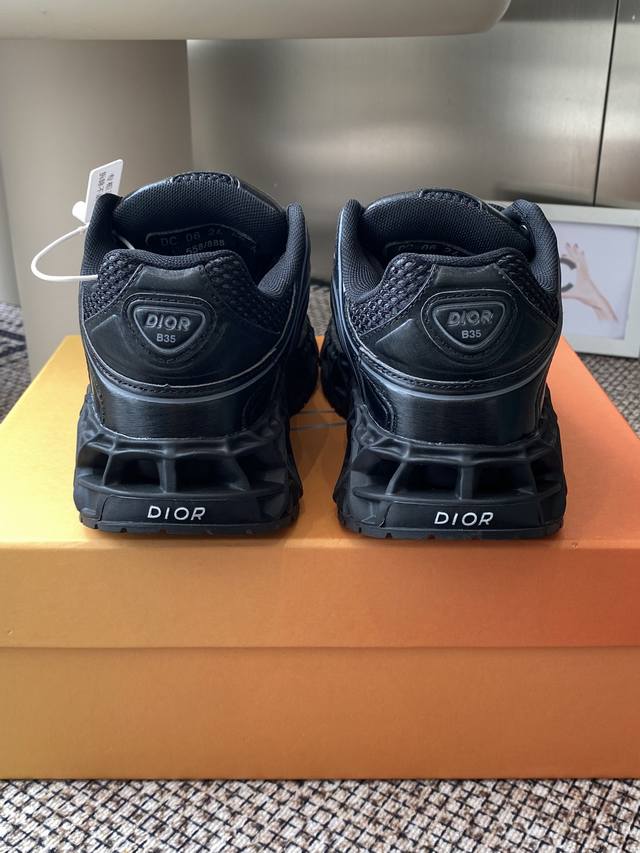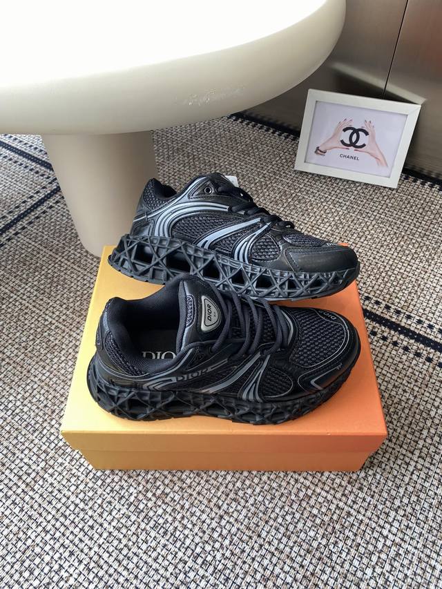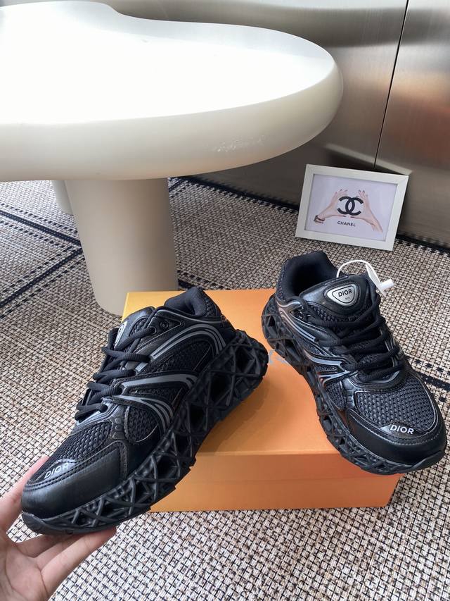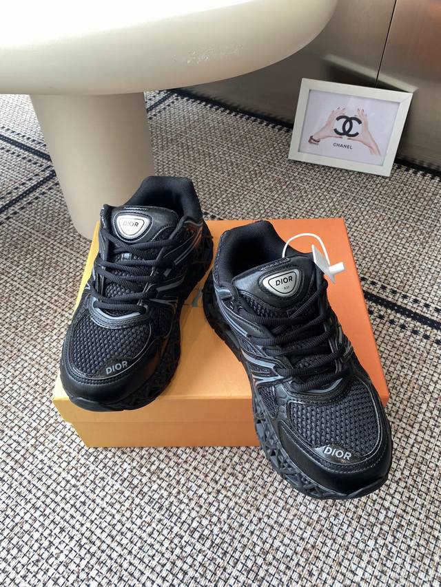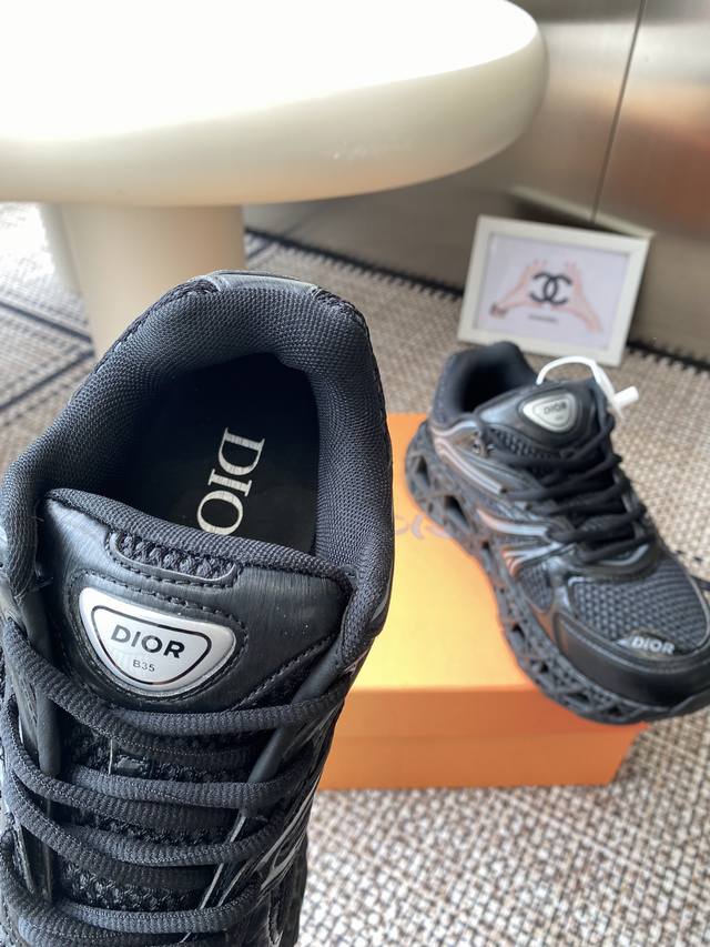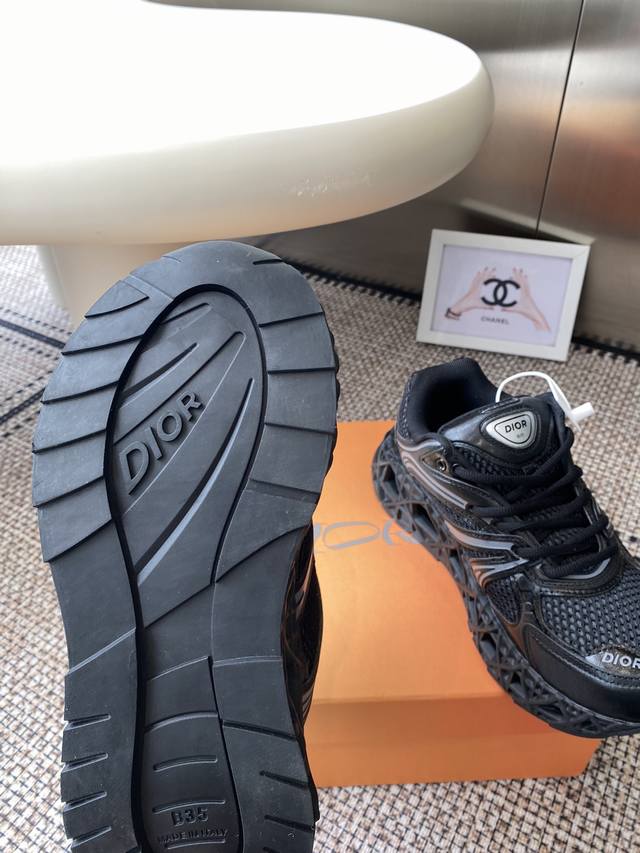 Dior X Kaws B35 capsule couple's collection hollow mesh sneakers. Called the B35 Nxt, this new sneaker utilizes 3D printing technology to create a hollow sole. The upper features a dad-shoe design that perfectly aligns with current aesthetics. The mesh stitching and smooth lines seamlessly blend a retro, millennial feel with a modern, technological aesthetic, offering exceptional compatibility across diverse styles. This new shoe, combining cutting-edge technology with a retro aesthetic, features a custom, imported mesh upper and a custom, imported breathable mesh lining. The outsole is made of an original mold and is made of non-slip rubber. The sole is 6cm thick. Sizes: 35-44.