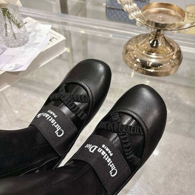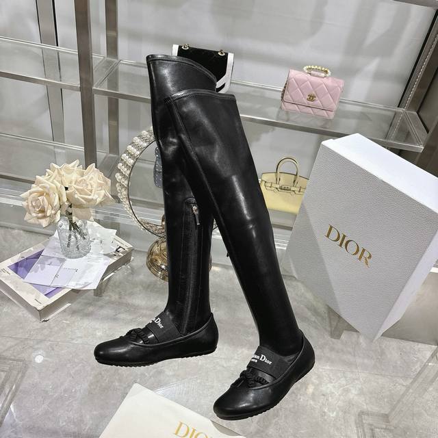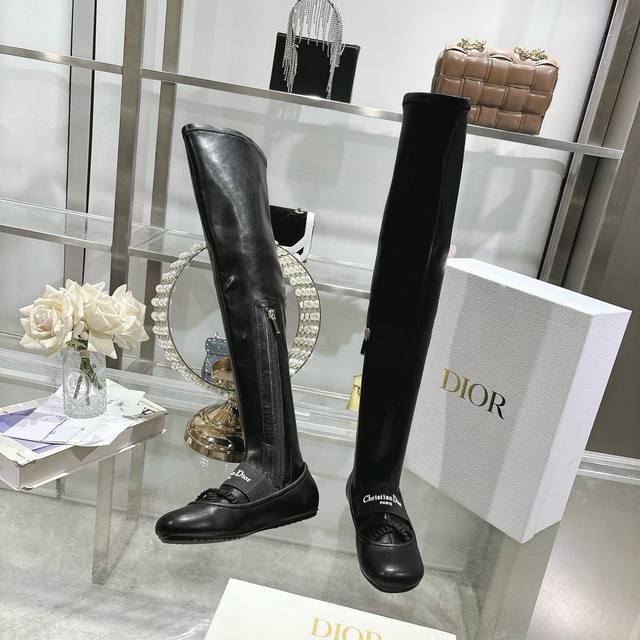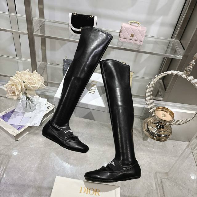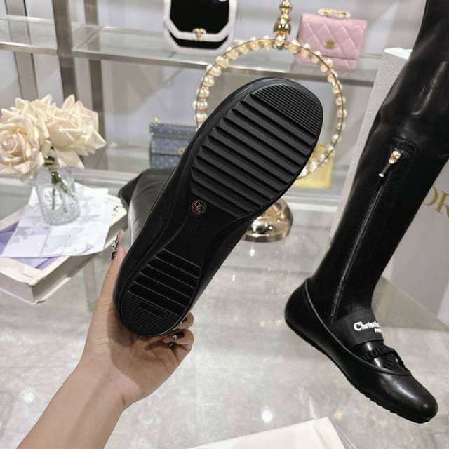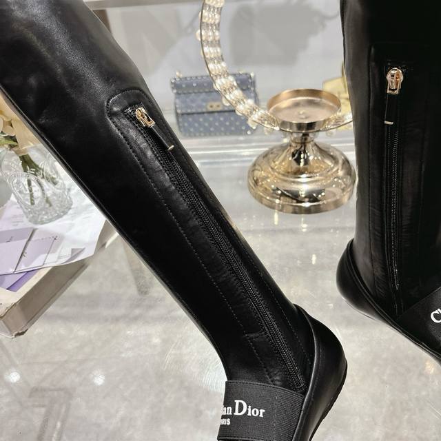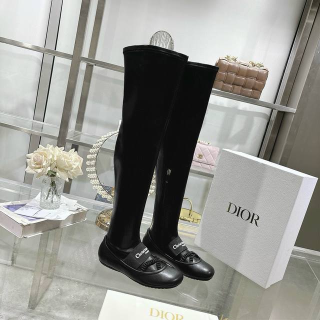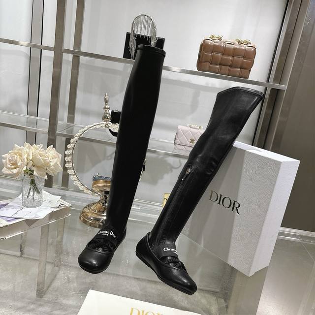 Factory Dior 25 autumn and winter new punk style flat rubber stretch high-top knight women's boots. Celebrity embroidered letter logo. Inside zipper design, easy to wear and comfortable. 22-inch length. Material: Upper imported stretch microfiber spliced sheepskin + water-dyed sheepskin lining + non-slip rubber outsole. Size: 34-41. 34, 40, 41. Custom made. No returns or exchanges.