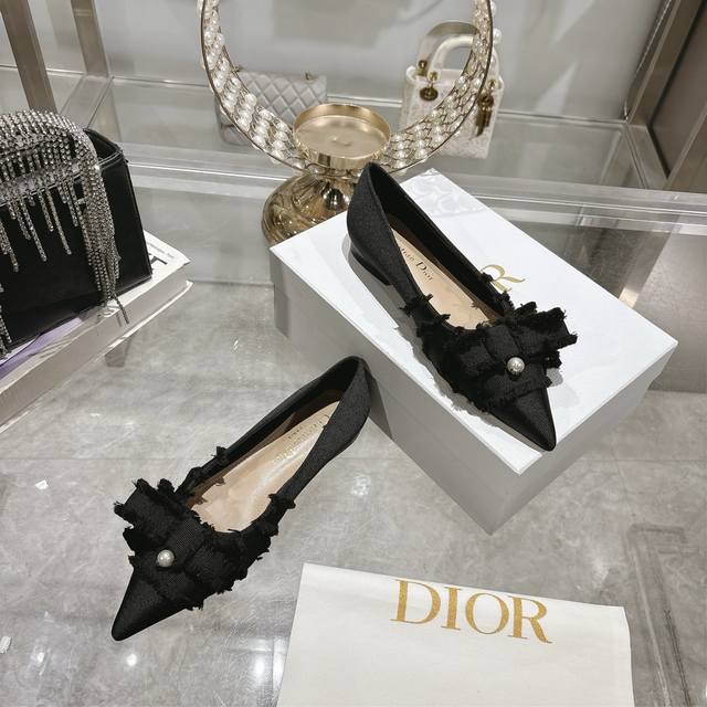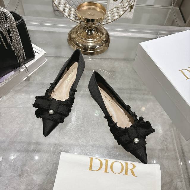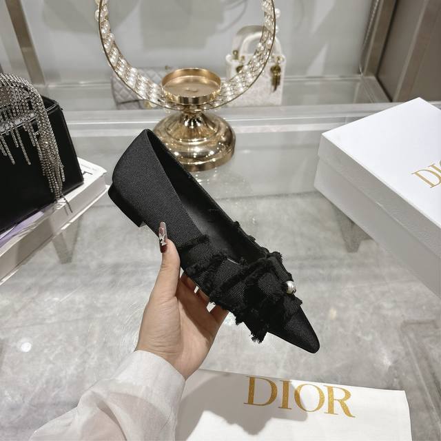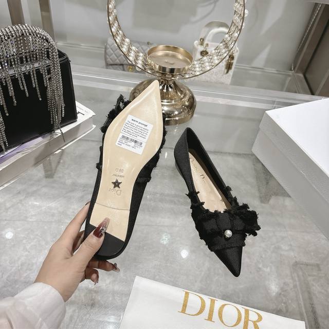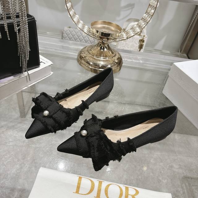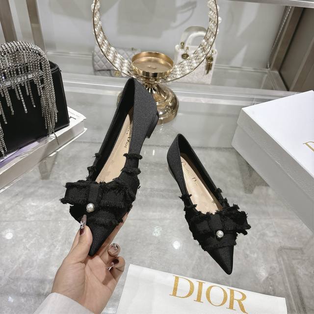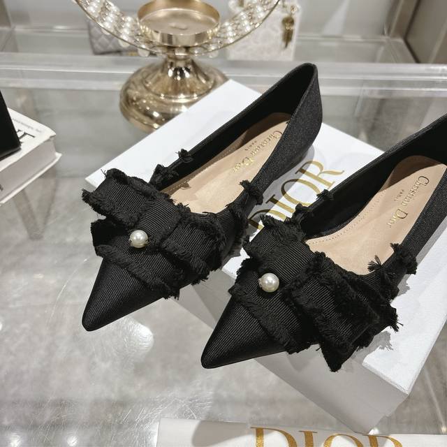 Factory direct tassel webbing women's shoes, Dior Autumn runway new style, Adiorble women's shoes, Cd celebrity style, fashionable tassel bow pointed toe flat sandals with pearl letter logo hardware buckle, top-end version on the market, original mold, pearl hardware buckle
