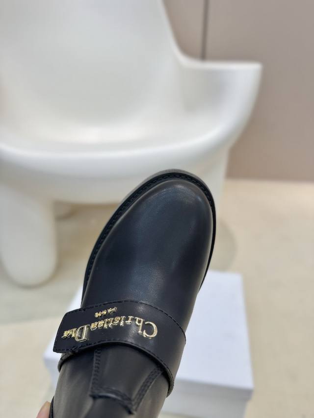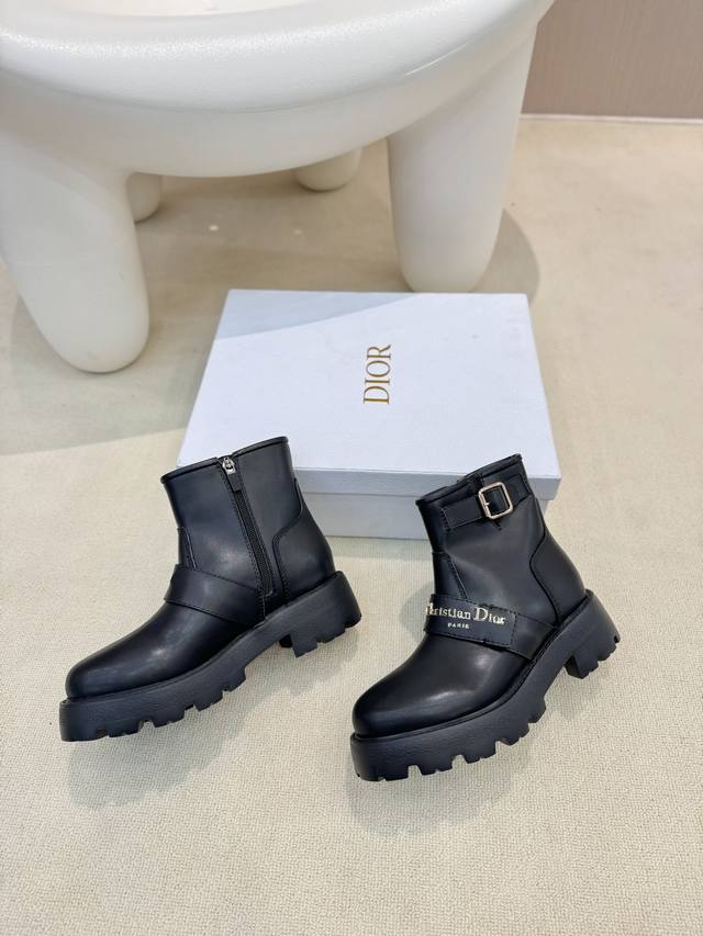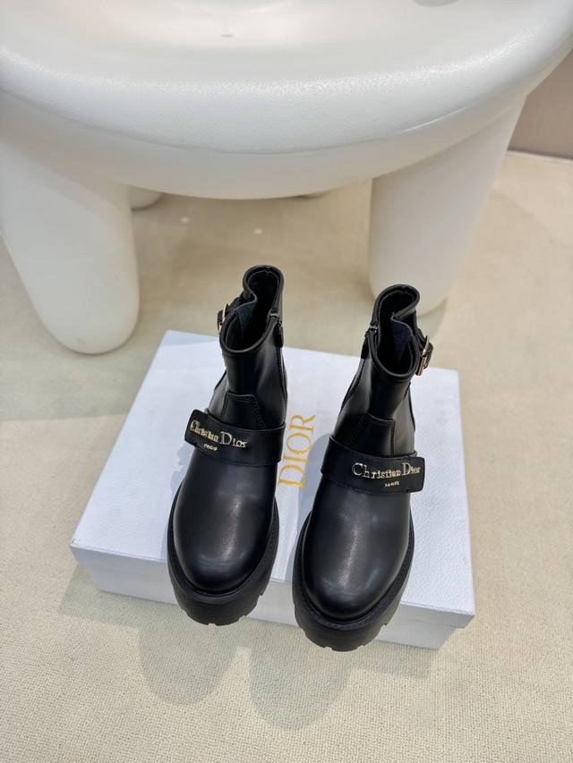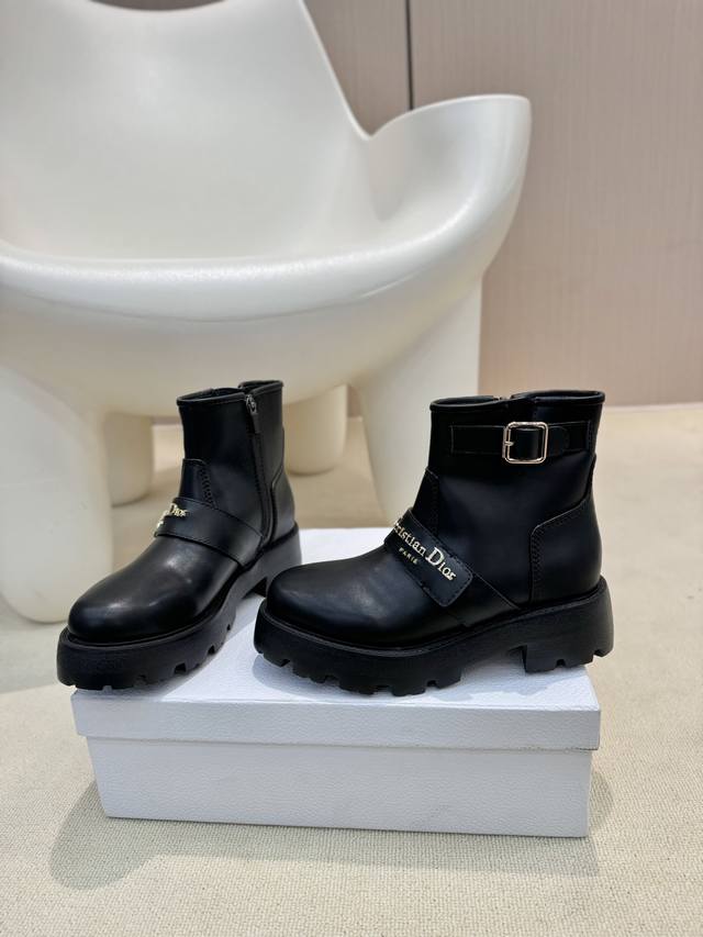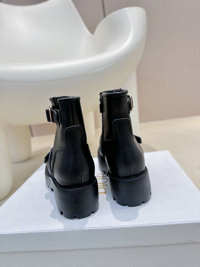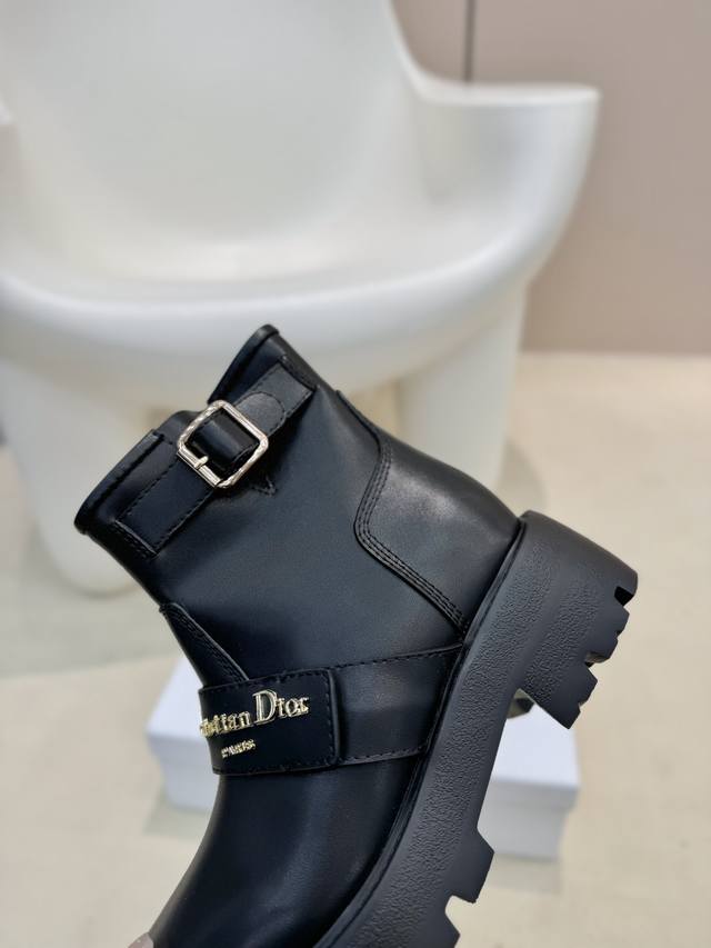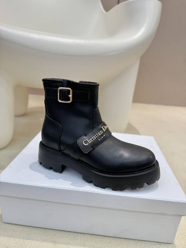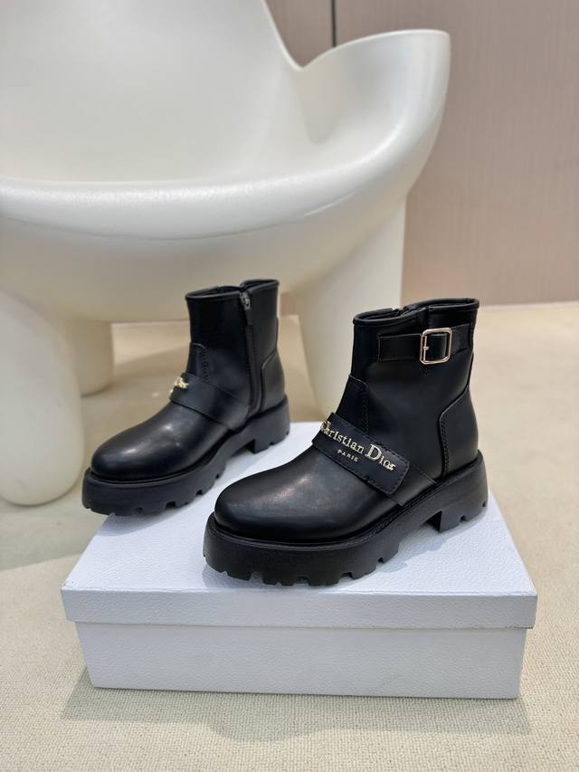 Factory Direct Wholesale: Short Dior Autumn/Winter New D-Major Series Punk Style Women's Boots, Celebrity Style, Cd Logo Hardware Buckle Side Zipper Motorcycle Long Boots, Chunky Heel, Thick Sole, Round Toe, Slip-on Rider Short Boots. Upper: Imported full-grain calfskin. Lining: Water-dyed sheepskin lining and insole. Outsole: Original mold TPU outsole. Accessories: Original mold hardware buckle. Sole thickness: 3.5cm. Size: 35-41 (Standard size 40/41). Custom orders are non-refundable.
