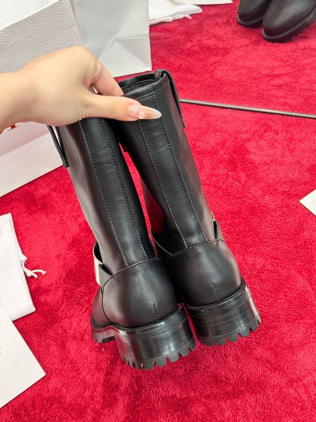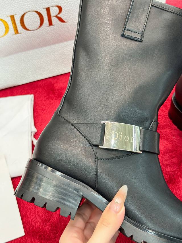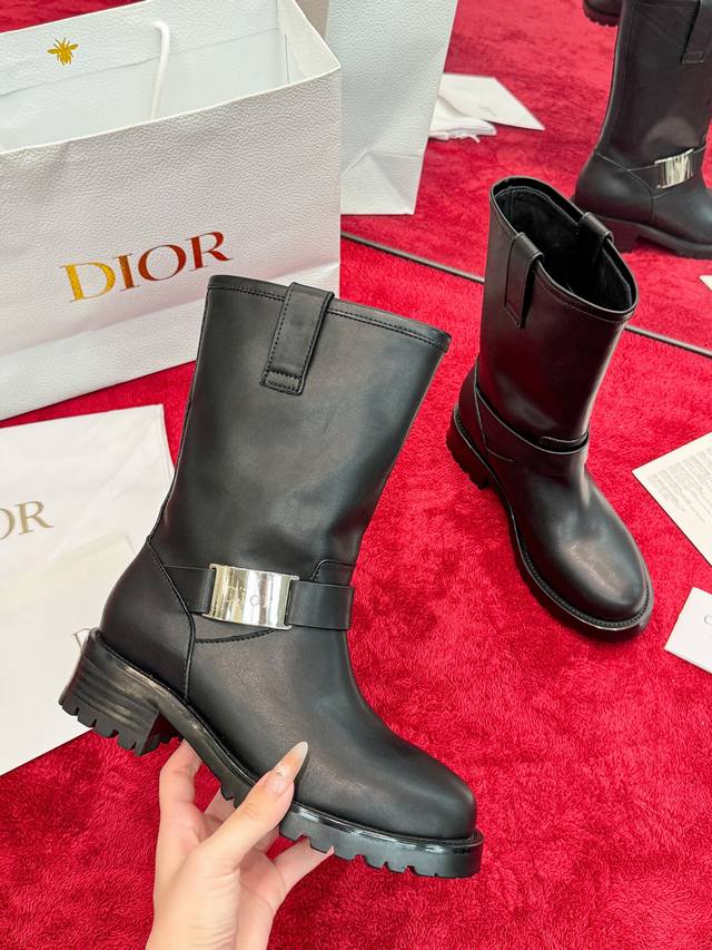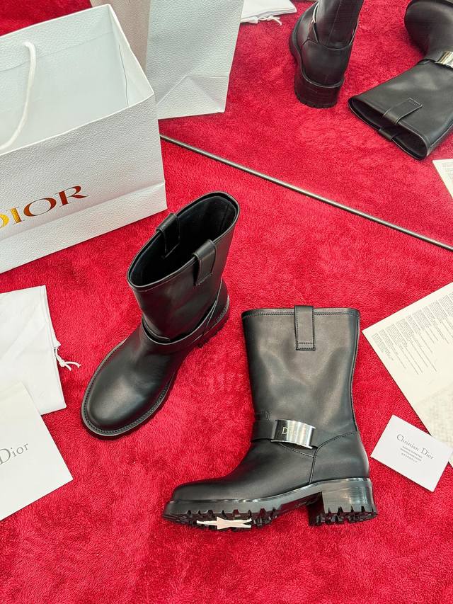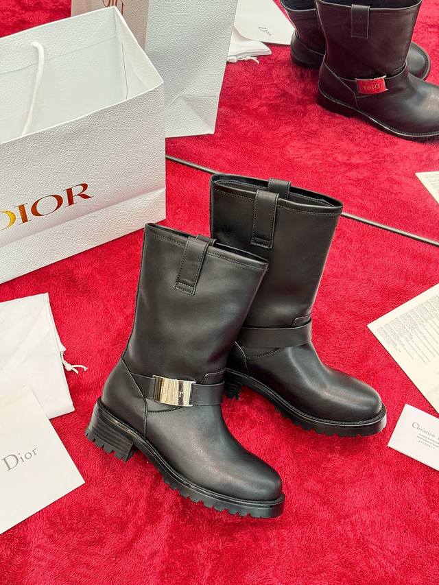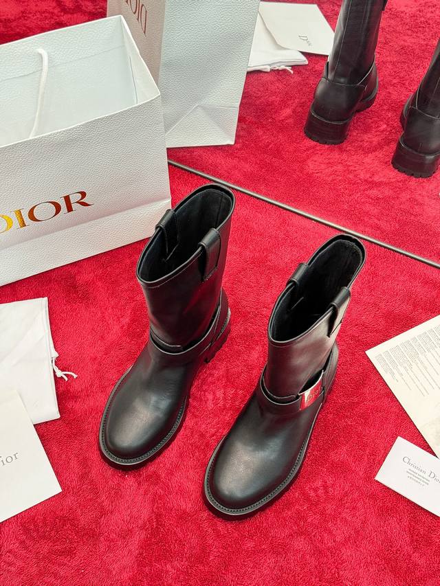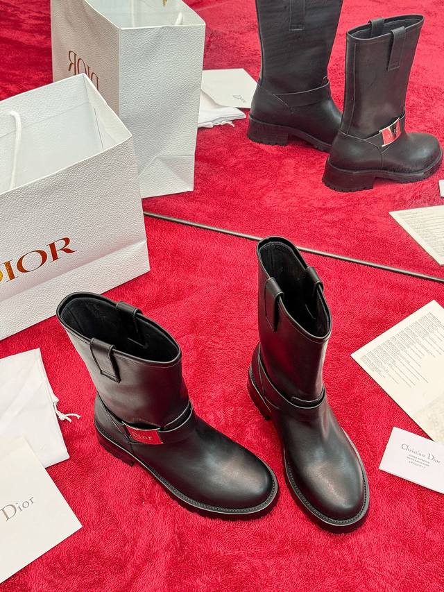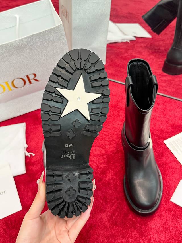 Factory Price: Dior 2025 Autumn/Winter New D-Quest Series Punk Style Women's Boots, Celebrity Style, Cd Logo Hardware Buckle Motorcycle Boots, Low Heel, Thick Sole, Round Toe, Slip-on Rider Ankle Boots. Material: Imported calfskin upper + water-dyed cowhide lining insole + original molded outsole + original molded hardware buckle. Heel Height: 4.5cm. Size: 35-41 (Standard size 40/41). Custom orders are non-refundable.