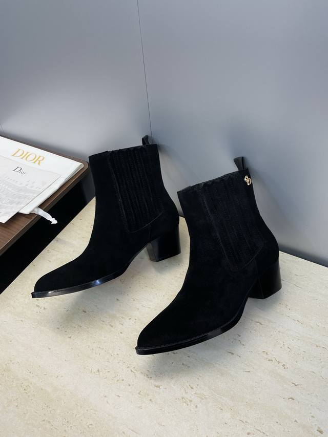 Factory Price: Dior 2025 Fall/Winter Haute Couture Collection D-West Chelsea Boots, Cd Logo Hardware Buckle Motorcycle Boots, Celebrity Style, Chunky Heel, Pointed Toe, Top-Tier Version. Material: Imported suede upper + water-dyed cowhide lining + Italian injection-molded genuine leather outsole. Heel Height: 4.5cm. Size: 35-39 (Standard Size 40/41). Custom orders are non-refundable.