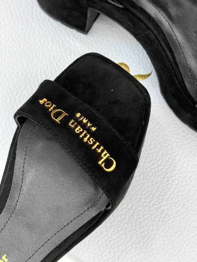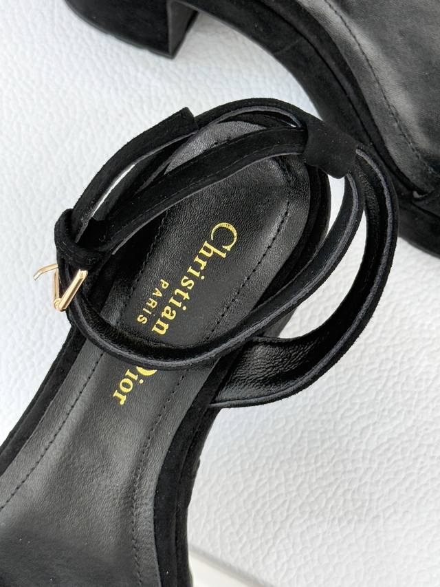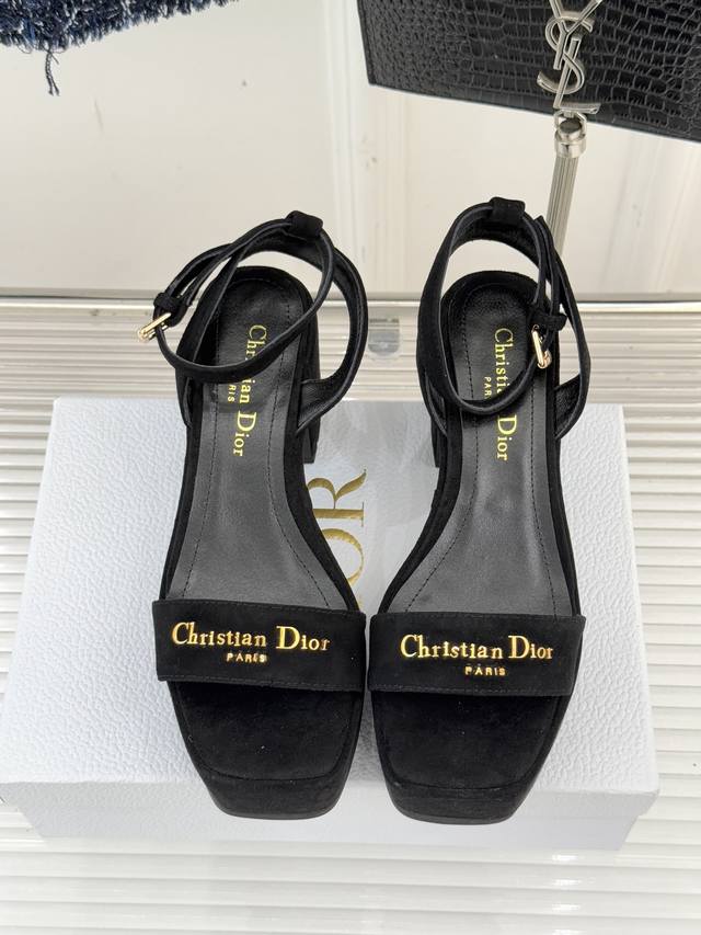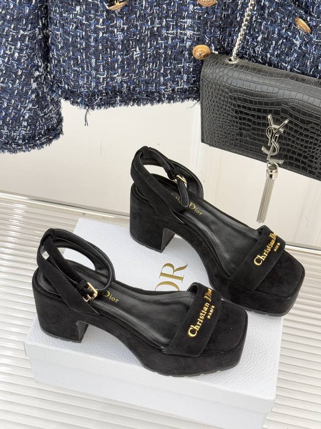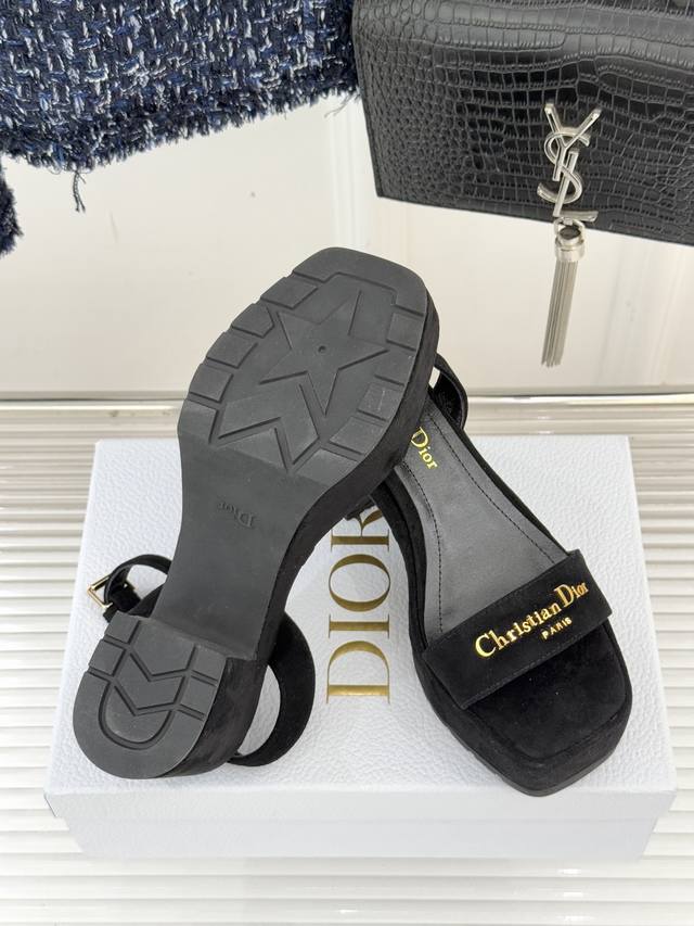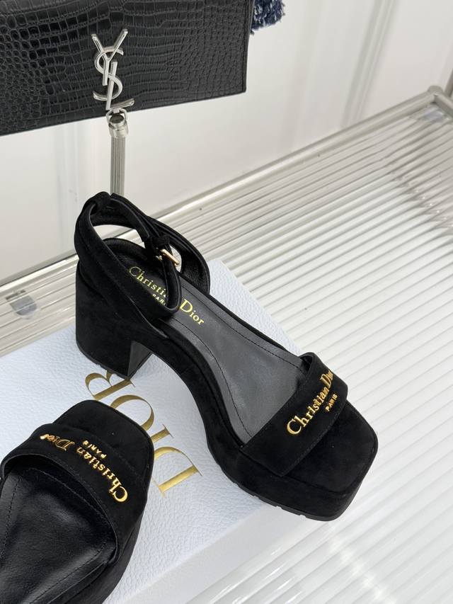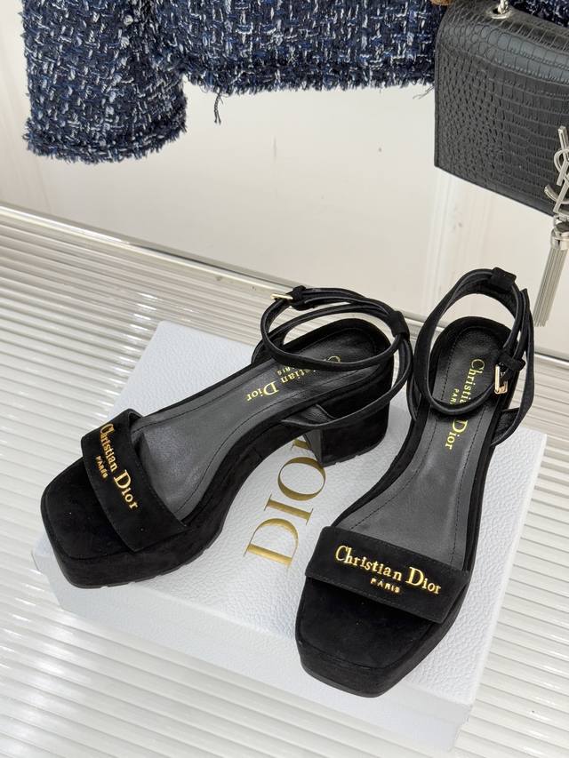 Factory Price: Dior 25Wf New Arrival Letter Strap Platform Block Heel Sandals. A sleek single-strap design runs through the shoe. The striking metallic Dior monogram accentuates the brand's identity with minimalist lines, making the iconic logo a focal point wherever you walk. The carefully proportioned platform and block heel are both designed for comfort and a precise grasp of elegant proportions. The stable heel provides secure support, while the invisible platform cleverly cushions pressure, allowing you to maintain a relaxed posture even during long walks. Fine leather wraps the foot, contouring to the foot's shape while showcasing quality. Every stitching reveals the meticulous craftsmanship of couture. Whether paired with suit pants for a city commute or a floral dress for a romantic getaway, these shoes effortlessly balance sophistication and practicality, ensuring a modern look in every situation.