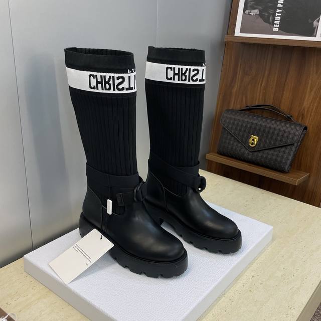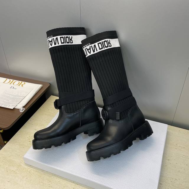 Dior Dior Cd 2025 Autumn/Winter New Haute Couture Poster Style D-Major Embroidered Color Block Letter Logo Round Toe Elastic Wool Mid-Calf Women's Boots Celebrity Same Style Low Heel Slip-on Knight Military Boots