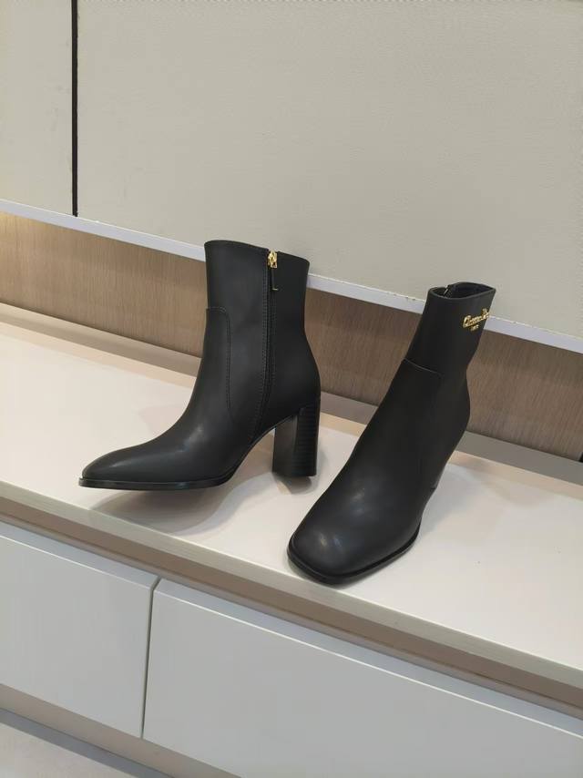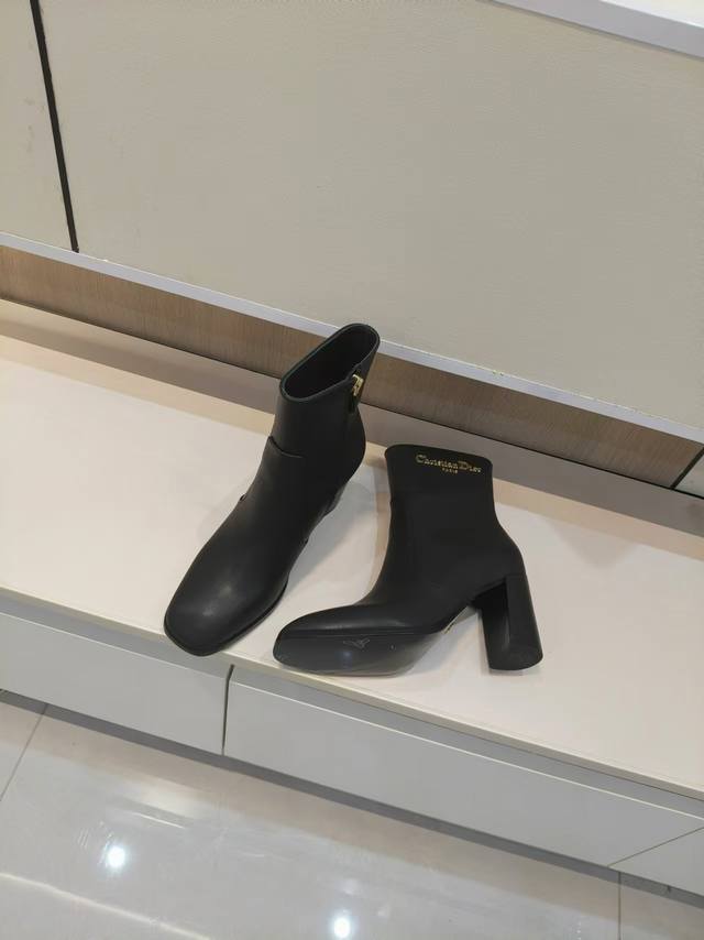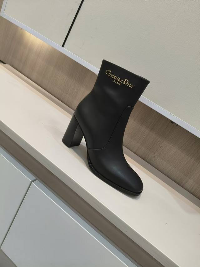 The D-Major boot features distinctive design elements for a striking look. Crafted from black cowhide leather, it's easy to slip on and off. Inspired by the Dior Book Tote handbag, it's topped with a two-tone "Christian Dior" signature. An adjustable nylon strap with a "Cd" logo and a rippled rubber sole set the tone for the striking silhouette.