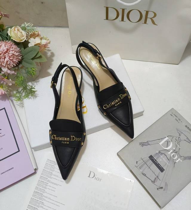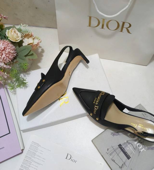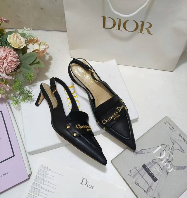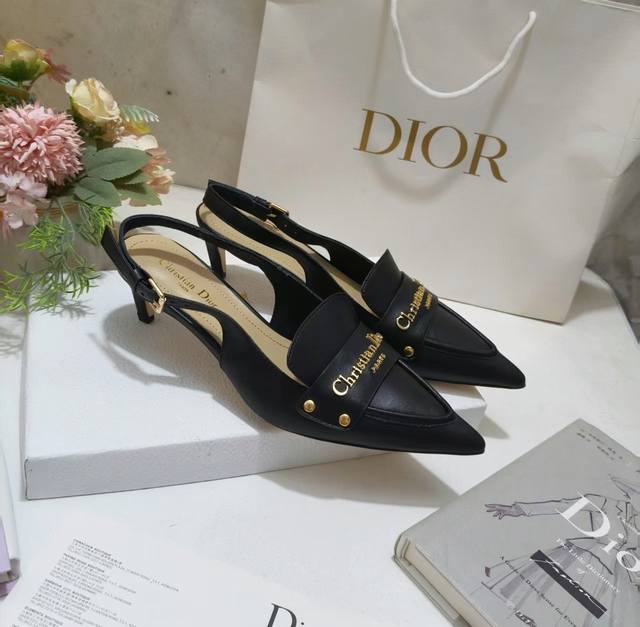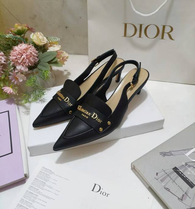 Dior Boy slingback pumps, a new addition to the Fall 2025 collection, offer an elegant reinterpretation of a classic design. The soft black calfskin upper is accented with a gold-finished metal Christian Dior Paris logo, elevating the look. Featuring an adjustable buckle closure, the pointed toe and 5cm graphic heel complement any elegant look.