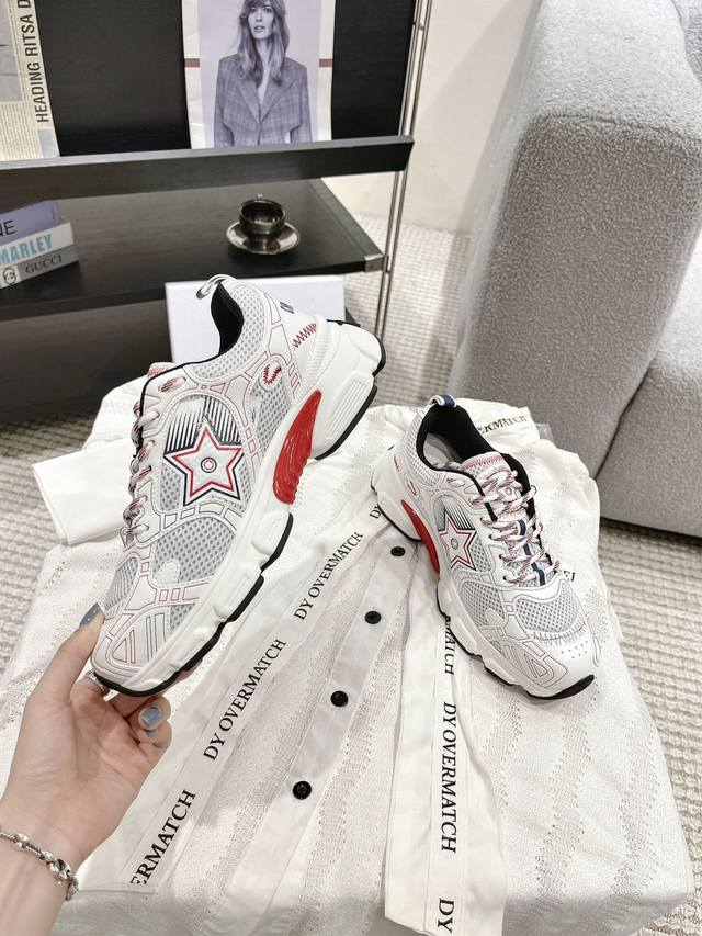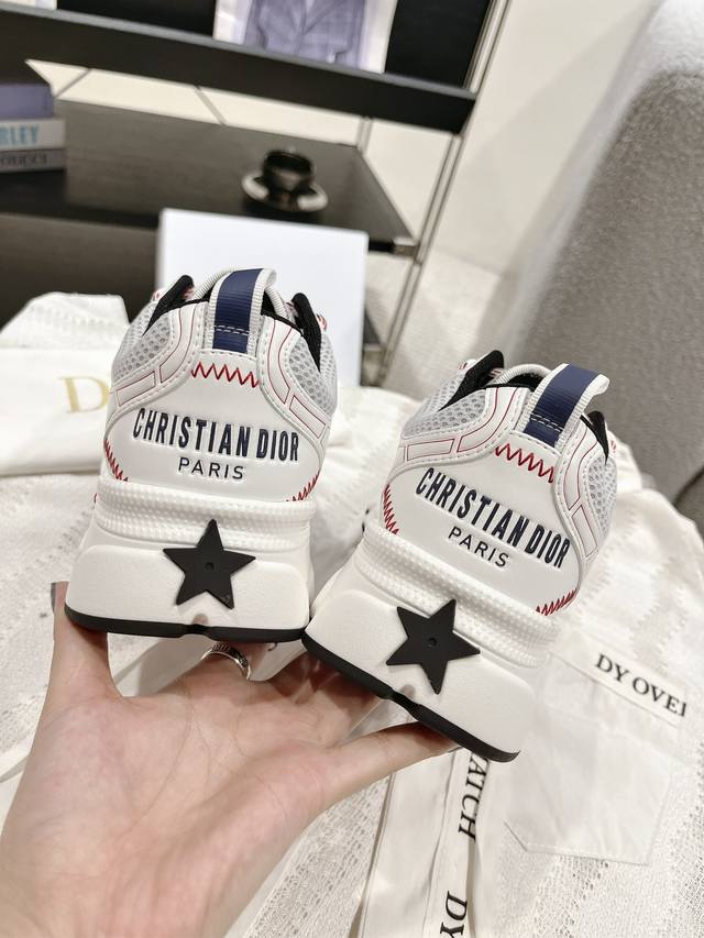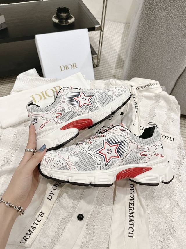 H Or This Dior Vibe# sneaker is a reinterpretation of the classic running shoe, embodying Dior's haute couture spirit. It features a combination of dark blue Oblique-printed technical fabric, mesh fabric, and transparent rubber panels for a contrasting modern style. It is further embellished with signature details such as 3D-effect details, a star decoration on the rear, and the logo on the tongue and rear pull tab. The transparent rubber outsole adds a touch of style, complementing a variety of casual or elegant pieces for a modern look.
