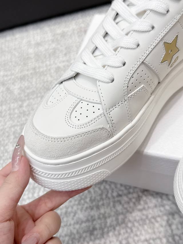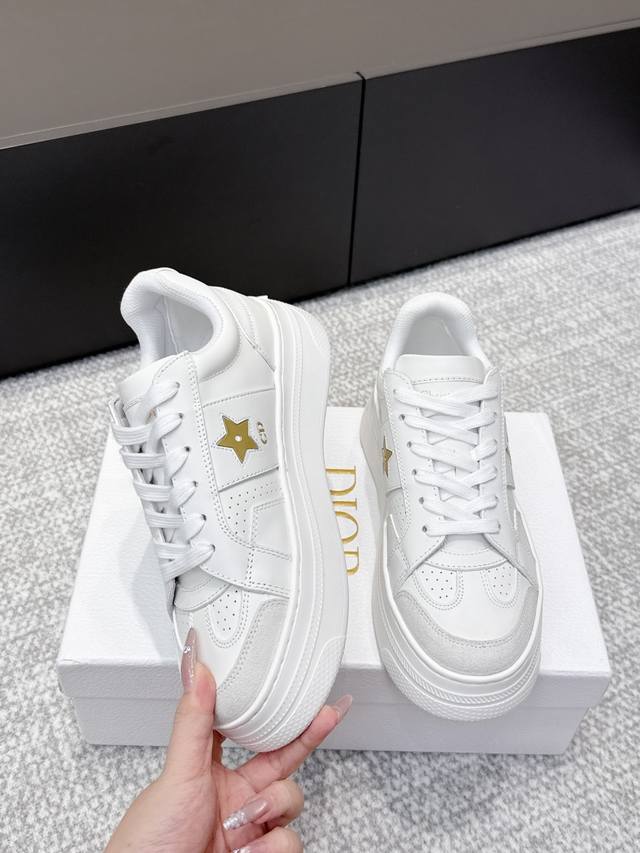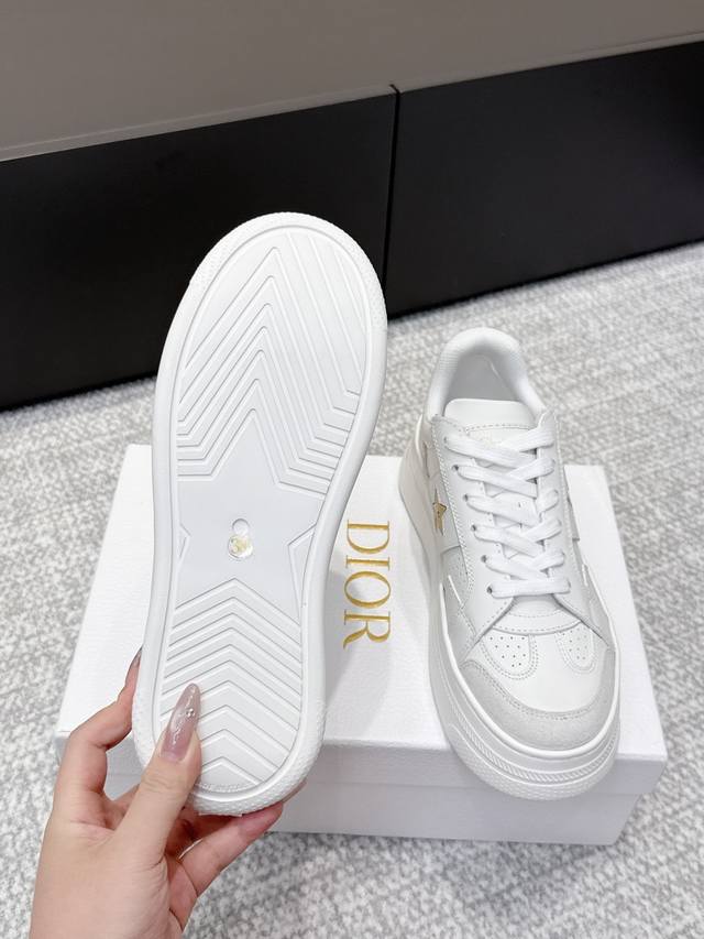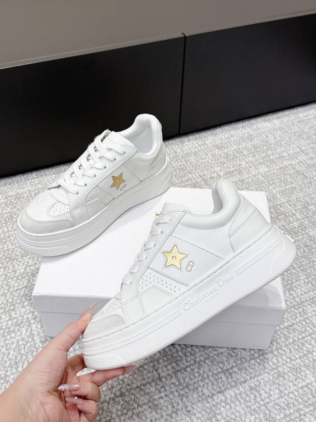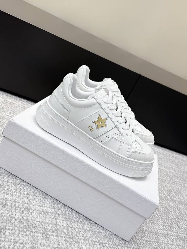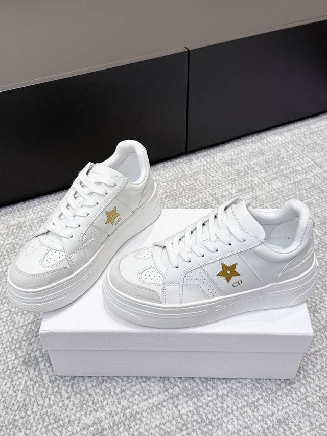 High-quality Dior 2025 Autumn/Winter platform sneakers. These Dior Star sneakers maintain a timeless silhouette and are crafted from premium cowhide leather for exceptional comfort. The eyelets are adorned with tonal suede trim and metallic stars, adding a touch of sophistication. The lightweight design, paired with the iconic "Christian Dior" logo and a thin sole, makes them suitable for all seasons and versatile enough to complement various casual styles. Classic and timeless design with cowhide upper and original IP sole. Sizes: 35-40. Comes with a complete set of boutique-quality gift box packaging.