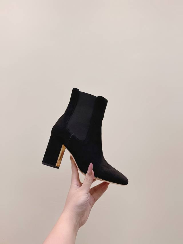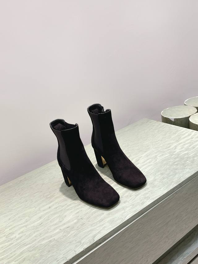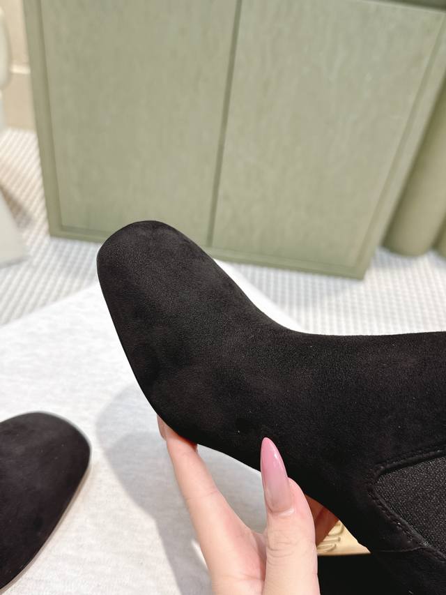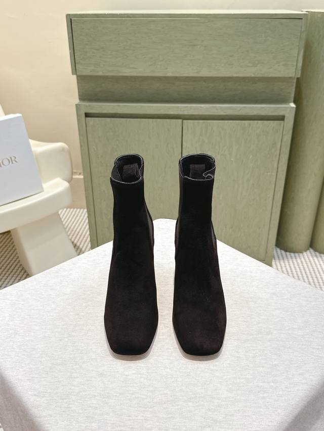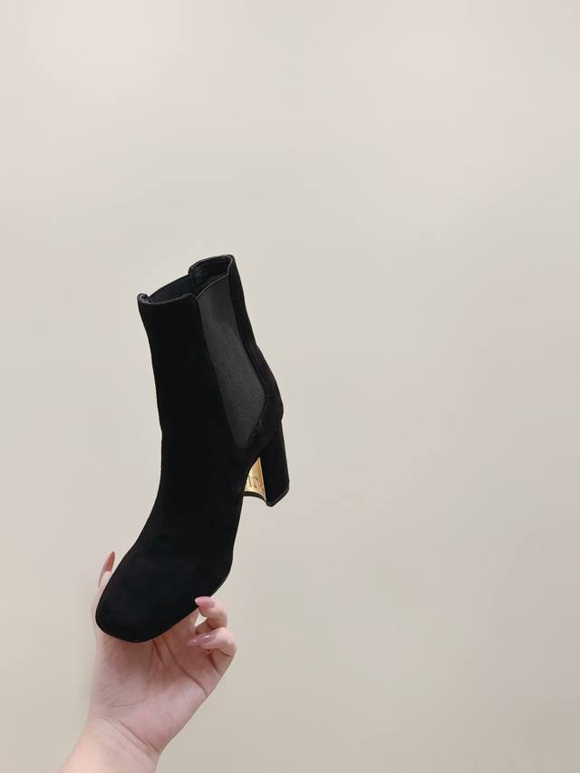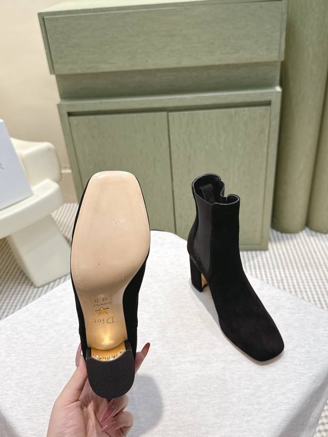 High-quality Dior 25 Fall/Winter high-heeled slip-on boots, newly unveiled at the Fall/Winter ready-to-wear collection, inspired by the elegance and sophistication of the 1960s. Crafted from black patent leather calfskin and leather-effect stretch fabric, the upper is adorned with gold-plated studs of various sizes, continuing the classic Mary Jane design. Decorative straps are embellished with gold-plated Cd logo metal beads, inspired by the iconic Dior Tribales earrings. Material: Stretch lambskin + patent leather; Outsole: Italian genuine leather; Size: 35-39; 40, 41, 42 (custom orders, no returns or exchanges).