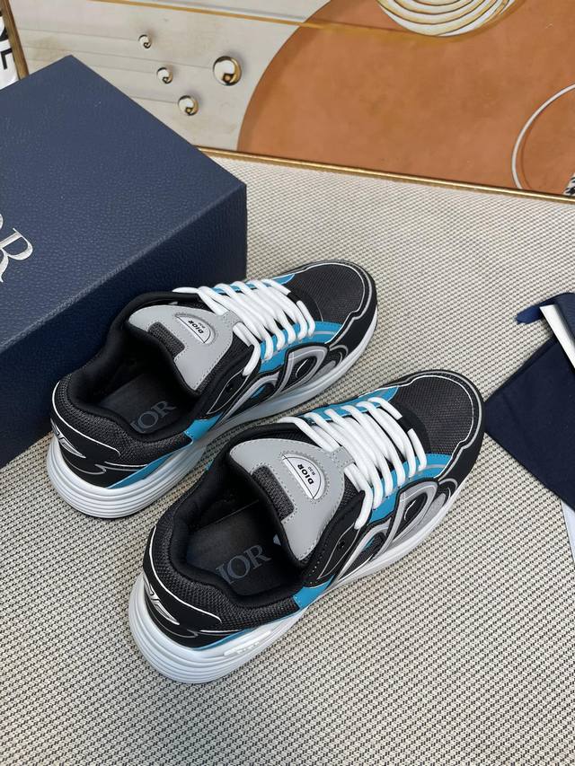 High-quality Dior B30 modern sneakers, celebrity style, thick-soled, lace-up, couple style, casual dad shoes, 3D logo, glow-in-the-dark color blocking, top-tier high-end version. Material: Imported custom silk cowhide and mesh fabric. Lining: Eco-friendly polyester blend breathable lining. Outsole: Original mold TPU outsole. Size: Women's 35-40, Men's 39-45, 46. Customized, no returns or exchanges.