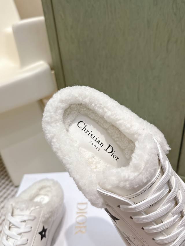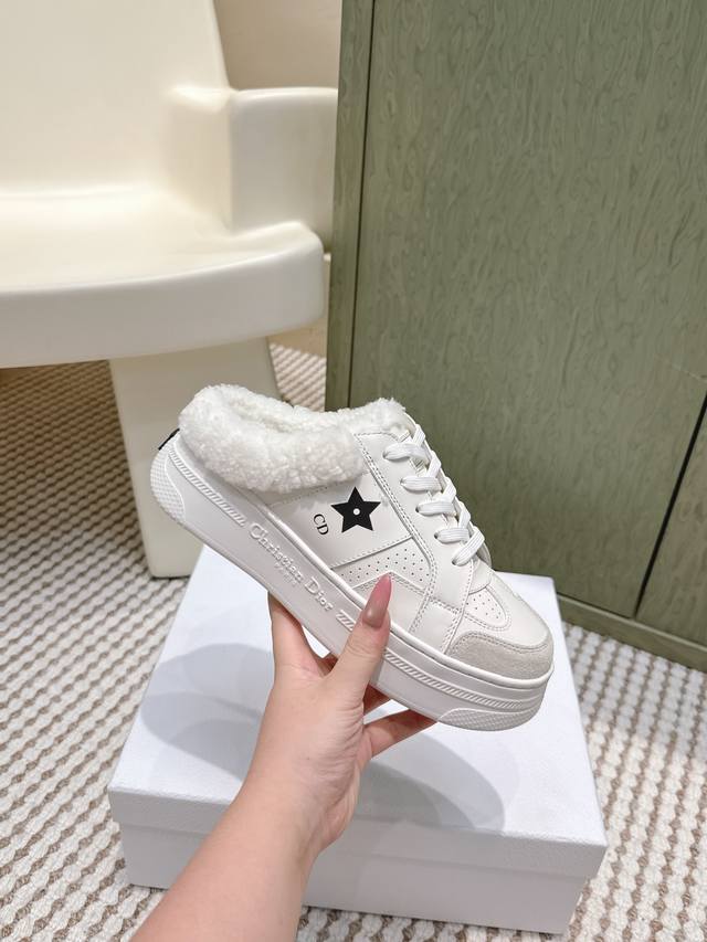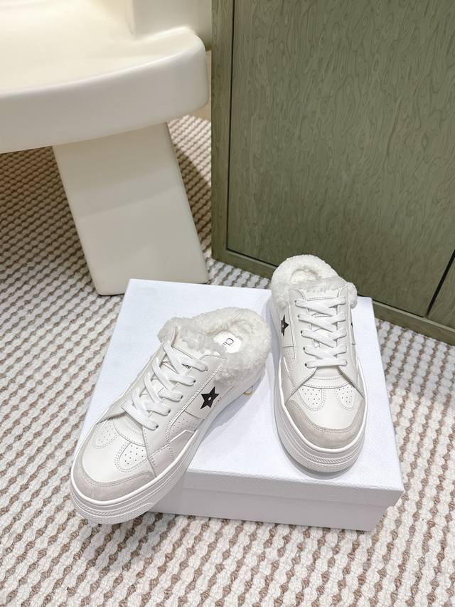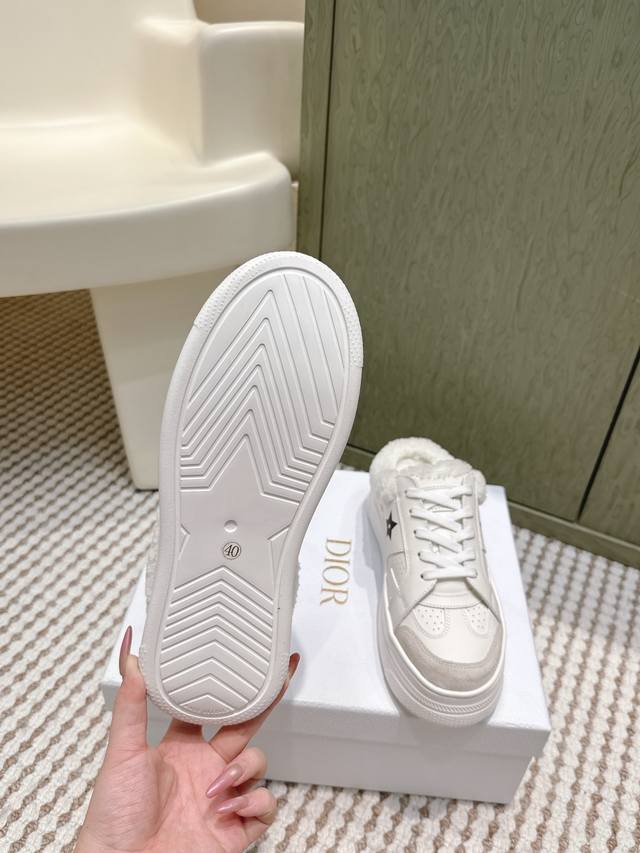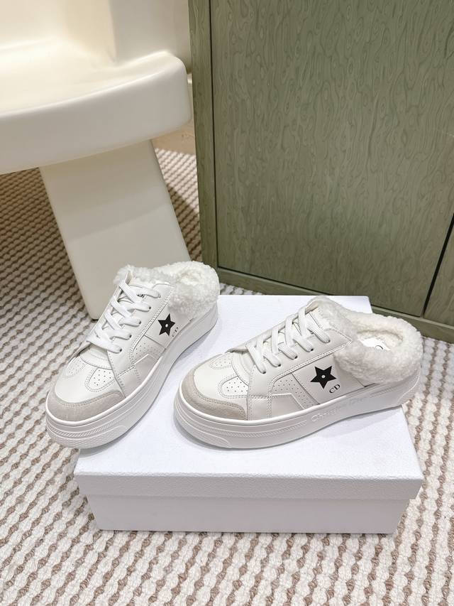 High-quality Dior Star sneakers (half-slip-on style) - These Dior Star sneakers maintain a timeless silhouette and are a new classic. Crafted from white calfskin leather with tonal suede trim, they are adorned with the Cd and Christian Dior Paris logos, and a metallic star embellishes one eyelet for added style. Lightweight and featuring the signature Christian Dior thin sole, they are suitable for all seasons and can be paired with various casual looks to add a finishing touch. Sizes: 35-39, 40-41 (custom orders available).