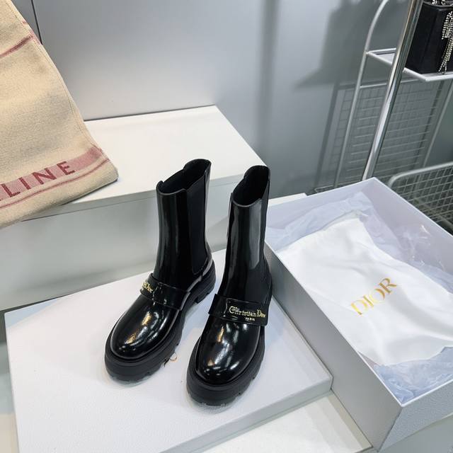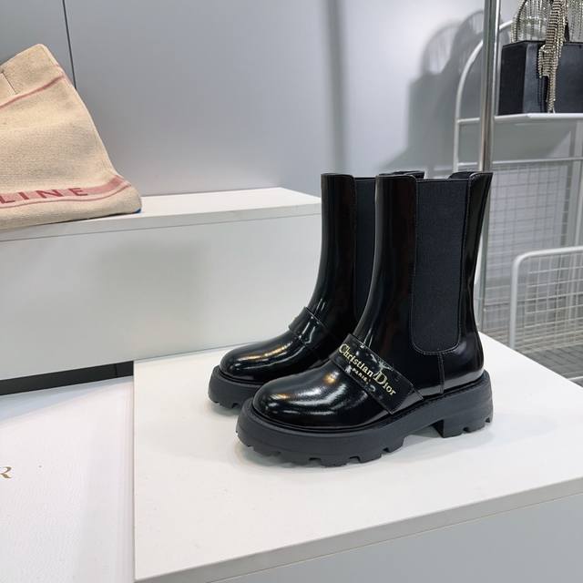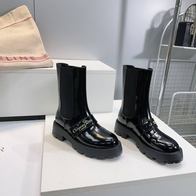 High-quality factory boots! Top-quality Dior | Dior's new Fall/Winter 25 straight-leg elastic slip-on boots! Round-toed, thick-soled, block-heeled Martin boots! The D-Major boots feature a cleverly designed heel, providing just the right amount of height while ensuring stability and ease of movement. Whether paired with simple jeans for an everyday look or an elegant dress for a formal occasion, they perfectly embody the essence of fashion and versatility. These boots are crafted from premium calfskin leather and embossed with a gold-stamped logo, showcasing the brand's elegant and sophisticated aesthetic. The upper features a sculpted cowhide lining, cowhide inserts, and an original molded rubber foam outsole. Heel height: approximately 4.5 cm. Sizes: 35-40. Made to order, no returns or exchanges. Comes with original packaging.