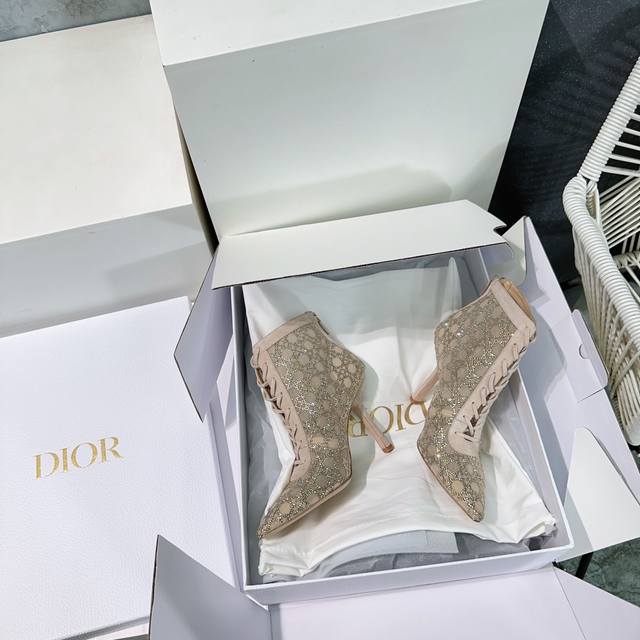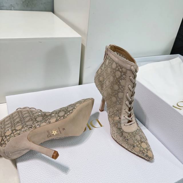 High-quality factory direct! Top-quality channel purchase level! Dior Fall/Winter 2025 full rhinestone mesh Tribales elegant style back zip high-heeled ankle boots! Ankle boots suitable for summer! This series of high heels has an exquisite design! The classic pointed toe shape is elegant and elongates the legs. The mesh upper is paired with delicate Cd jacquard patterns and is adorned with sparkling rhinestones, making it glamorous and high-end. The heel height is just right, ensuring stability when walking. High-quality materials and exquisite workmanship; from details to the overall design, the quality is impeccable, easily suitable for various high-end or casual occasions! Original custom upper with imported Australian rhinestones, original molded mesh, imported suede, water-dyed sheepskin lining, Italian imported genuine leather outsole. Height: approx. 10cm. Sizes: 35-42. 40, 41, 42 are custom-made and non-refundable. Comes with original packaging.