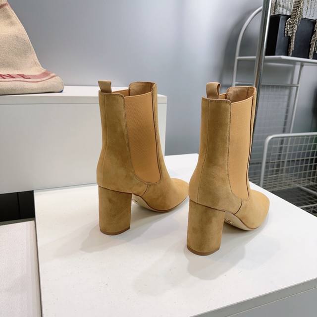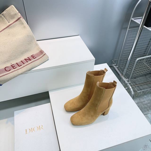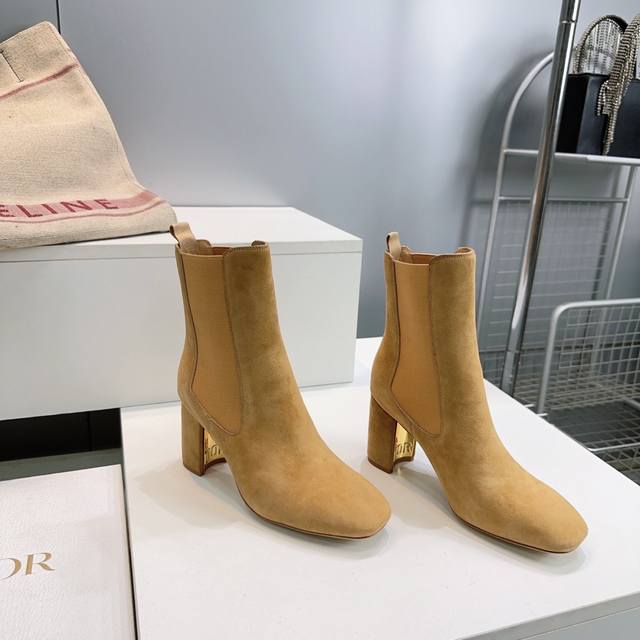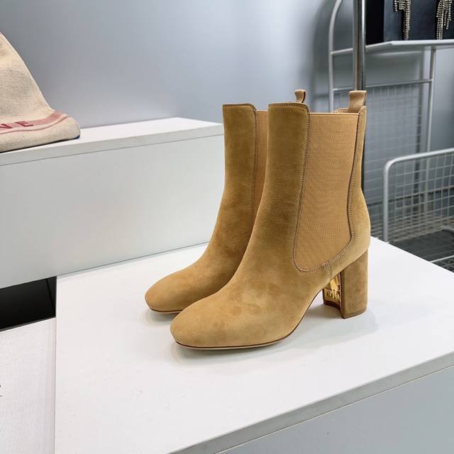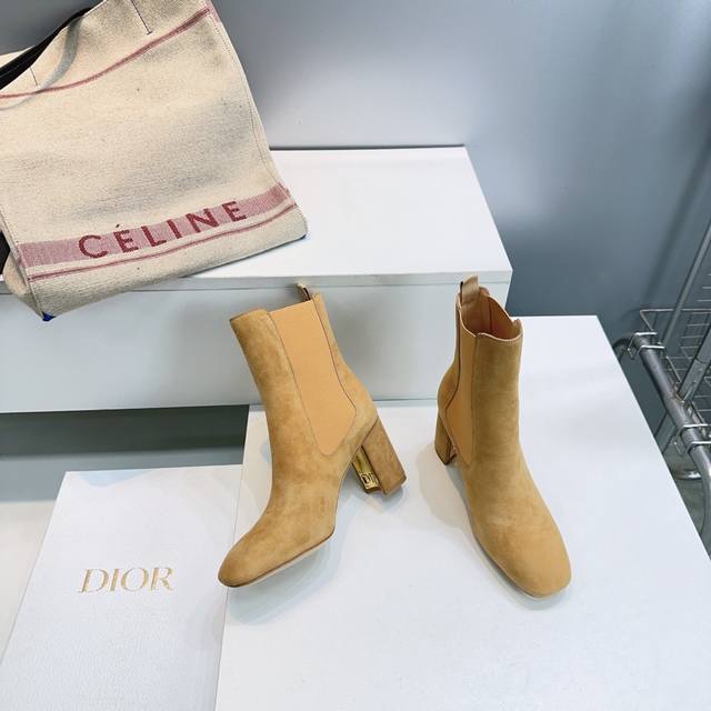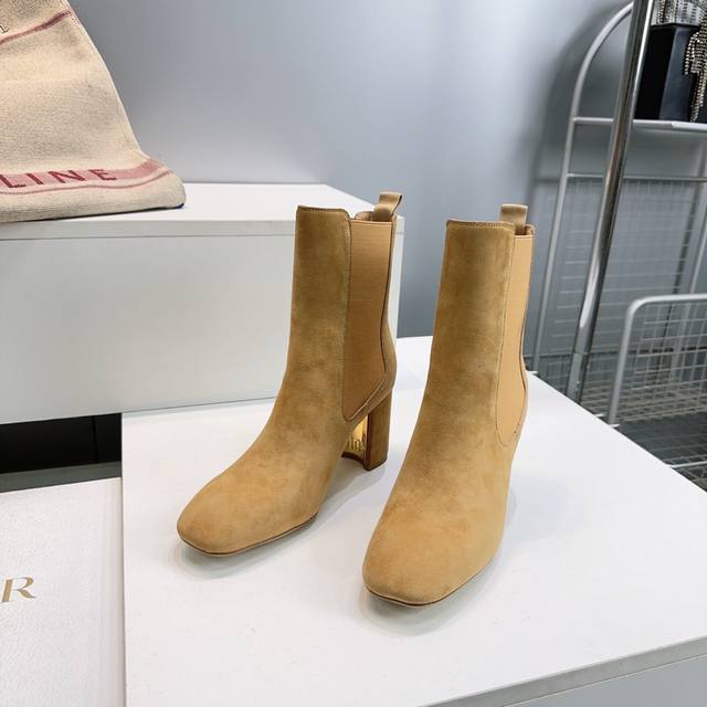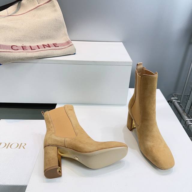 High-quality factory release! Top-quality Dior 2025 Autumn/Winter new arrival elastic slip-on round toe chunky heel metal letter heel ankle boots! These heeled ankle boots are from the 2025 Autumn/Winter ready-to-wear collection, their distinctive silhouette showcasing haute couture style. The upper is made of imported calfskin suede, the insole is made of sheepskin, and the outsole is made of imported Italian genuine leather. Heel height: 8cm. Sizes: 35-42, 40, 41, 42 are non-refundable and non-exchangeable. Comes with original packaging.
