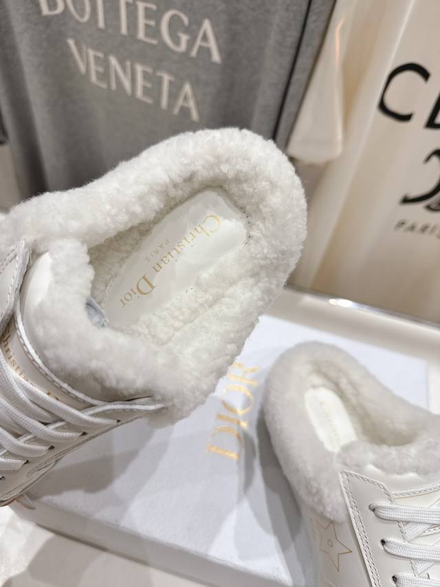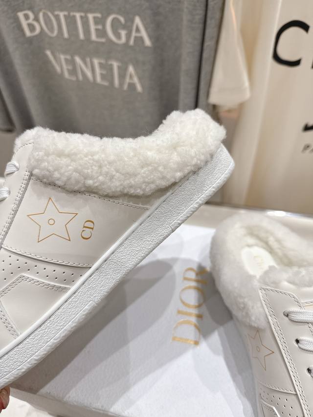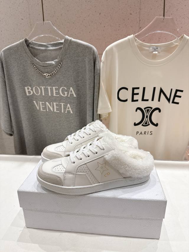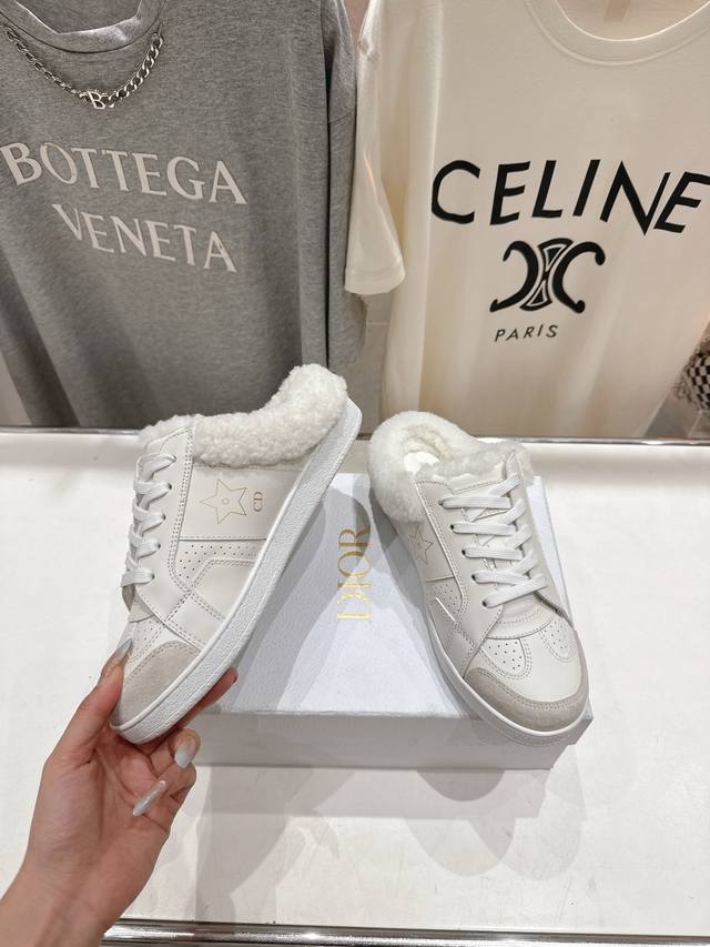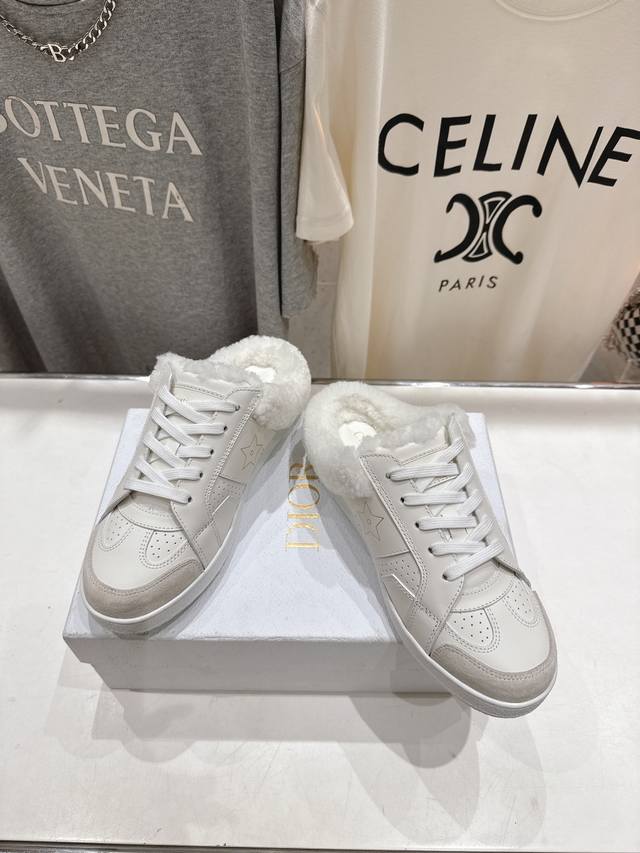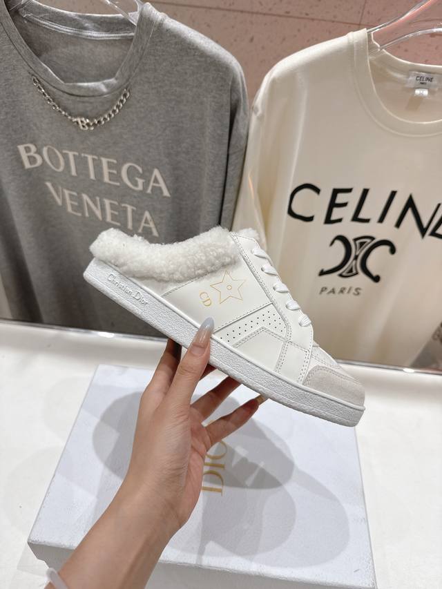 High-quality market version DDD Dior Star F037 2025 Autumn/Winter New Half-Slipper Casual Sneakers with Wool Lining DDD Continuing its timeless silhouette, this is a new classic item. Crafted from white cowhide leather and adorned with tonal suede panels. Embellished with the "Cd" and "Christian Dio* Paris" logos, and metallic star-decorated eyelets, it elevates its style. Lightweight and featuring a thin sole with the "Christian Dio*" logo, it's suitable for all seasons and can be paired with various casual looks to add a finishing touch. The tongue is adorned with the "Christian Dior Paris" logo. The side features the "Cd" logo and a black star. One eyelet is decorated with a metallic star. The rubber outsole features the Christian Dior lucky star symbol. Upper: Silk cowhide leather. Lining: Imported wool. Wool insole. Outsole: Original mold TPU outsole. Sizes: 35-41. Sizes 40 and 41 are custom-made and non-refundable.