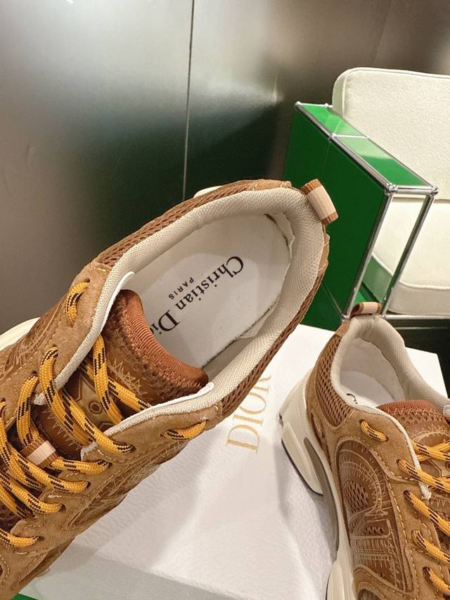 K020 Dior Dior Vibe Sneakers This Dior Vibe sneaker embodies the spirit of Dior haute couture, reinterpreting the classic running shoe. White mesh fabric is adorned with an Oblique print, paired with gold and silver laminated leather panels for a striking and stylish look. Classic details such as 3D effects, a lucky star symbol on the heel, and logos on the tongue and heel pull tab further enhance the design. The lightweight sole is decorated with grey stars, complementing a variety of casual or elegant pieces for a modern look. Sizes: 35-41, 42 (custom sizes available).