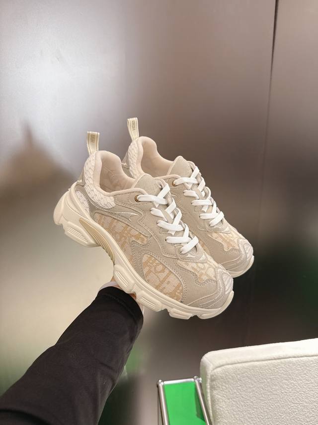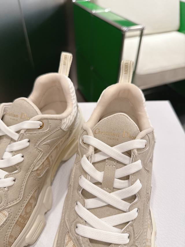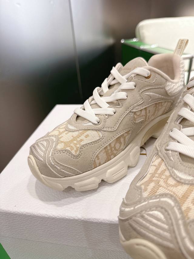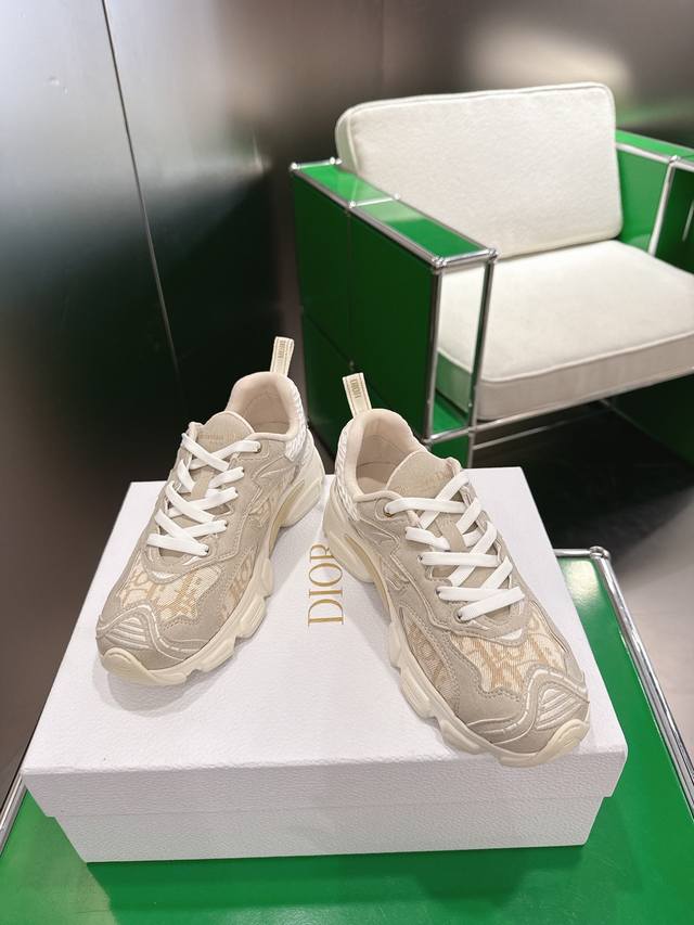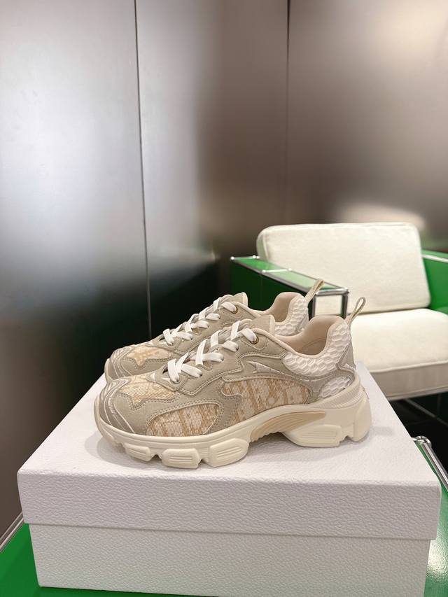 K020 Dior Dior Vibe Sneakers This Dior Vibe sneaker embodies the spirit of Dior haute couture, reinterpreting the classic running shoe. White mesh fabric is adorned with an Oblique print, paired with gold and silver laminated leather panels for a striking and stylish look. Classic details such as 3D effects, a lucky star symbol on the heel, and logos on the tongue and heel pull tab further enhance the design. The lightweight sole is decorated with grey stars, complementing a variety of casual or elegant pieces for a modern look. Sizes: 35-41, 42 (custom sizes available).