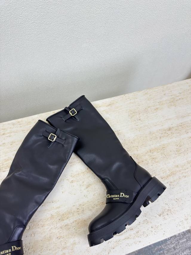 Knee-high boots with Dior thick soles and metal lettering logo decoration.