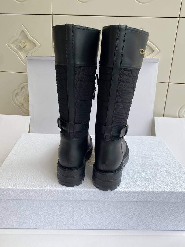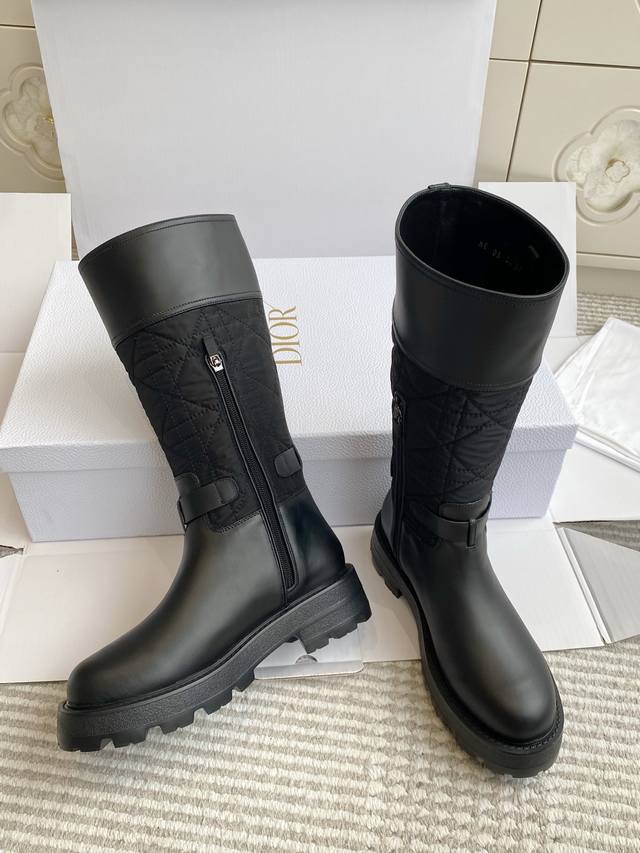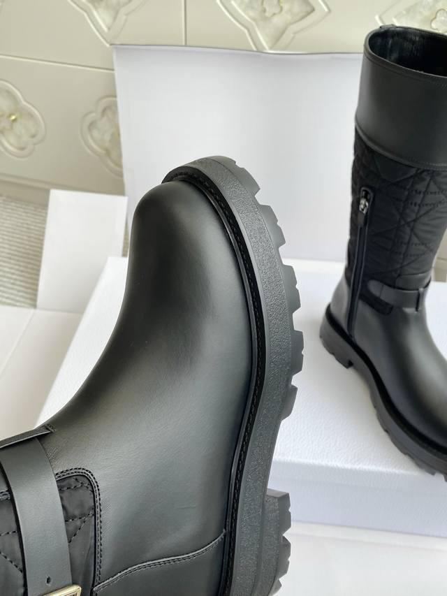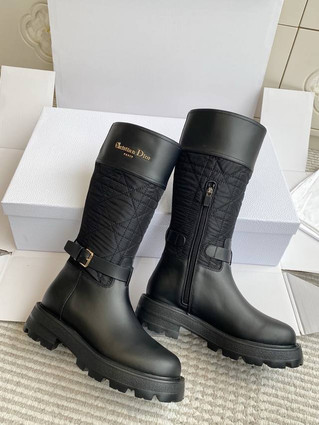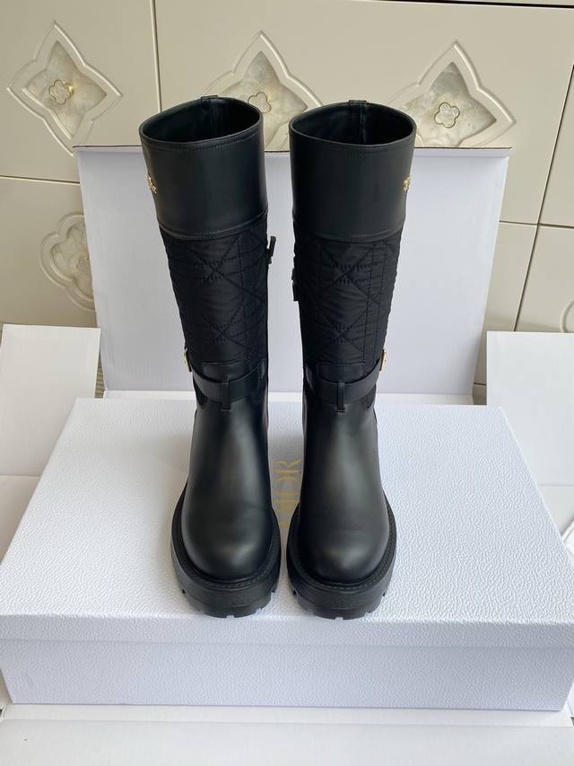 Original box packaging. High-quality Dior Fw new D-Town platform mid-calf boots. These D-Town boots are eye-catching and stylish, featuring a black calfskin and nylon upper. The nylon is decorated with a cannage pattern and a metal logo, creating a fashionable and simple look! The upper is made of calfskin, and the outsole features a lucky star design. Sizes 35-39, 40, 41, and 42. Custom orders are non-refundable.