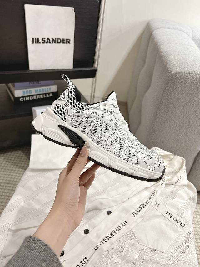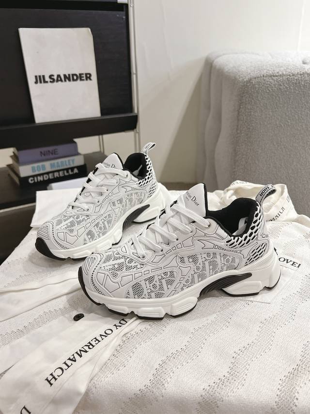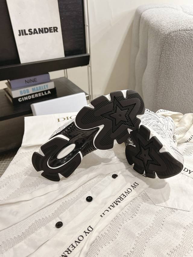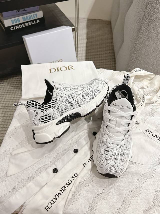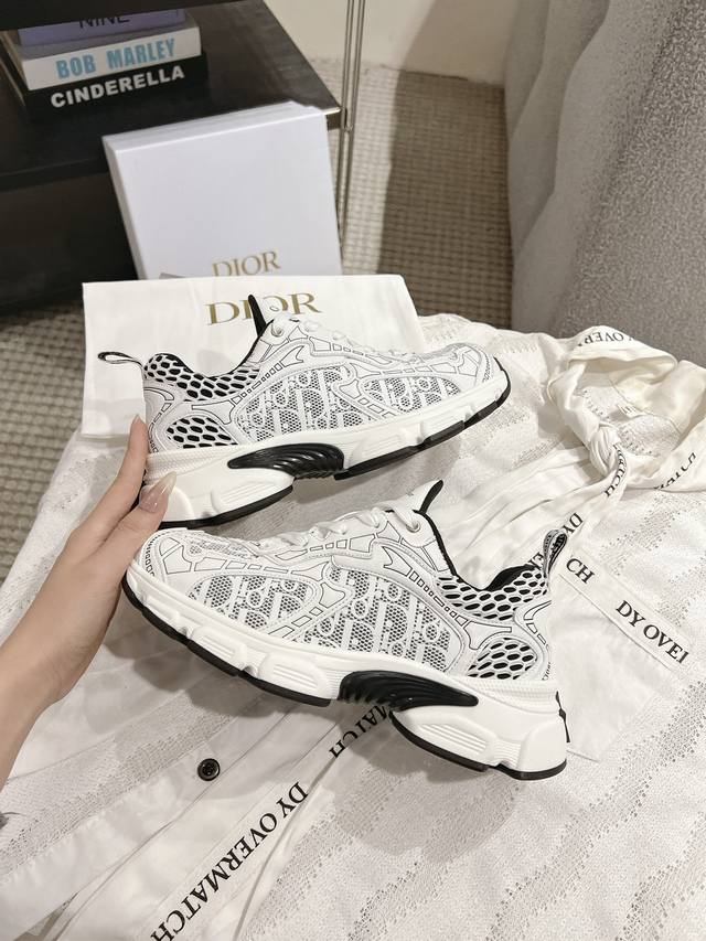 R The Di*R Vibe# Dior sneaker captures Di*R's couture spirit, reinterpreting a classic running shoe. It features a contrasting, modern design with dark blue Oblique-print technical fabric, mesh, and transparent rubber panels. It's further embellished with signature details like 3D-effect details, a star embellishment on the rear, and the logo on the tongue and rear pull tab. The transparent rubber outsole adds a touch of style, complementing a variety of casual or elegant pieces for a modern look.