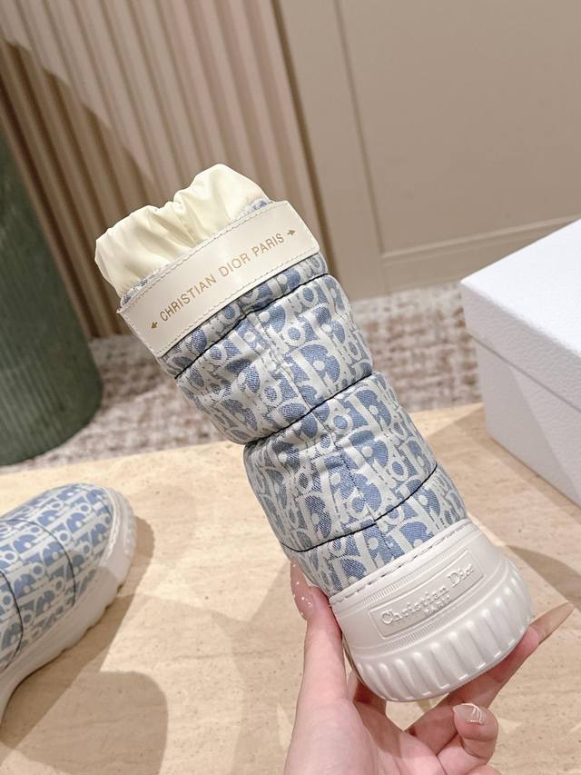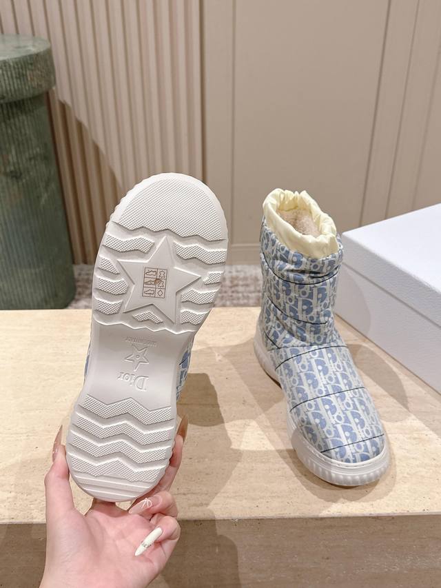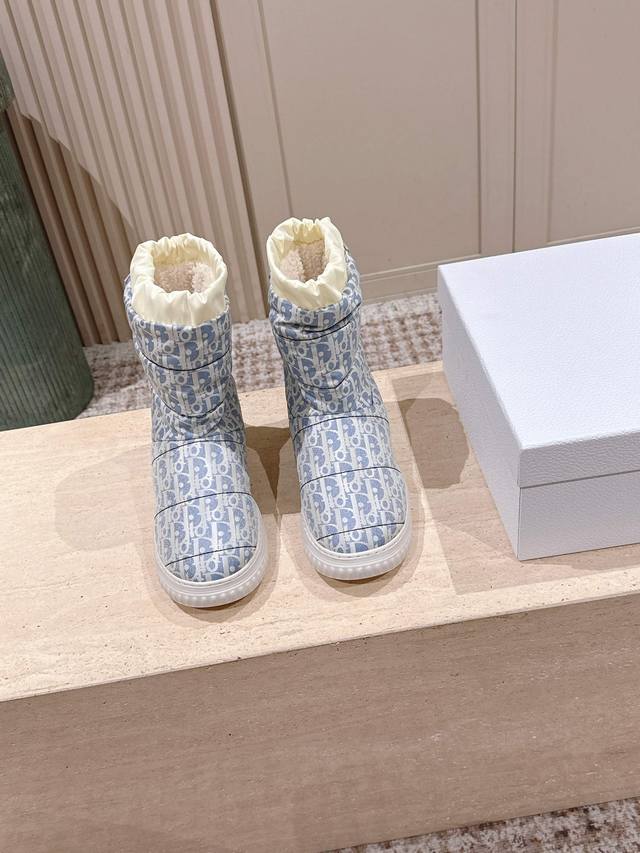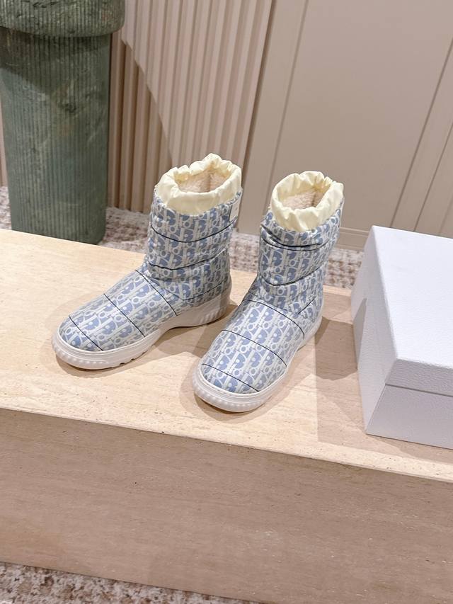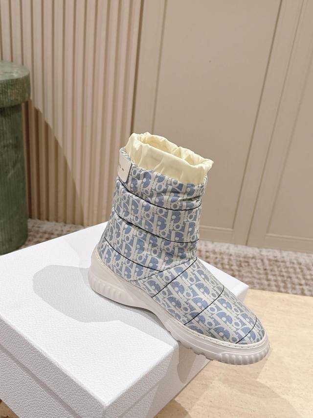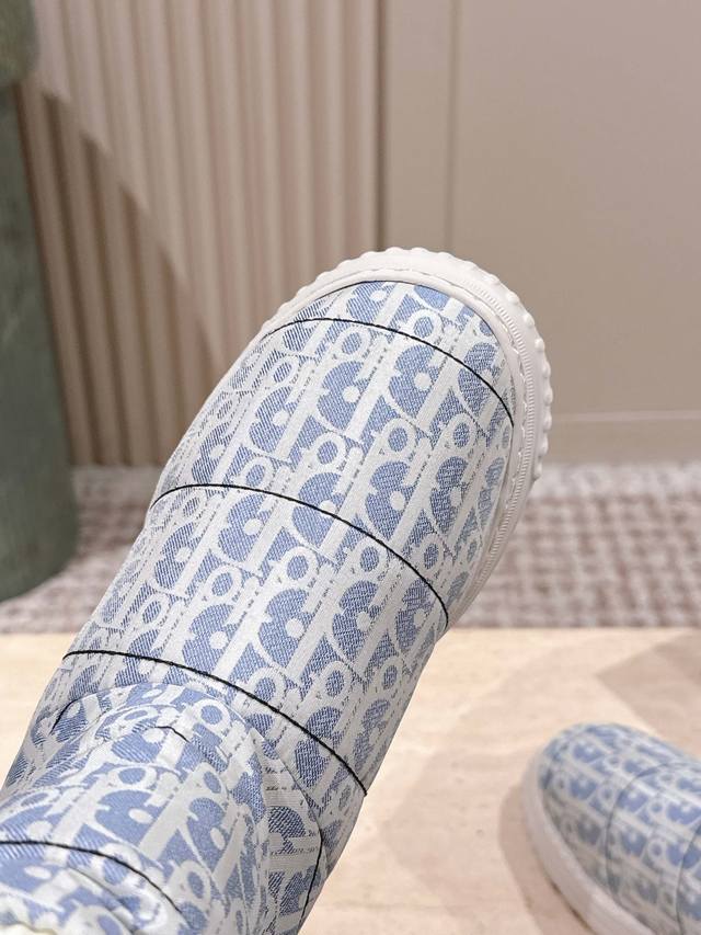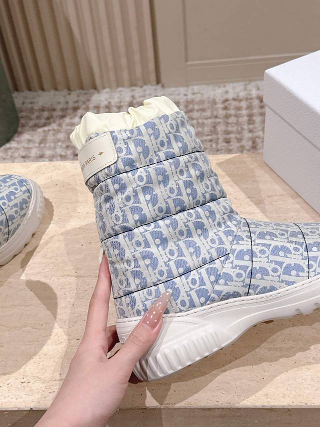Retail Item DDD Dior Frost Ankle Boots with Wool Platform Snow Boots DDD This Dior Frost ankle boot is from the Dior Alps limited edition collection, incorporating haute couture style and reinterpreting the snow boot look DDD The washed blue and off-white quilted nylon Oblique print upper complements the white sheepskin lining, with an elastic design for an ideal fit. The heel is adorned with a tonal leather panel and accented with a gold-tone Christian Dior Paris logo, while the lightweight rubber sole features a logo for added sophistication. It can be paired with other Dioralps items for a coordinated look. DDD Material: Original custom monogram fabric Lining: 100% wool DDD Original Lucky Star Eva foam outsole DDD Size: 35-41 40 41 Custom orders are non-refundable DDD
