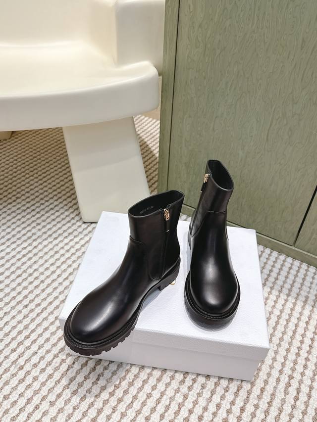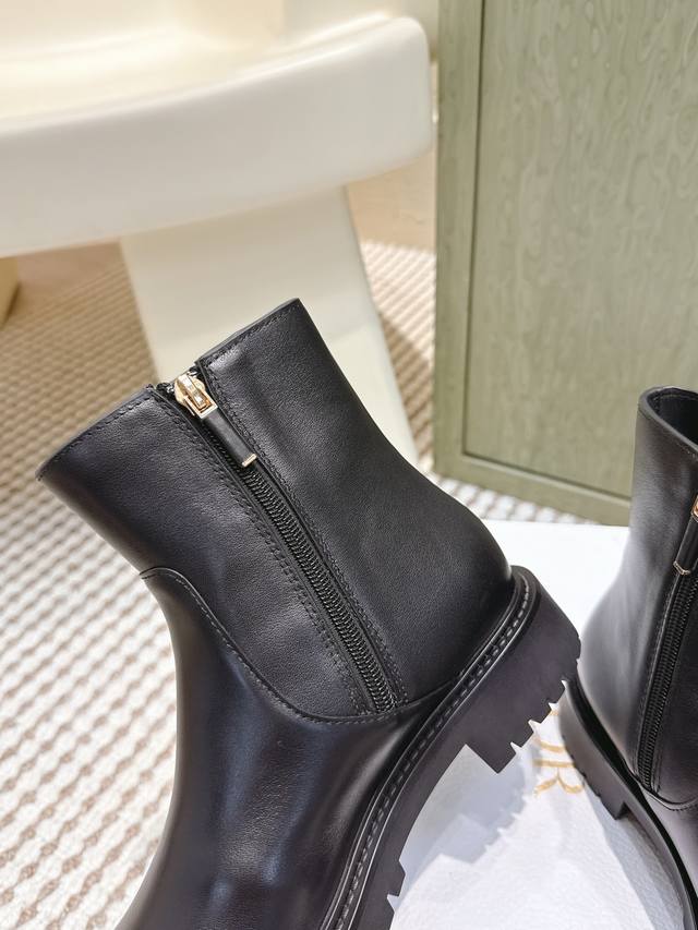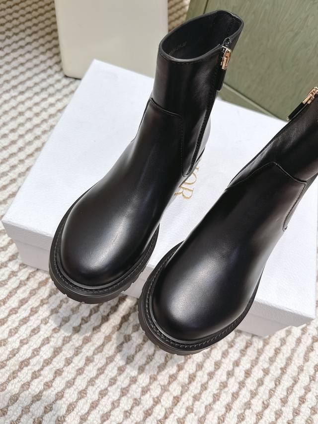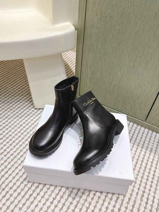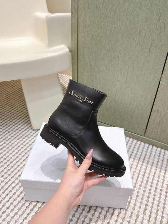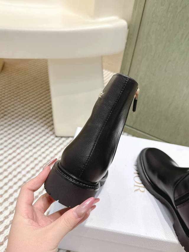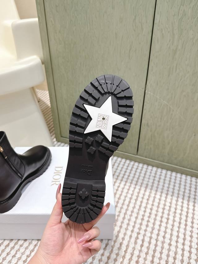 Retail-grade Dior Alps D-Quest Ankle Boots DDD These D-Quest ankle boots are a new addition to the Dioralps limited edition collection, incorporating classic Dior haute couture elements and reinterpreting the classic motorcycle boot. Crafted from black grained calfskin, they feature a white sheepskin shearling lining for added style and exceptional comfort. Decorative straps are adorned with a gold-plated Christian Dior Paris logo. The thick yet lightweight notched sole adds a touch of casual elegance. DDD Body: Calfskin DDD Lining: Sheepskin shearling DDD Decorative straps adorned with a gold-plated Christian Dior Paris logo DDD Notched rubber sole decorated with Christian Dior's lucky star symbol DDD Size: 35-39 40.41 Custom-made DDD