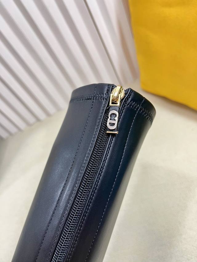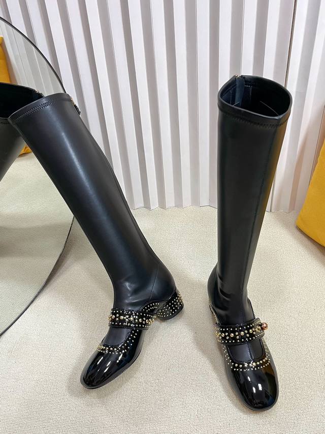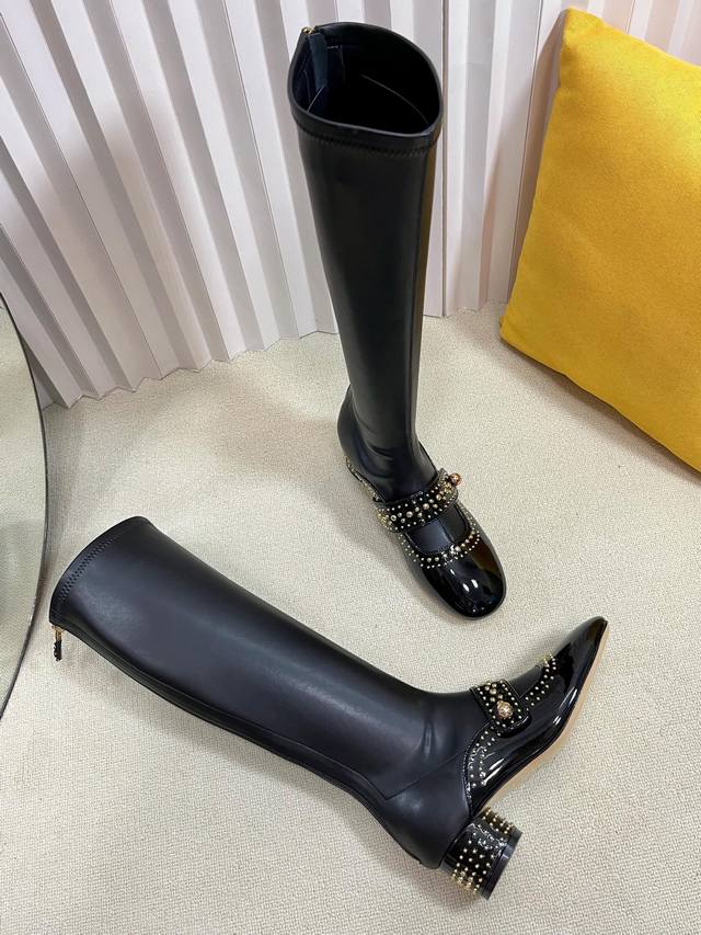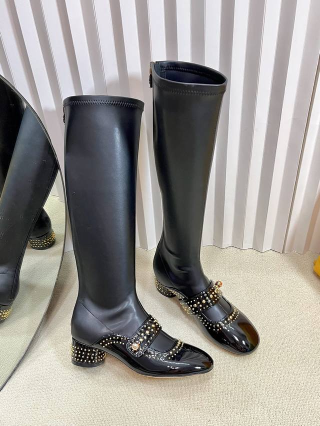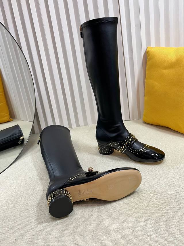 Dior Dior 25 autumn and winter new Belle-D punk style rivet thick heel elastic high-top knight women's boots celebrity style Cd letter logo hardware buckle square toe color-blocking rear zipper low-heeled motorcycle boots