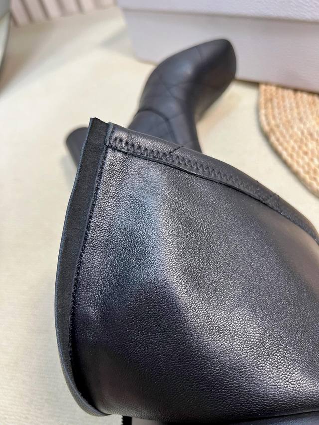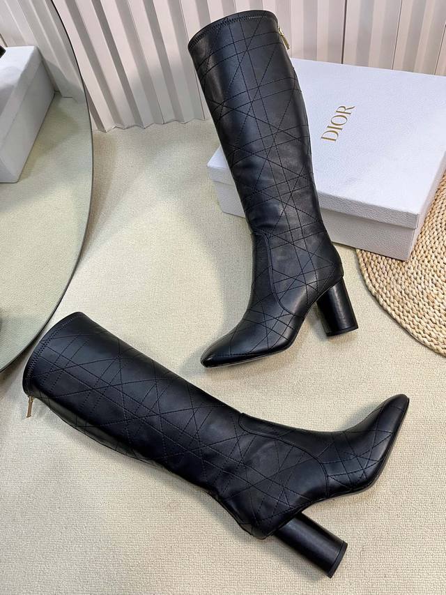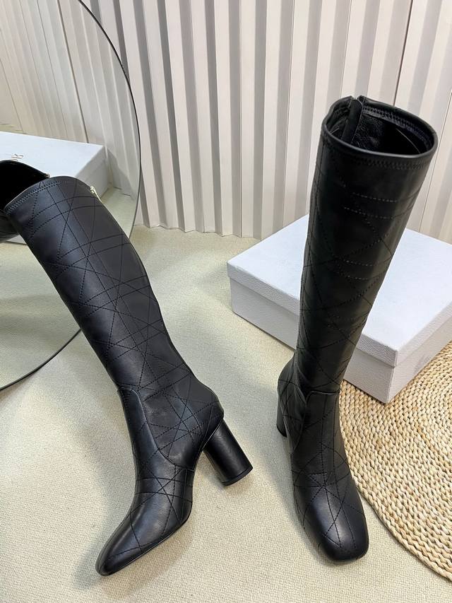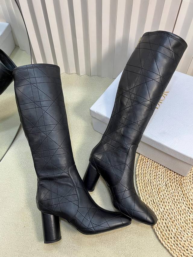 Dior Dior 25 autumn and winter new Belle-D punk style large rattan check pattern thick heel elastic high-top knight women's boots celebrity style Cd letter logo hardware buckle square toe, rear zipper low heel motorcycle boots