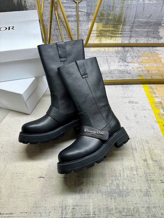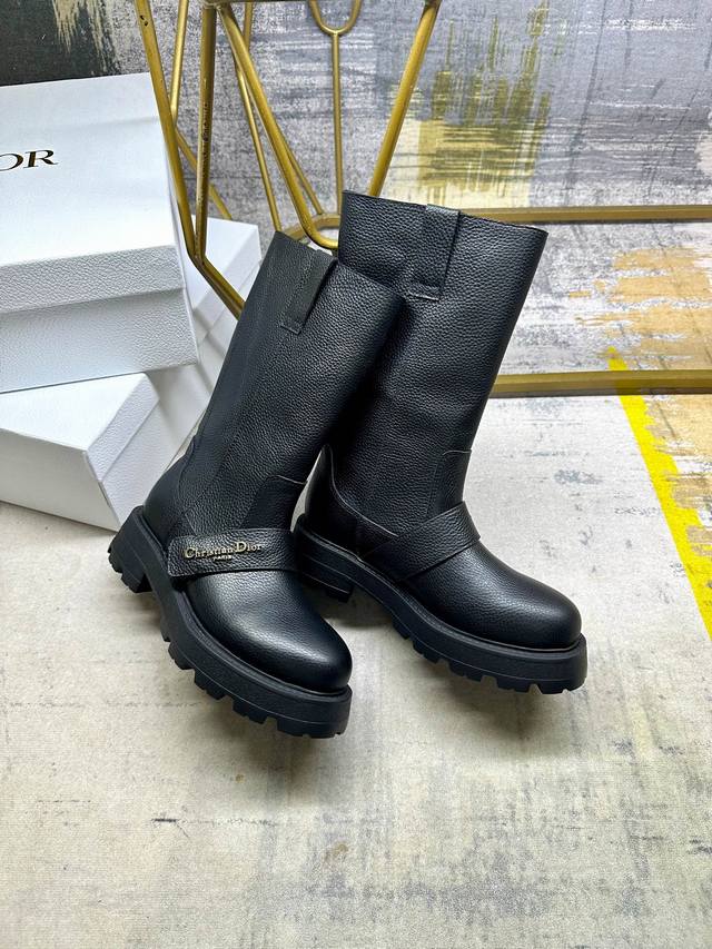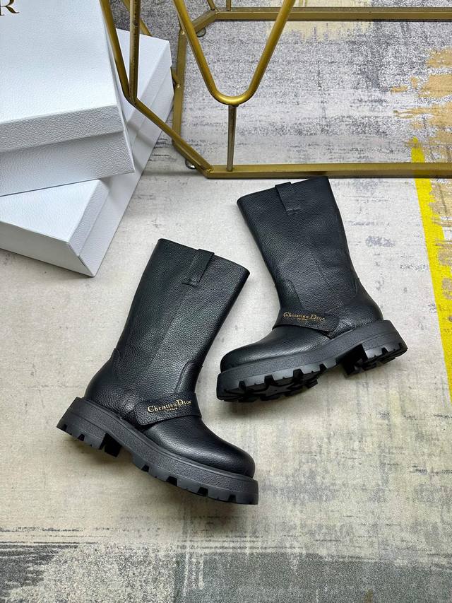 The d-Quest boots are a fresh take on Dior's haute couture style, crafted from black grained cowhide. They feature a straight-tube silhouette and a decorative front strap accented with a gold-finished metal logo. The thick yet lightweight notched rubber sole adds a touch of casual elegance. The boots are lined with sheepskin and come in sizes 35-42,