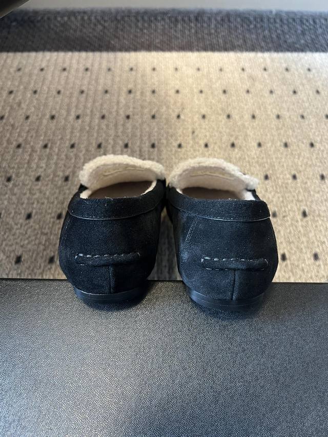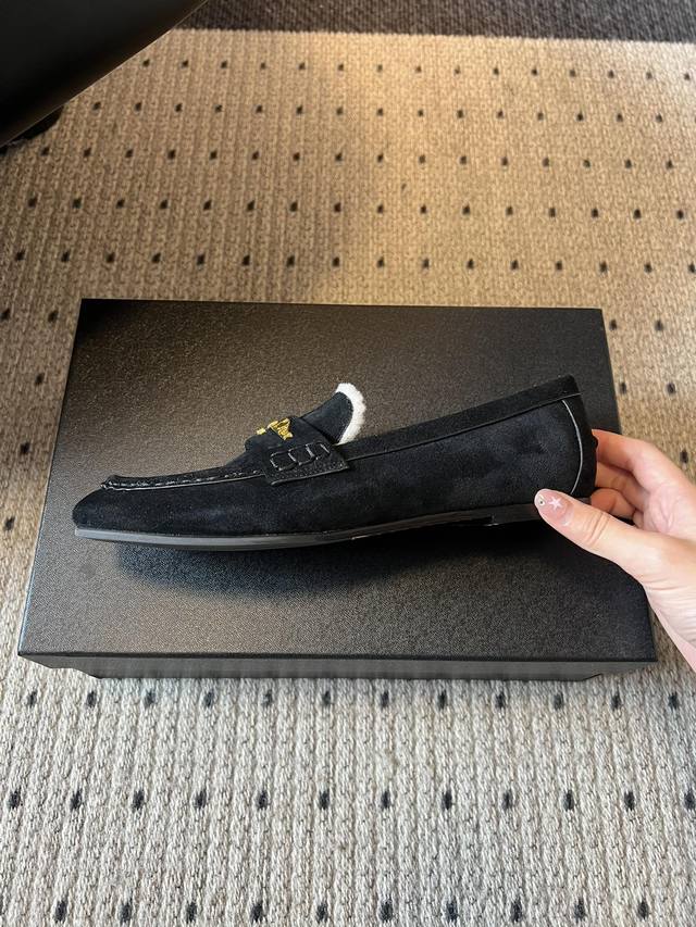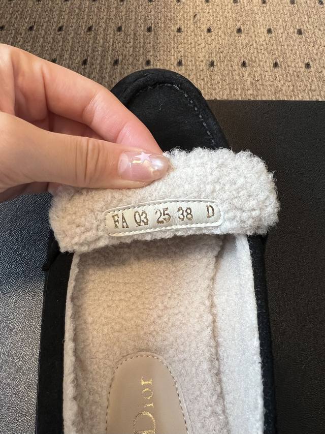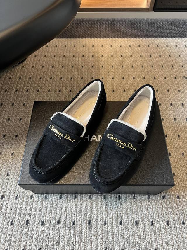 Top Quality Dior 25Ss Autumn/Winter New Style Fleece Loafers. The upper is made of suede, soft to the touch and with a retro feel. Fleece details at the collar and lining enhance warmth and add a touch of gentleness. The shoe is adorned with a gold "Christian Dior Paris" metal logo, showcasing brand recognition and understated luxury. Continuing the convenient slip-on loafer style, it combines casualness with elegance. The low-top, round-toe design accommodates various foot shapes, offering comfort and a sleek look. Pair with straight-leg jeans, light-colored casual pants, or knit wide-leg trousers. Upper: Nude Suede; Lining: Sheep Wool; Outsole: Genuine Leather; Size: 35-41