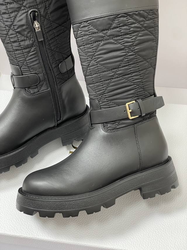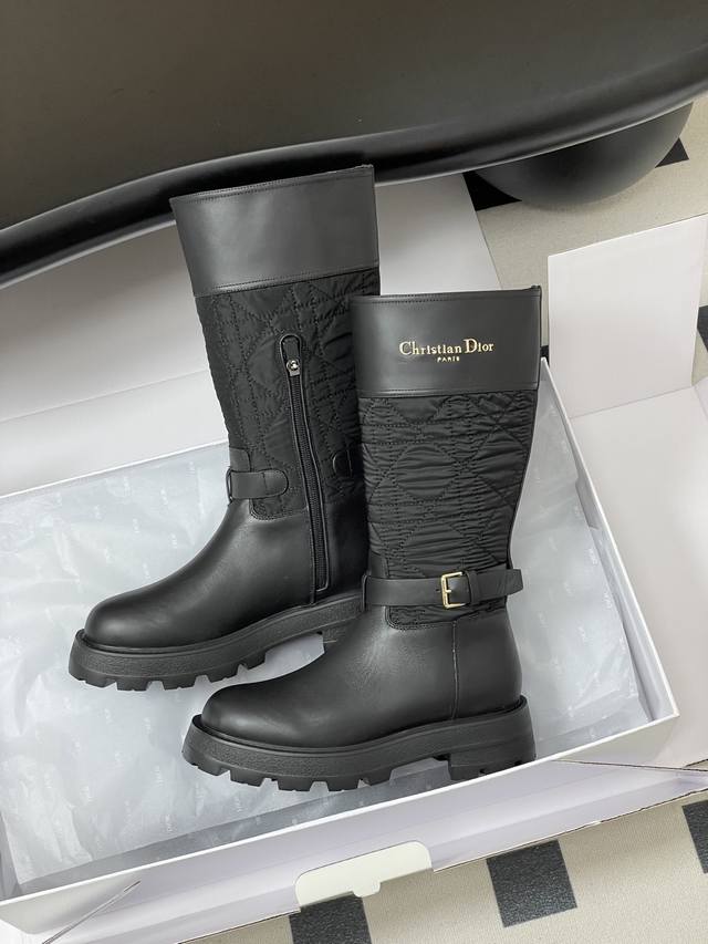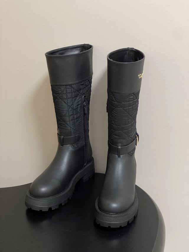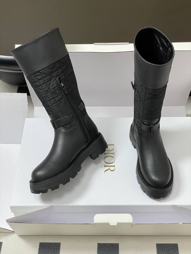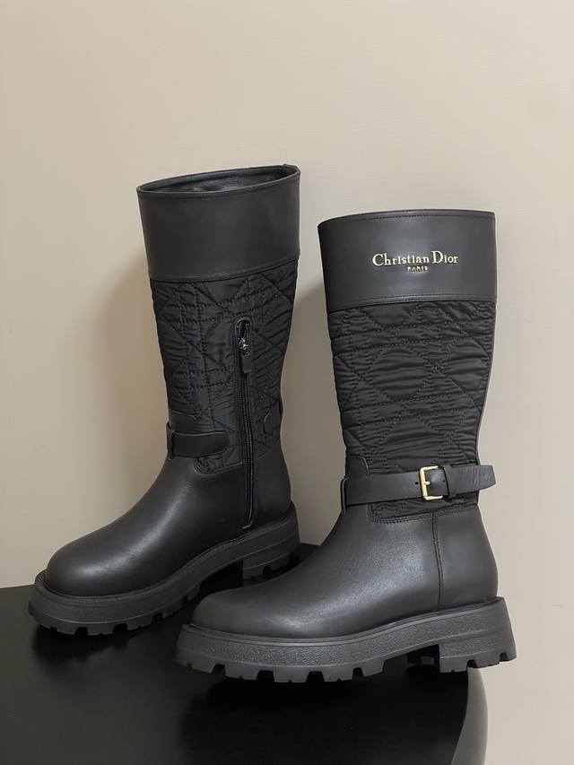 2025 Fall/Winter new Dior D-Town boots, black cowhide and nylon with cannage pattern embroidery, mid-calf knight boots, classic Cd monogram buckle fabric slip-on straight boots