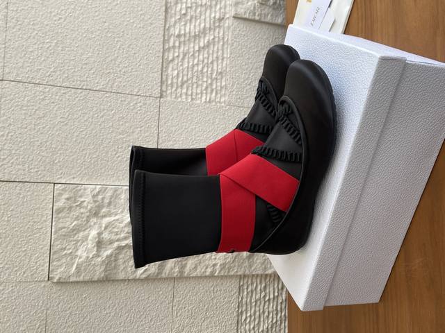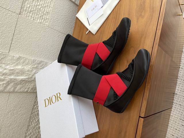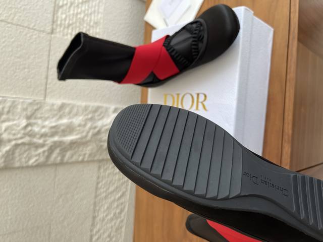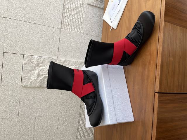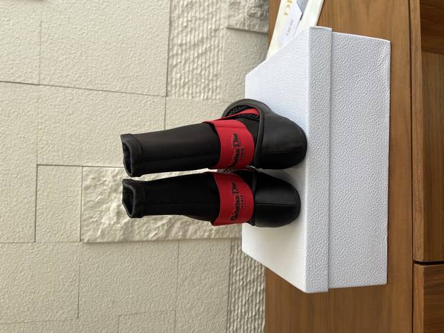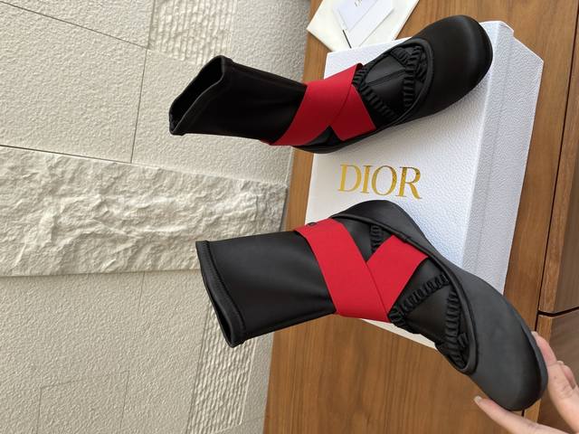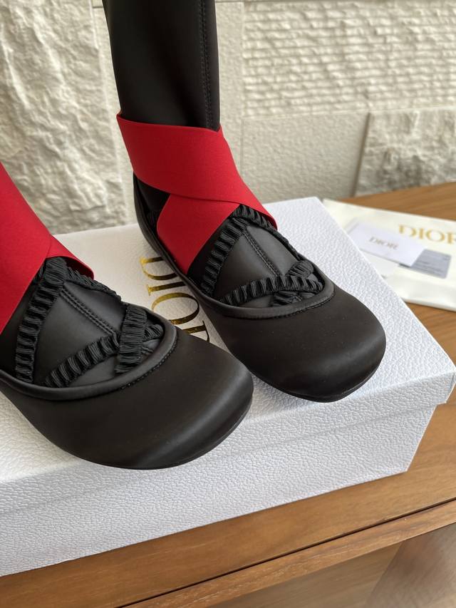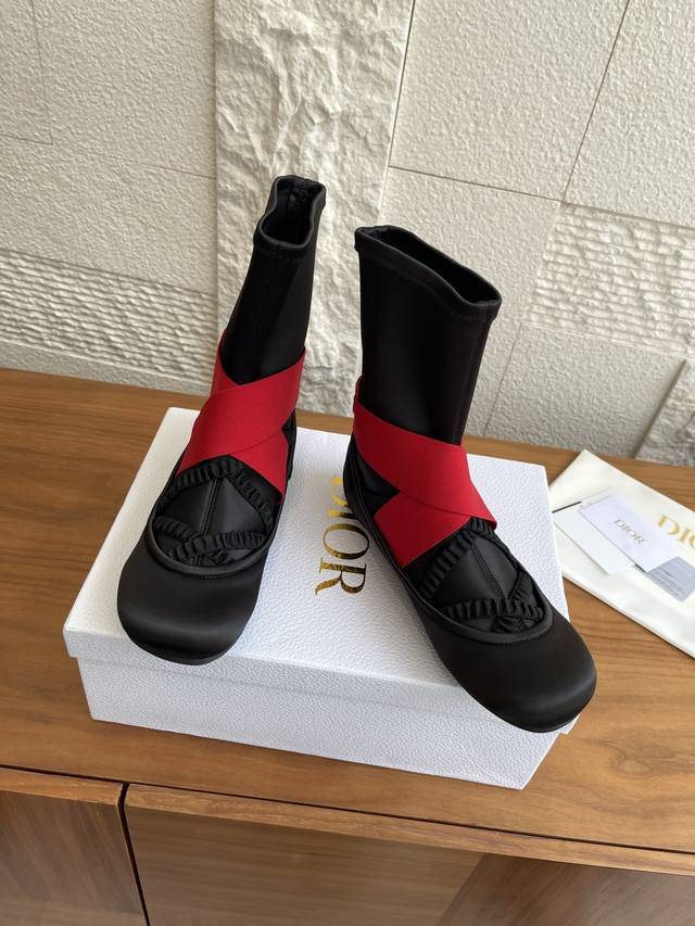 Top Version: Dior 2025 Autumn/Winter New Ballet Style Elastic Ankle Boots/Sock Boots. These Dior ballet flat sock boots are a new addition to the 2025 Autumn/Winter collection, boasting a haute couture look. The satin upper reveals a thin, tonal elastic band at the front, a feminine neckline, and a round toe, while a wide red crisscross elastic band adorns the ankle, and the heel is accented with a black rubber Christian Dior Paris logo. These comfortable ballet flats feature a black notched rubber sole, adding a touch of Dior style to your outfits for all seasons. Material: Imported silk satin, imported calfskin. Lining: Imported sheepskin. Outsole: Original molded TPU outsole. Size: 35-41, 40-41 (Made to order, no returns or exchanges).