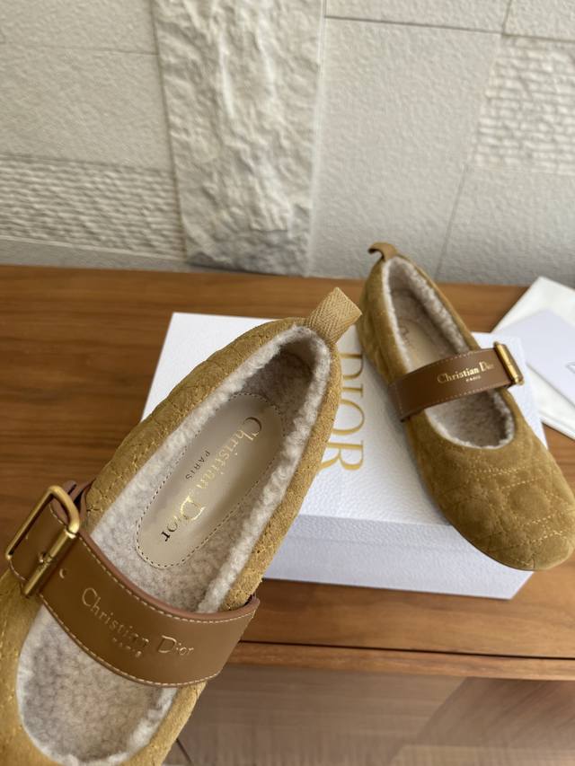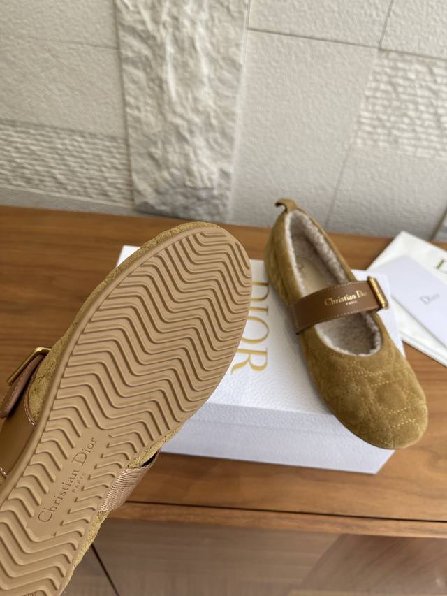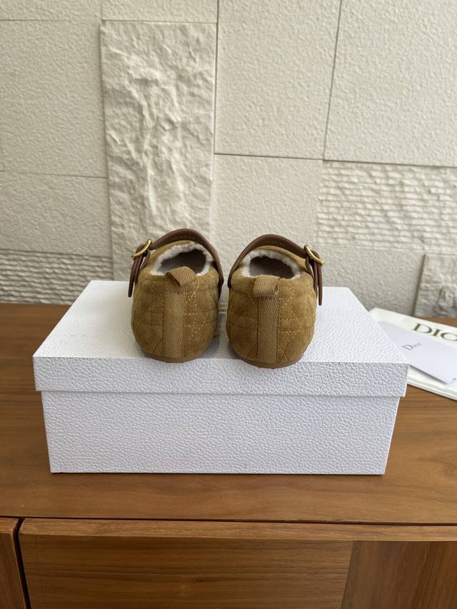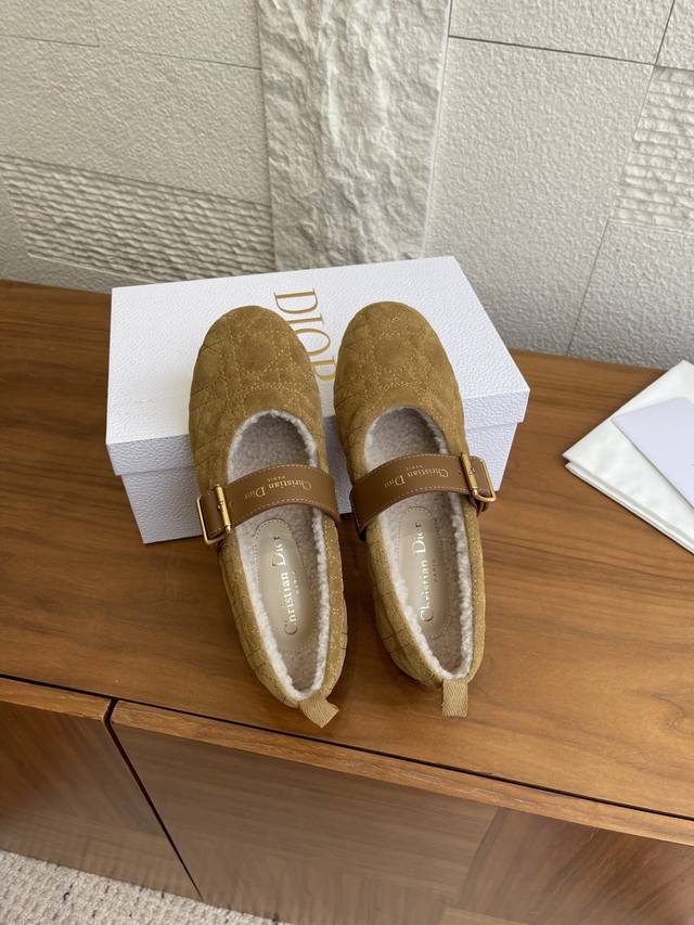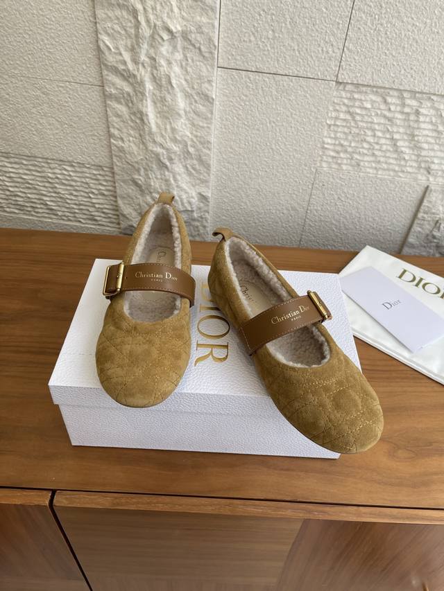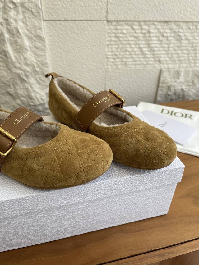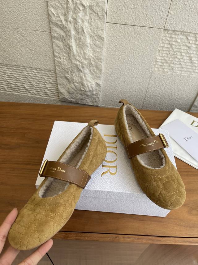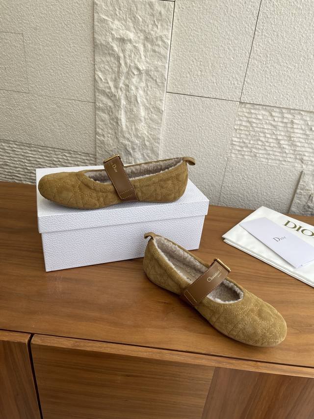 Top Version: DDD Dior 2025 Fall/Winter New Dioralps Series Cannage Dior Frost Ballet Flats DDD These Dior Frost ballet flats are from the Dioralps limited edition collection, elegant and comfortable. The black suede cowhide upper is decorated with a cannage pattern, while the white sheepskin shearling lining creates a comfortable wearing experience. The adjustable black cowhide strap is adorned with a gold-finished Christian Dior Paris logo buckle, and the notched rubber sole adds a touch of sophistication. They can be paired with other Dioralps items. DDD Material: Imported suede DDD Lining: Sheep wool DDD Outsole: Original molded rubber outsole DDD Size: 35-41 40 41 Custom orders are non-refundable DDD