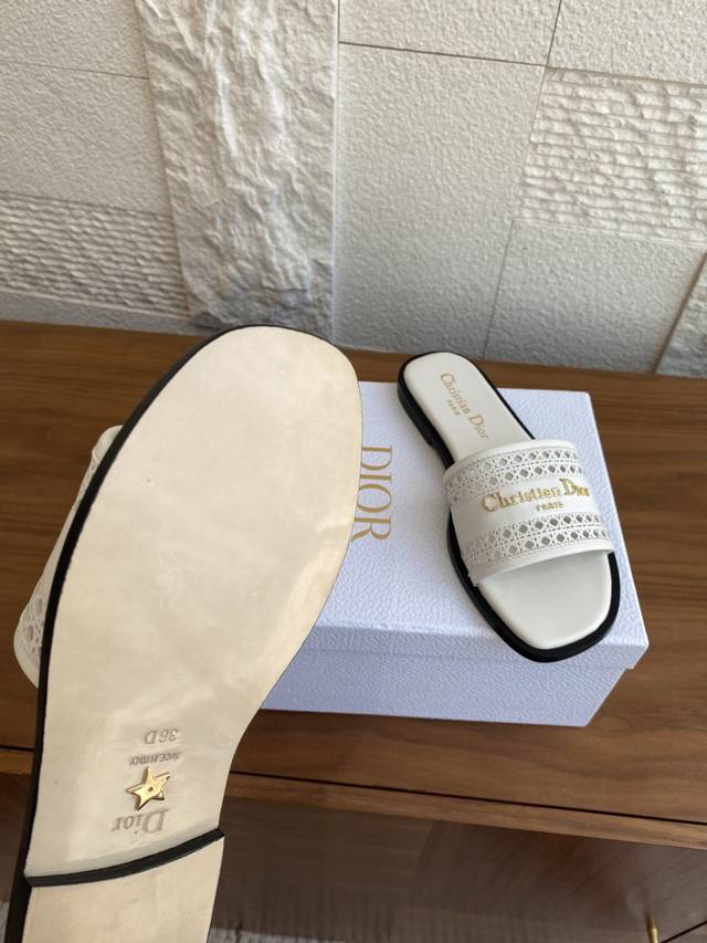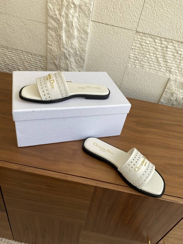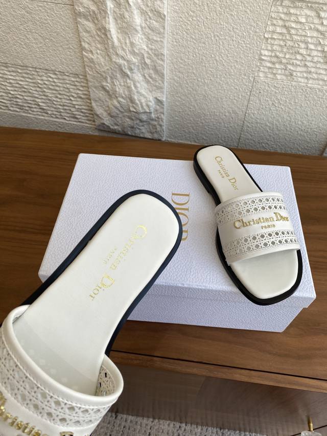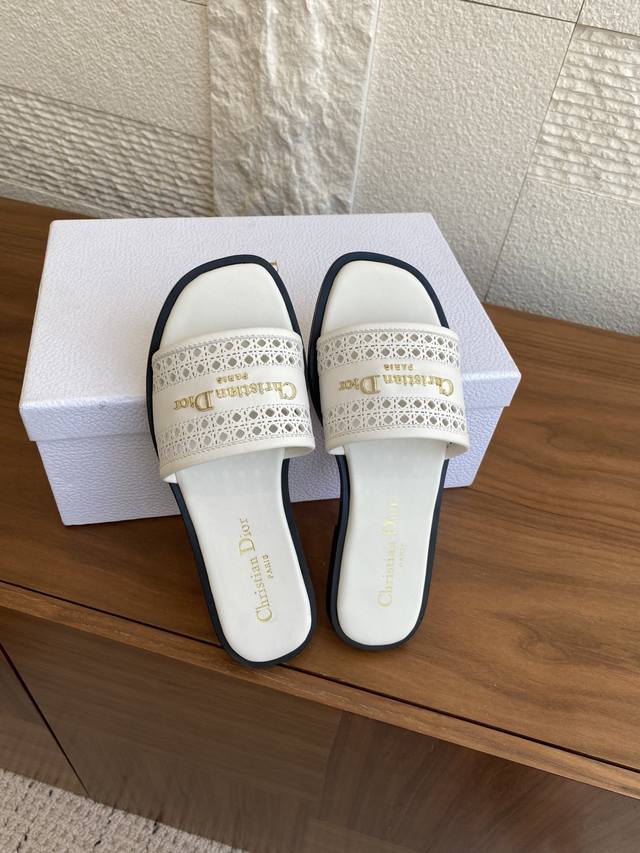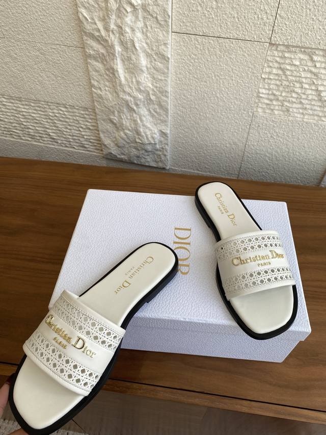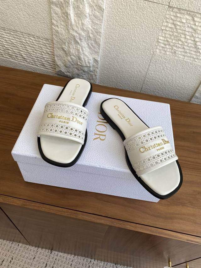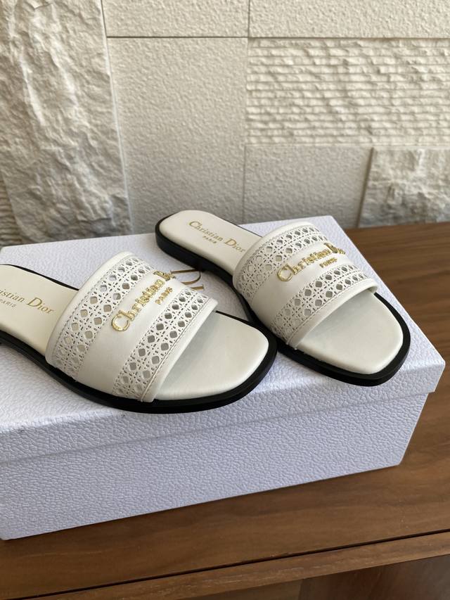 Top Version: Dior 2025 Spring/Summer New Cd Logo Hardware Hollow-out Cannage Pattern Slippers. These D-Lane sandals exude classic style. The black calfskin upper showcases a hollowed-out cannage pattern, adorned with a gold-plated Christian Dior Paris logo, showcasing a fashionable flair. The padded insole provides a comfortable wearing experience, and the simple design makes them easy to slip on and off, creating a casual look. Material: Imported calfskin; Lining/Insole: Water-resistant sheepskin; Outsole: Italian imported genuine leather. Size: 34-41 (34, 40, 41 are custom-made and non-refundable) .