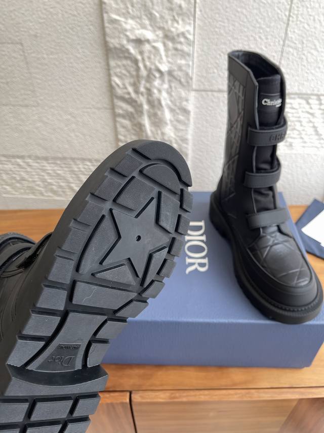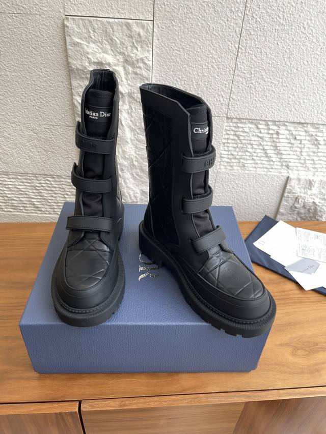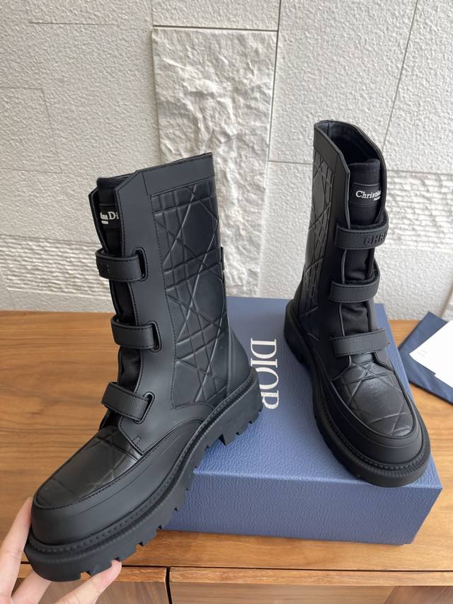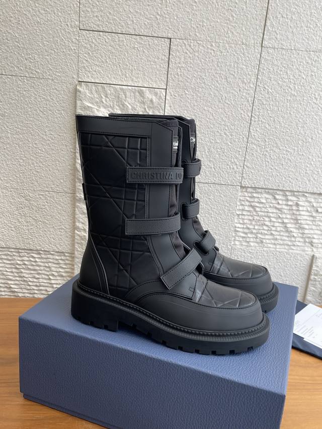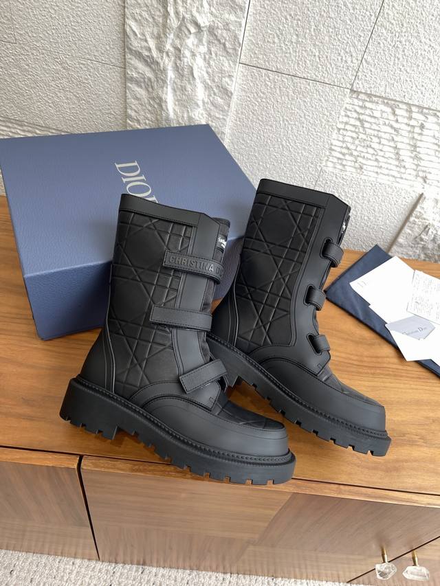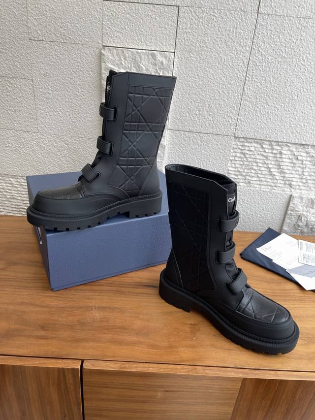 Top Version: Dior Classic Upgrade Dio R Evolution Series Cannage Lace-up Velcro Ankle Boots. These Dior ankle boots reinterpret a high-fashion style with a touch of couture. The black rubber upper is adorned with panels, while the beige and black Oblique printed tongue elevates the overall look. The thick, tonal notched rubber sole is decorated with the Dior logo, creating a striking and sophisticated style. Material: Original custom cowhide, original molded rubber upper. Lining: Imported sheepskin, imported wool lining. Outsole: Original molded rubber outsole. Size: 35-41, 40, 41. Custom orders are non-refundable .